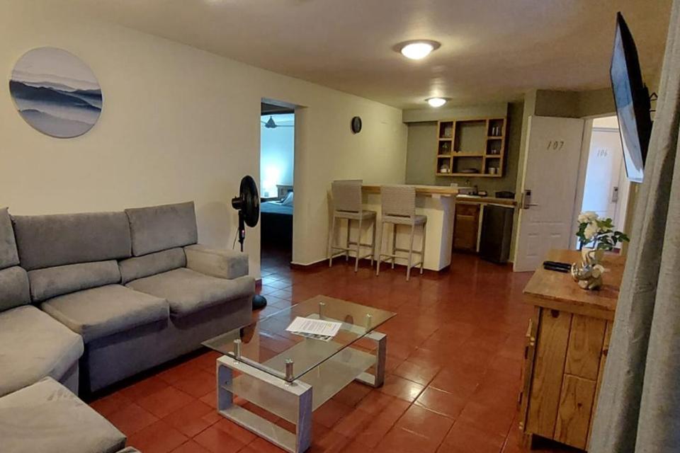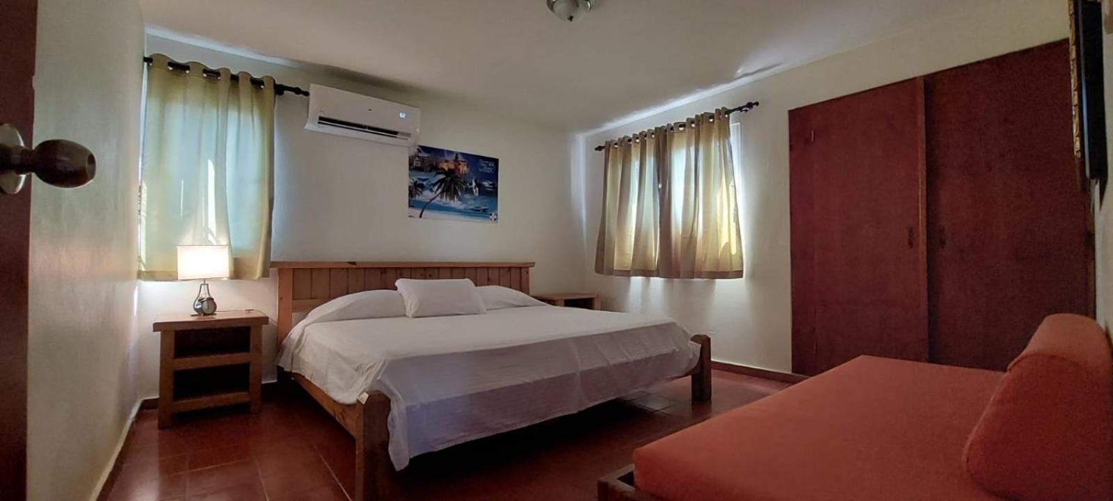 Cozy Wood-Furnished Rooms: Hotel Don Andres offers comfortable rooms with seating and dining areas, perfect for relaxation after a day at the beach. Each room is equipped with a refrigerator and a fan for your convenience.
