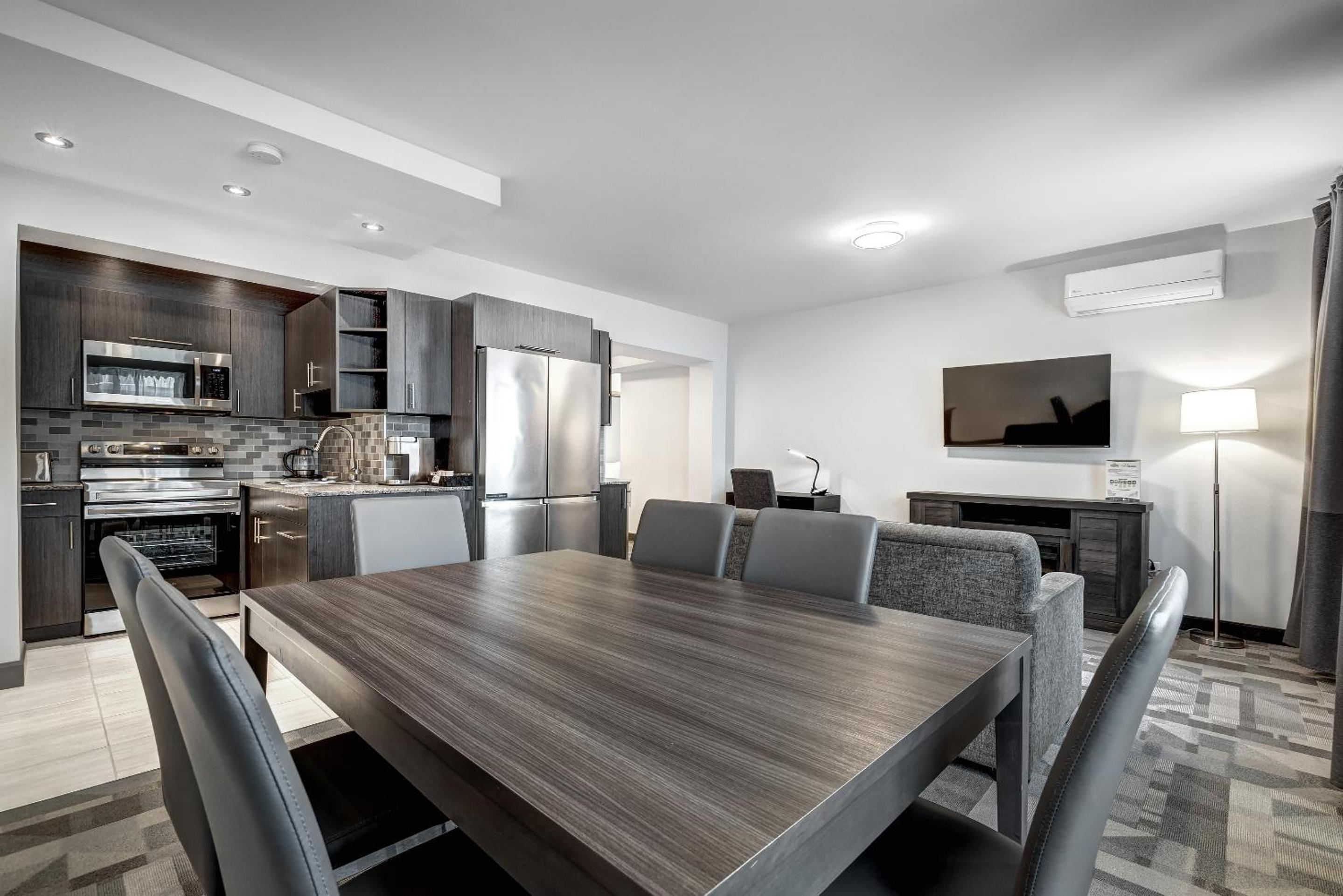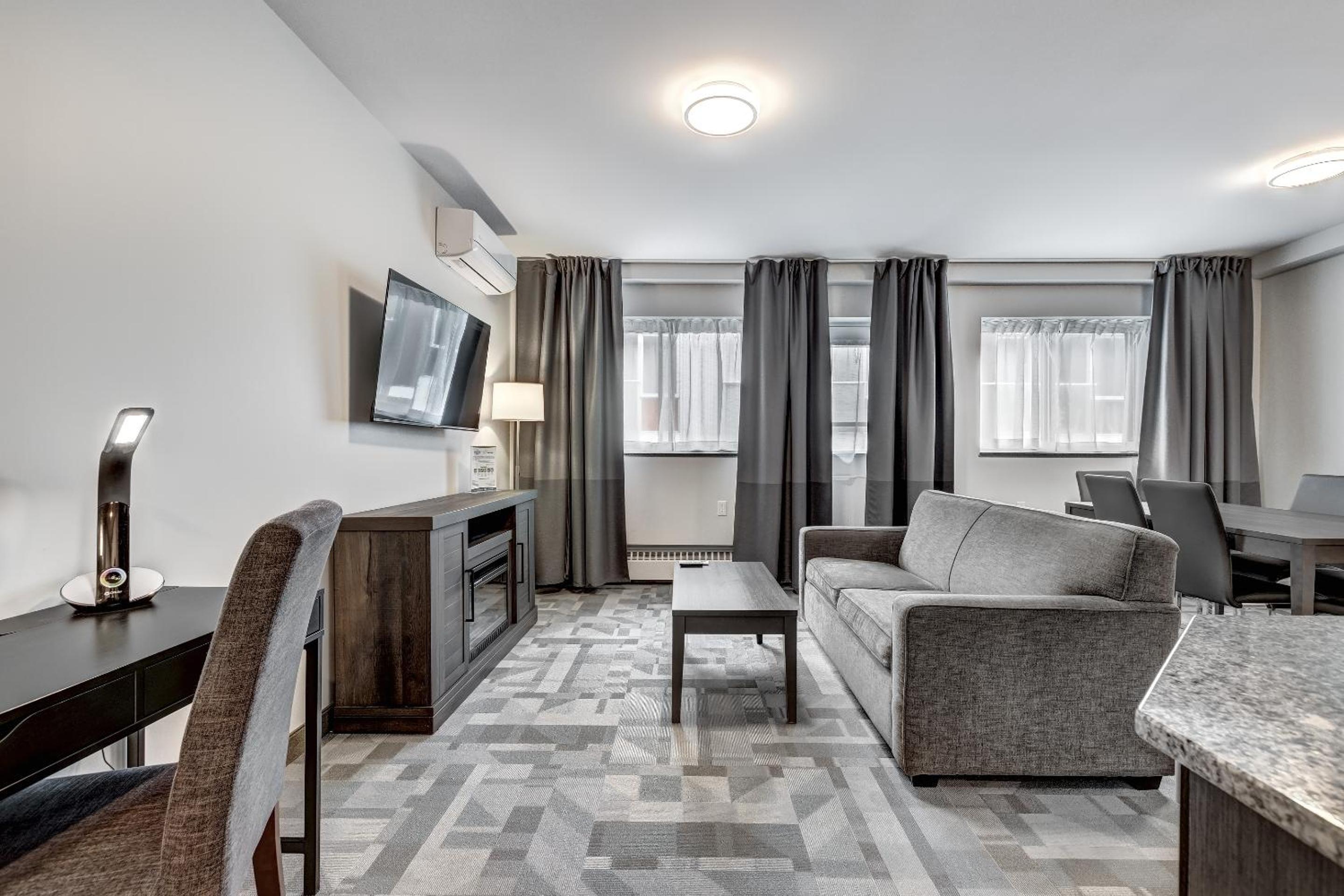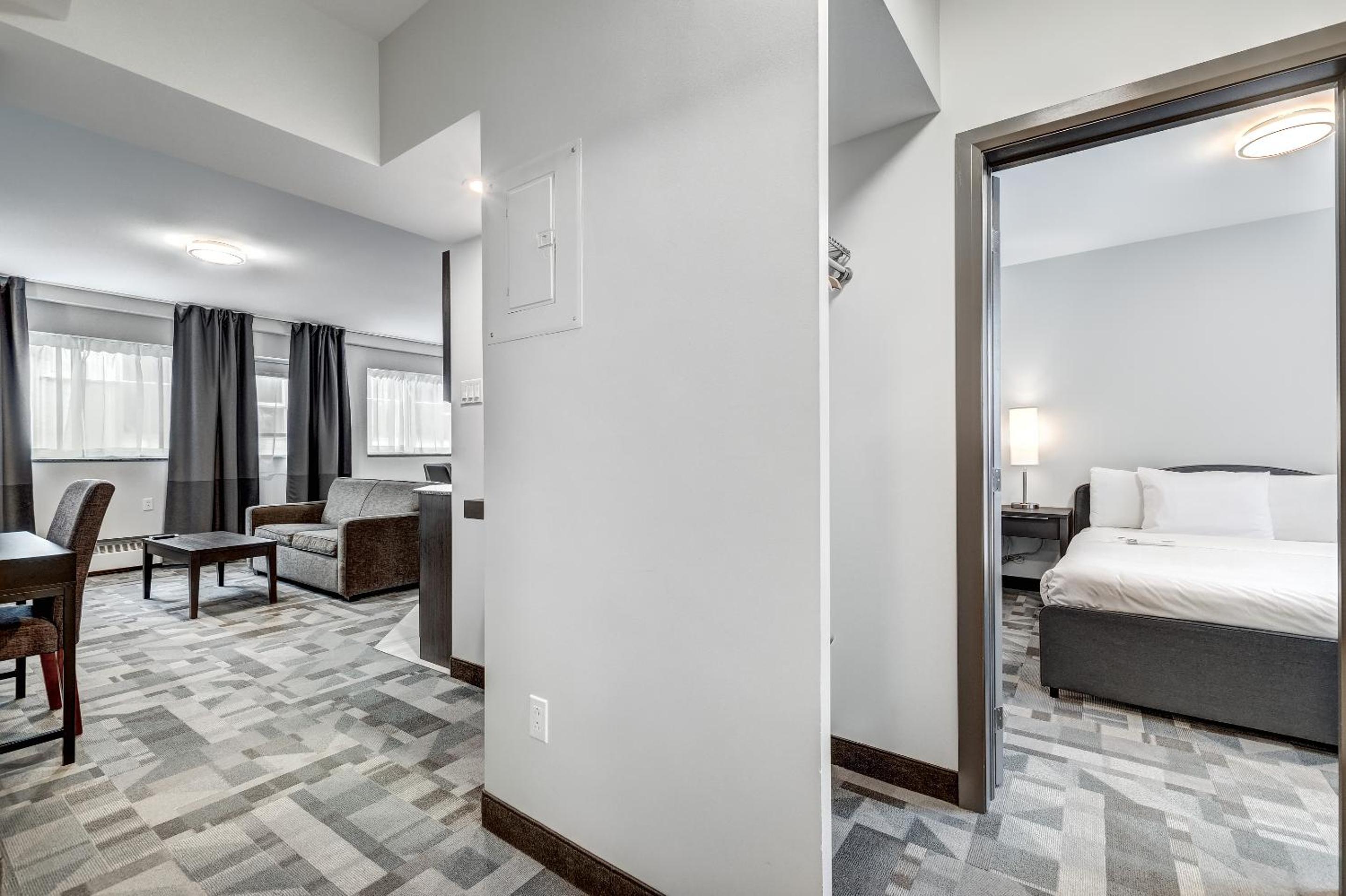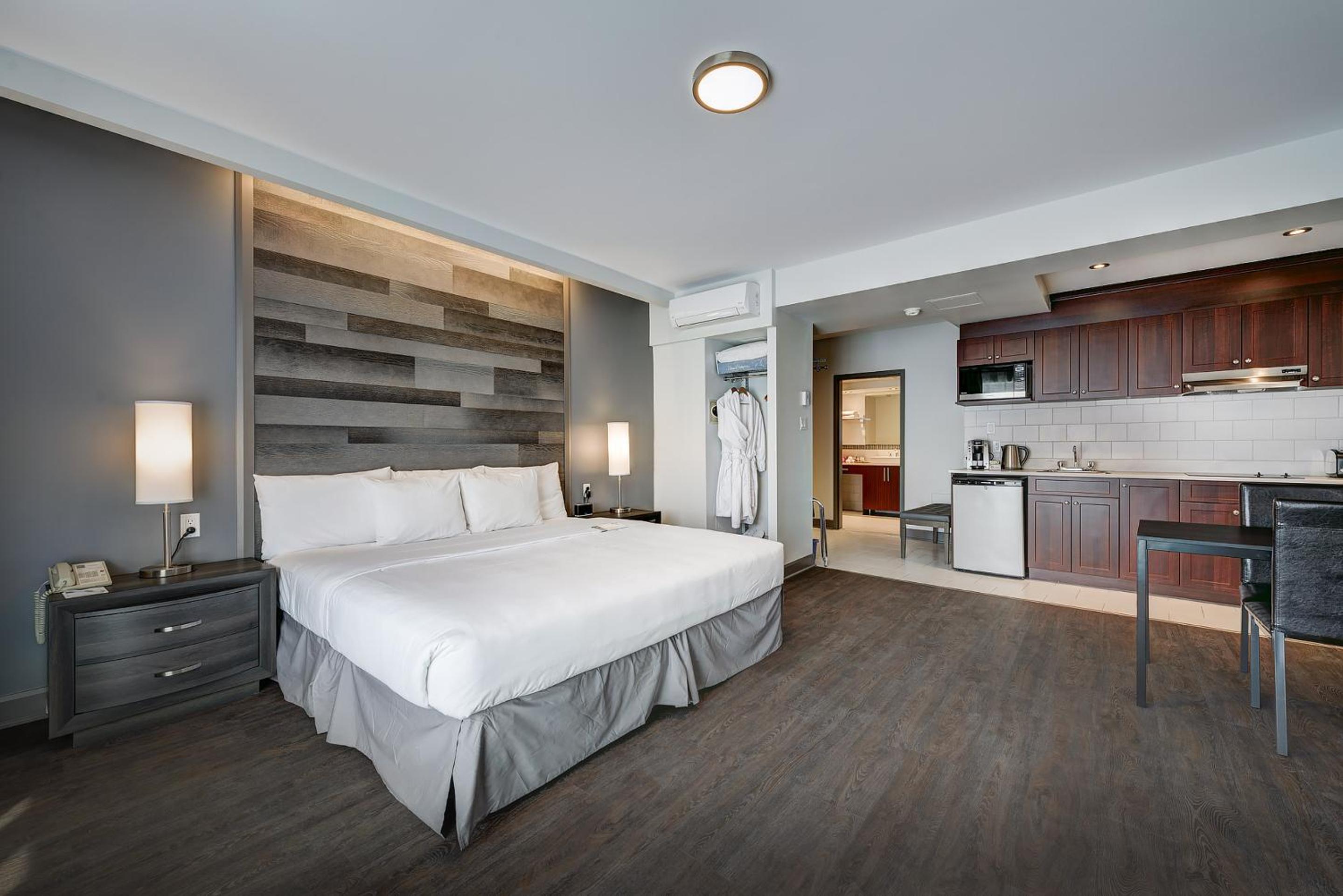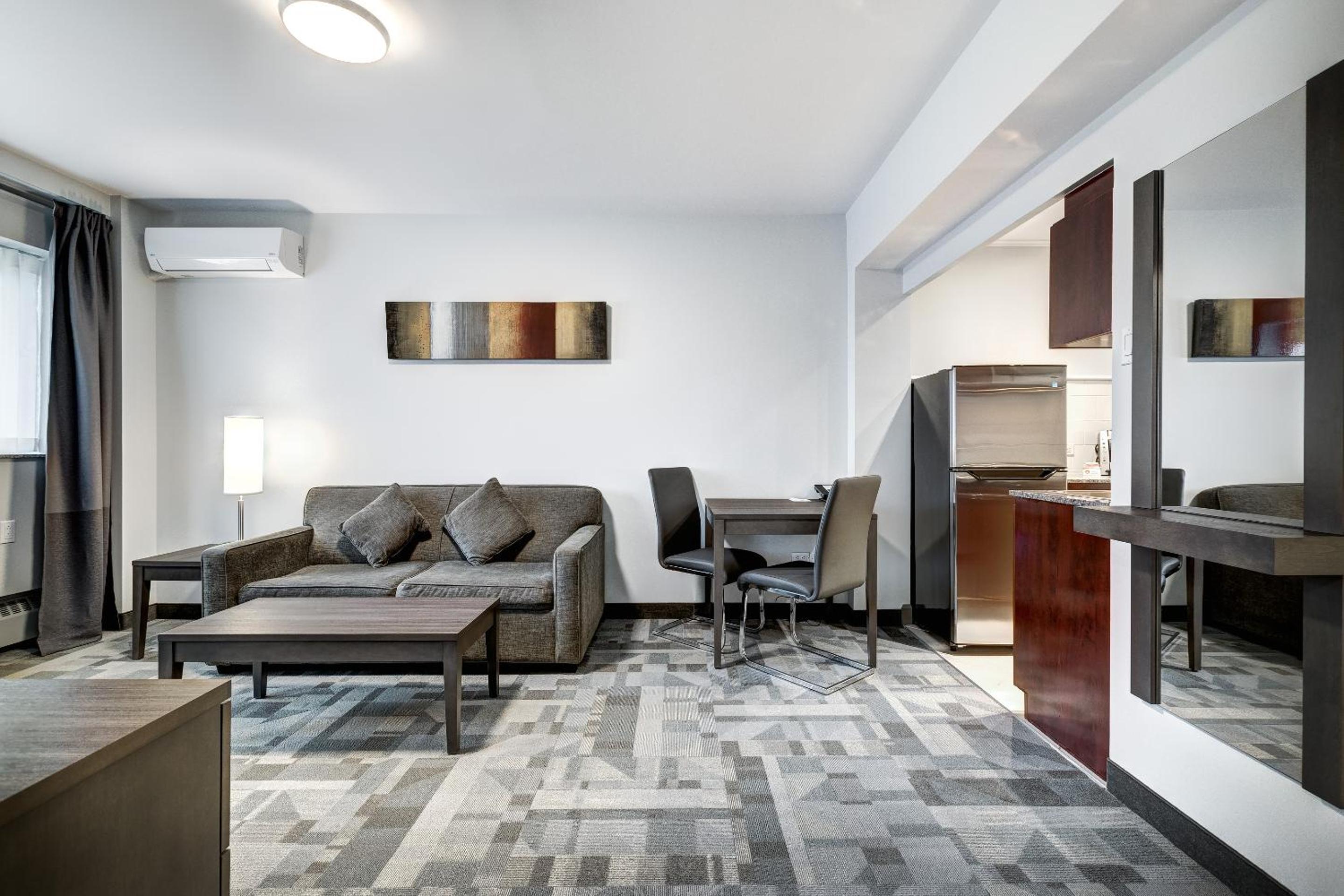 Fantastic hotel. Withing a few steps of the Metro (blue line). You can easily reach downtown and old Montreal within 25 minutes. The king suite we had worked great with our 8 month old baby to have a separate space for early bed. The kitchenette was great and had everything we needed for quick meals at the hotel. There was a crib provided for our baby which was a nice touch. There are lots of food options around the hotel, but mostly quick fast food, not a lot of sit down full restaurants. Overall fantastic experience and would recommend to others.