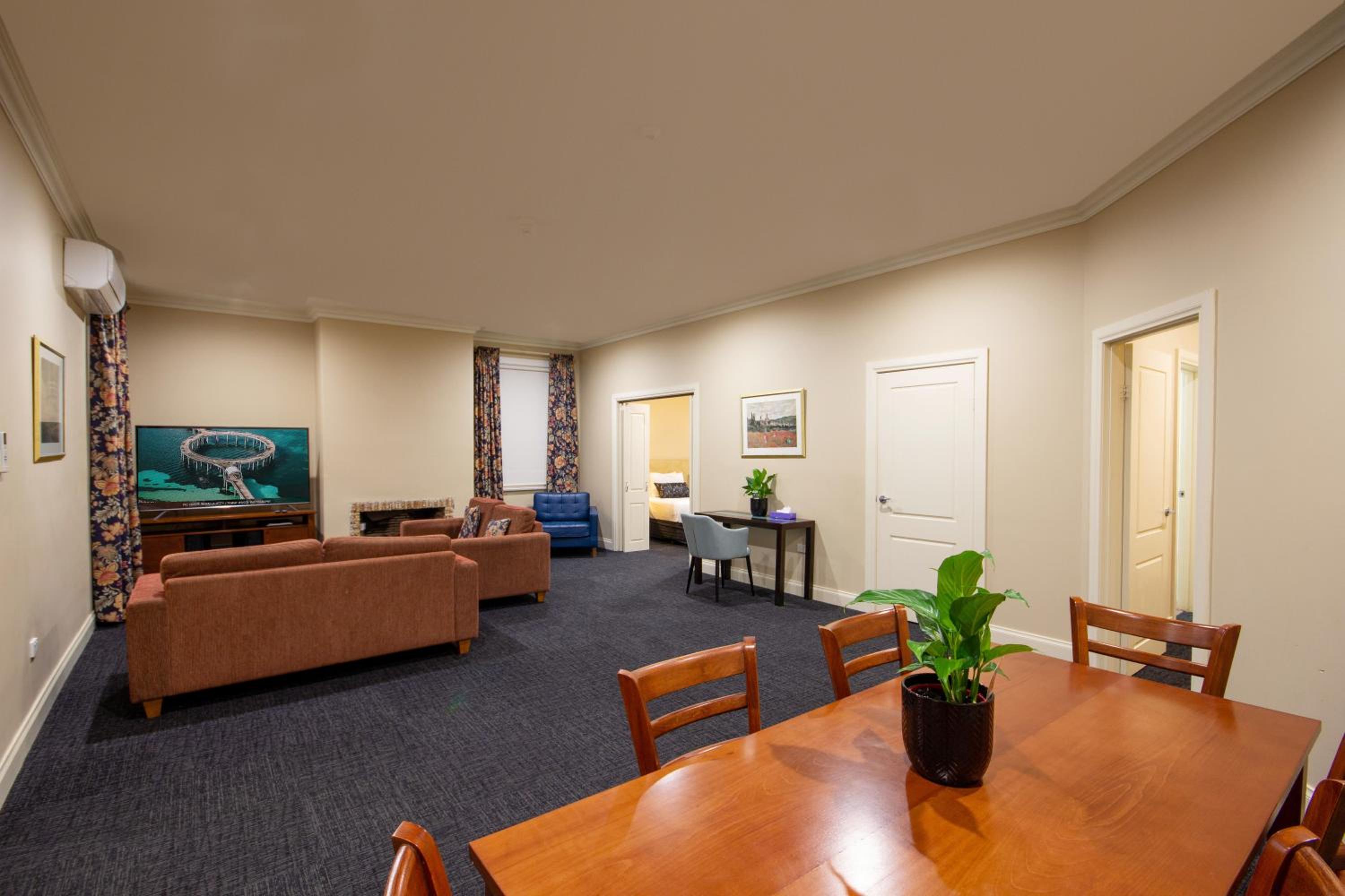 Apartment 14 - separate lounge & kitchen, off-street parking, wrap-around verandah access, walking distance to pubs for dining (we didn’t bother using the equipped kitchen for our short stay), good security, elevator access available, luxury treats, pod coffee, bath salts for giant tub👏👏👏. Key safe system, swipe card access, security doors, lots of extra lounging spaces, and the historic building full of charm but very modern interiors.