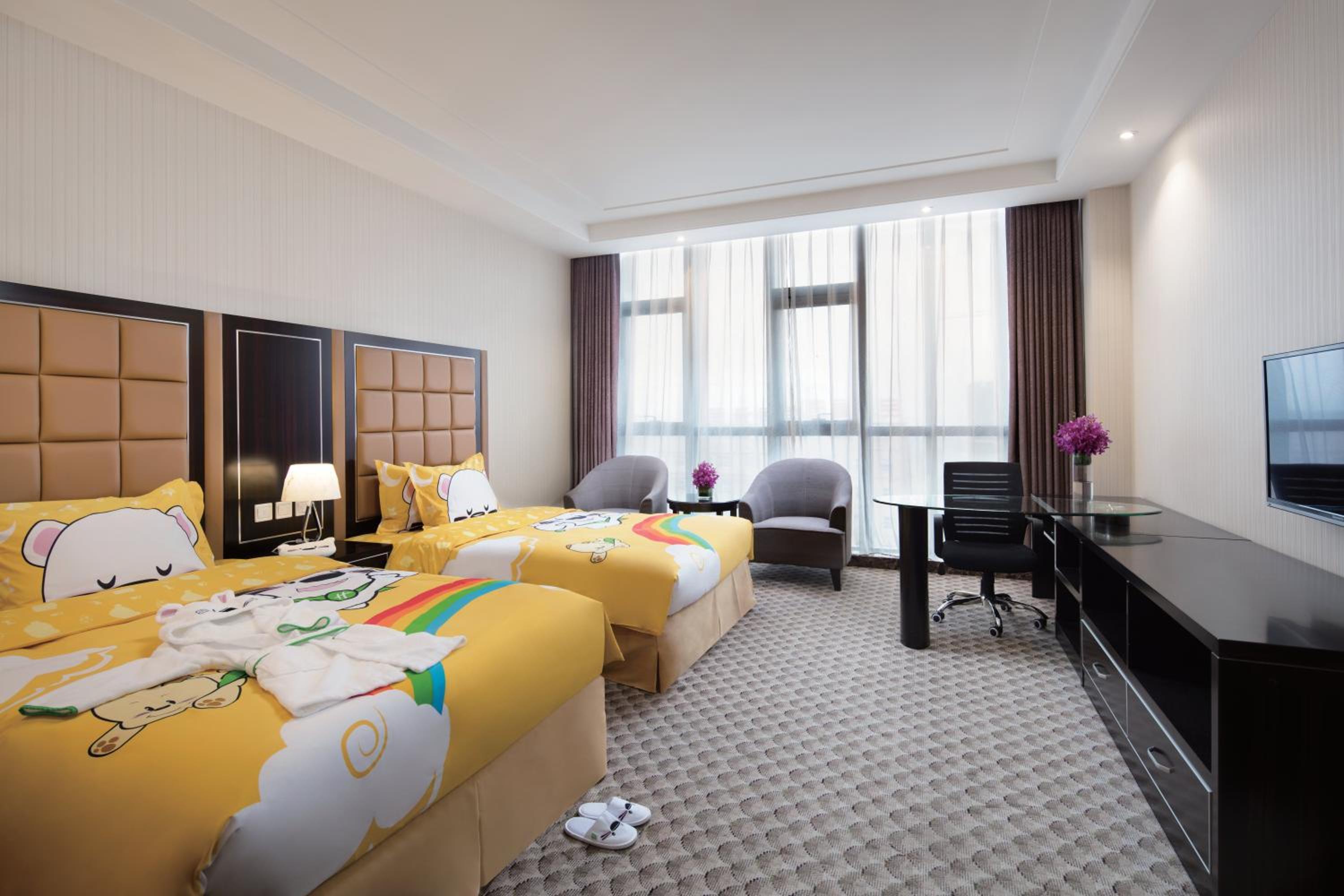 Holiday Inn Beijing Airport Zone offers classic guestrooms with free WiFi, featuring shades of light beige and dark chocolate. Each unit is equipped with essential amenities like a flat-screen cable TV, a safety deposit box, and a work desk.