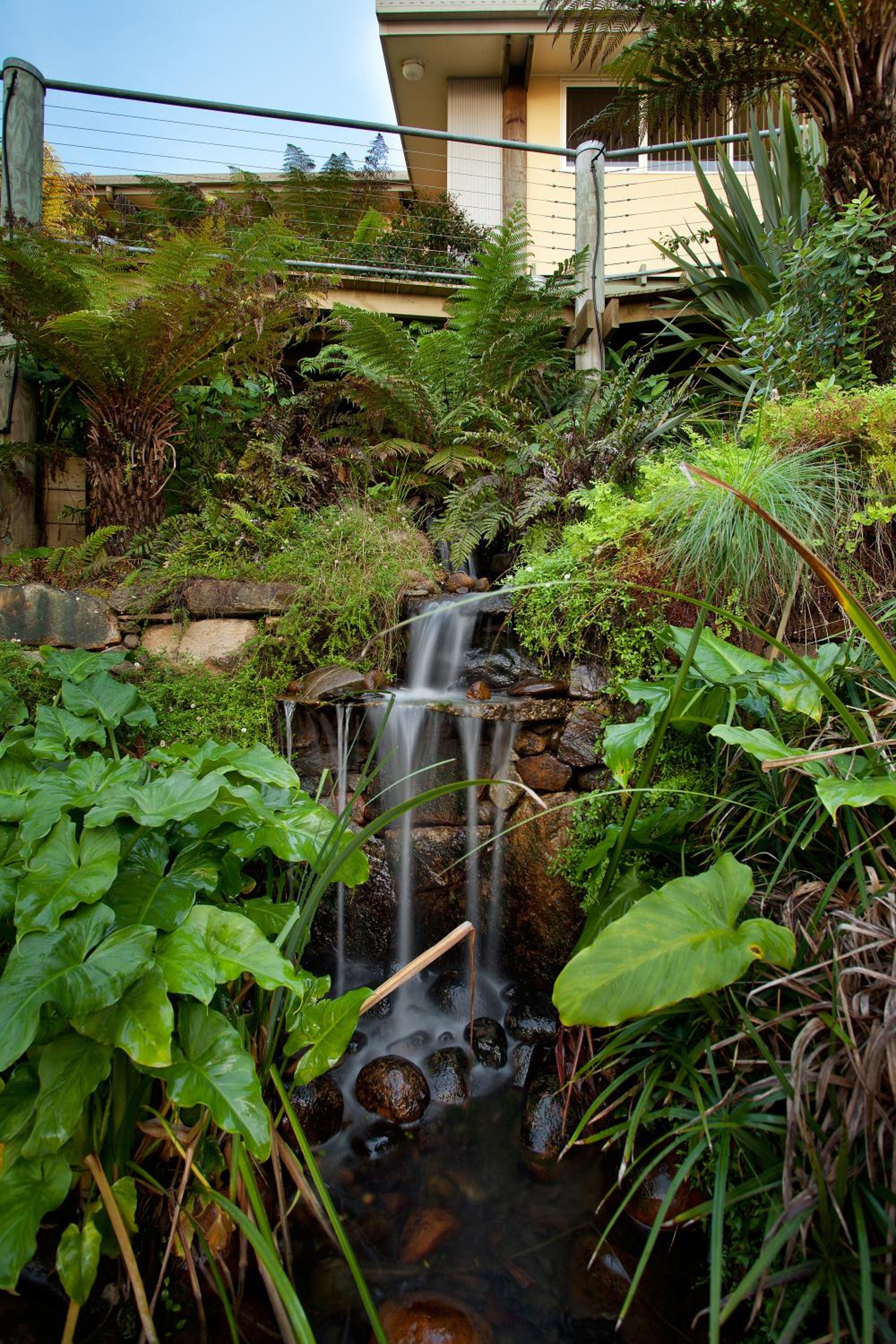 Tathra Beach House offers a prime location directly opposite the famous surf beach, surrounded by landscaped grounds and water features.