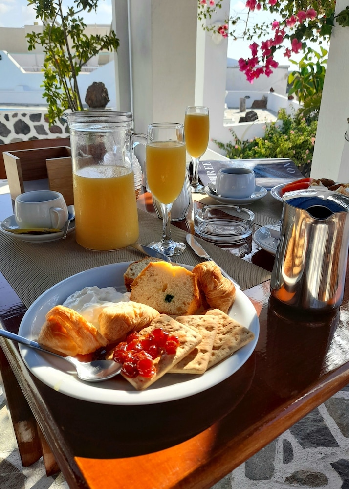 The breakfast was filling enough to give you a good start to the day. The room was clean and spacious with plenty of clothing storage and the bathroom was simple and clean. We had a patio with chairs, TV, hairdryer. It would have been nice to have a kettle. Eileen was very welcoming and polite. We were late arriving - past 1am in the morning but we were still welcomed with enthusiasm. We would book this hotel again. The buses are only EUR2 to Fira and run every half hour. Akrotiri is a very quiet town with one main road, it's a real escape from the busier towns but has its own charm.
