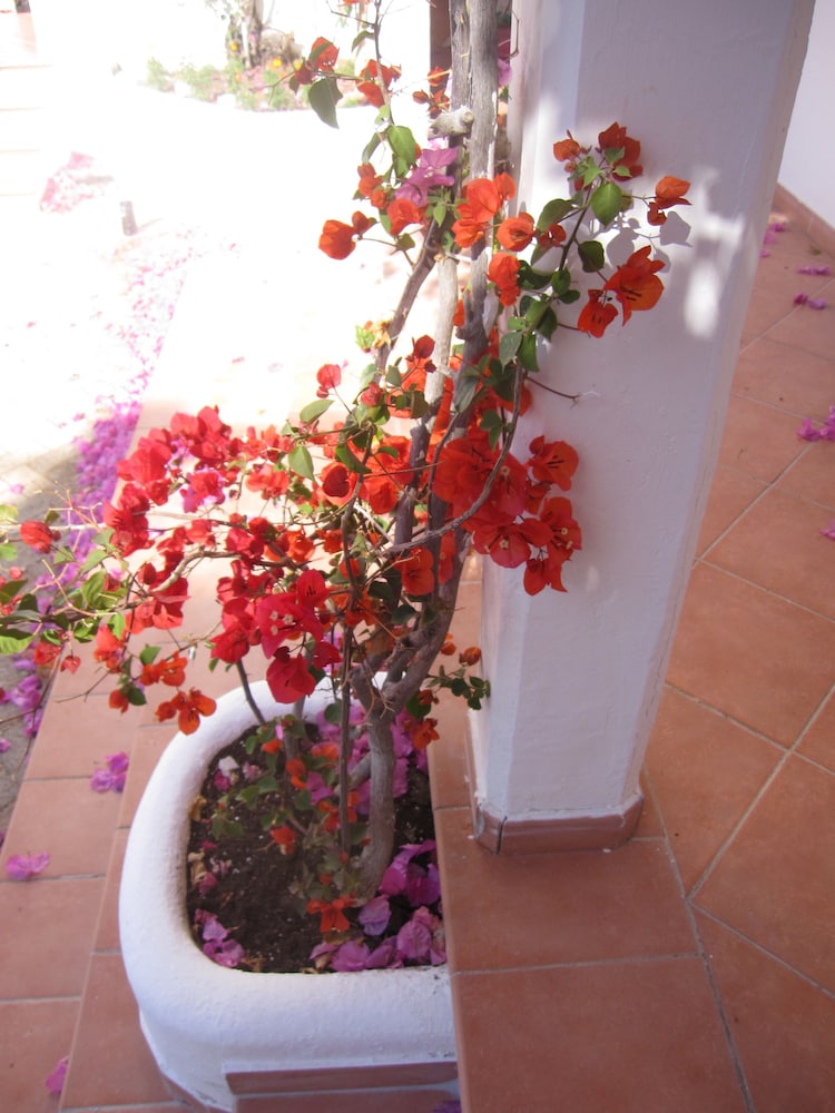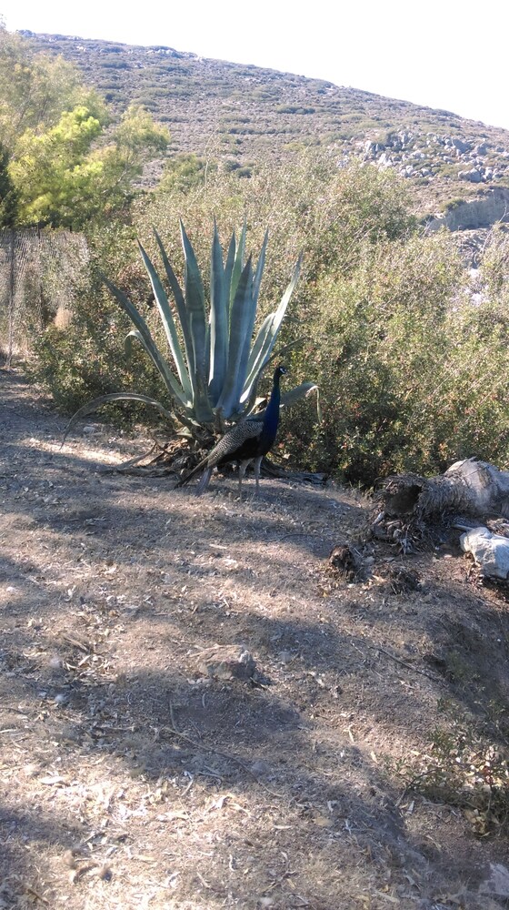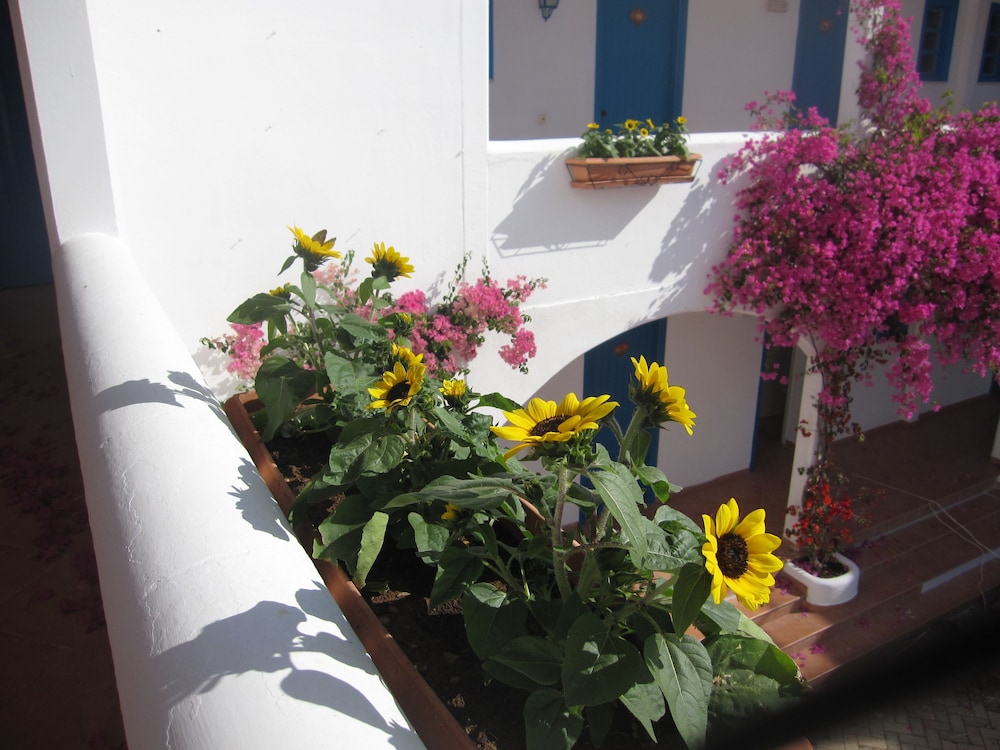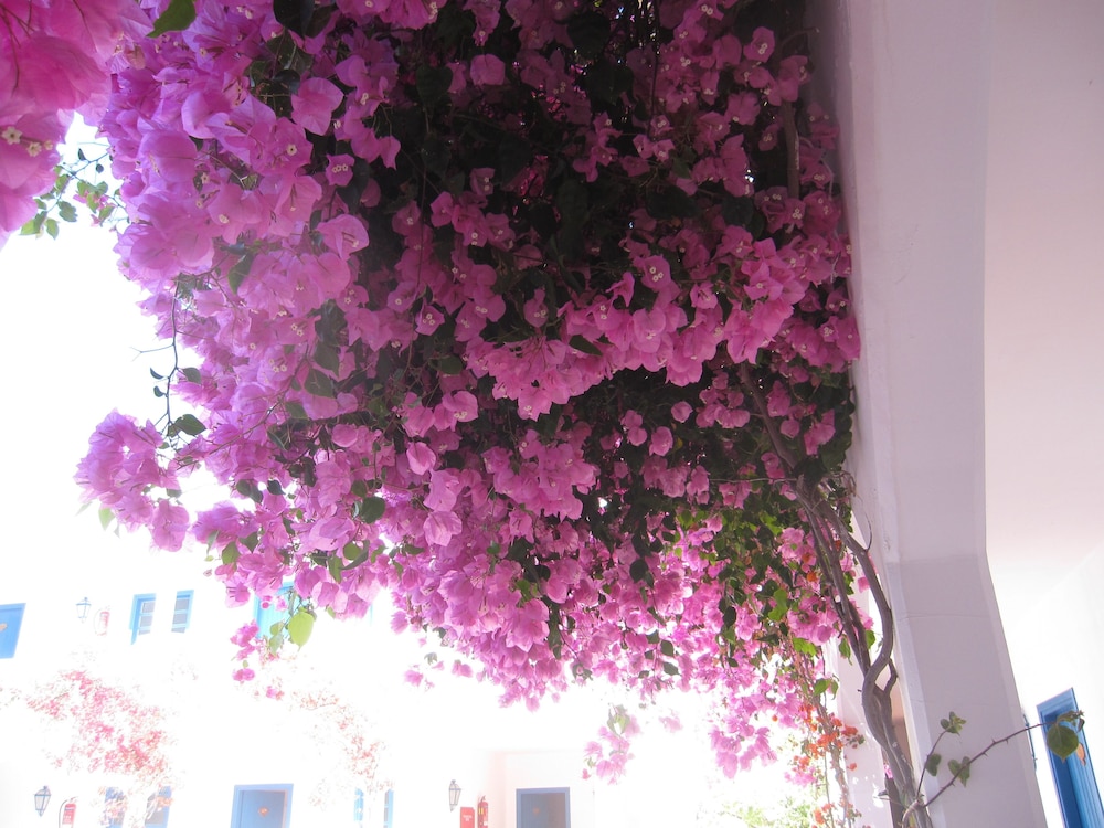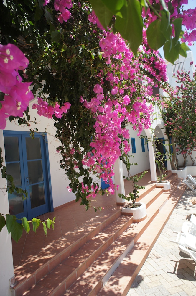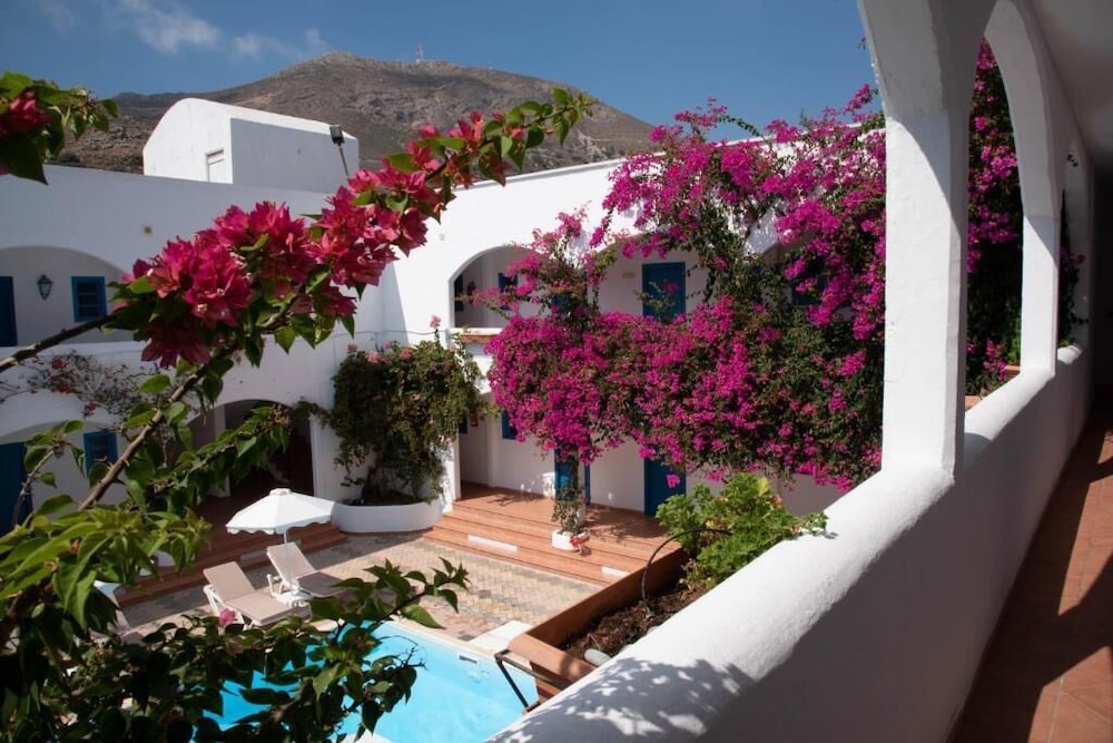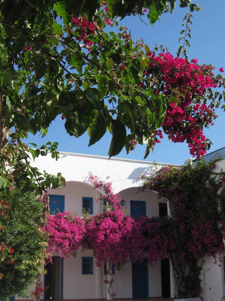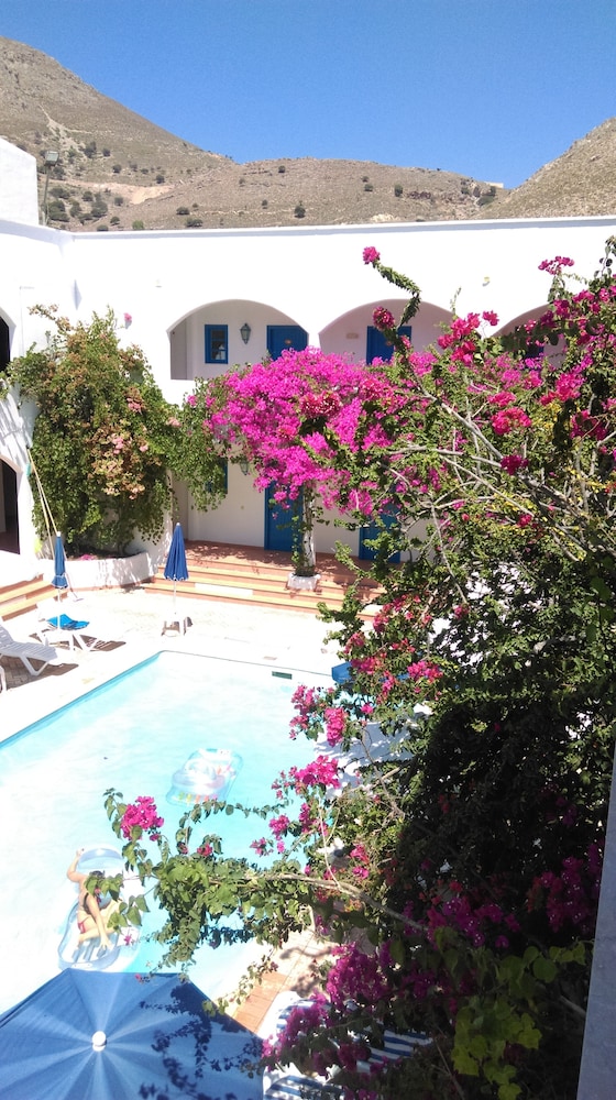 Vår önskan var att hitta ett litet hotell på Tilos med pool. Även om det är gångavstånd ner till den fina klapperstensstranden i Livadia är det skönt att ha en pool att svalka sig i. På hotellet jobbar endast tre personer, vilket kan vara rimligt med tanke på att det inte var så hög beläggning. Damen som städade och fixade lite annat smått och gott, poolskötaren som även med ett leende lagade omelett åt oss alla och så receptionisten som skötte allt annat och gärna tog sig en liten pratstund, kom med goda råd och gärna ville ta del av våra upplevelser. En överraskning var att de tog emot oss nere vid hamnen vid ankomsten och körde upp våra resväskor. Hotellet, cirka tjugo år gammalt, är rent fräscht och mycket prisvärt.