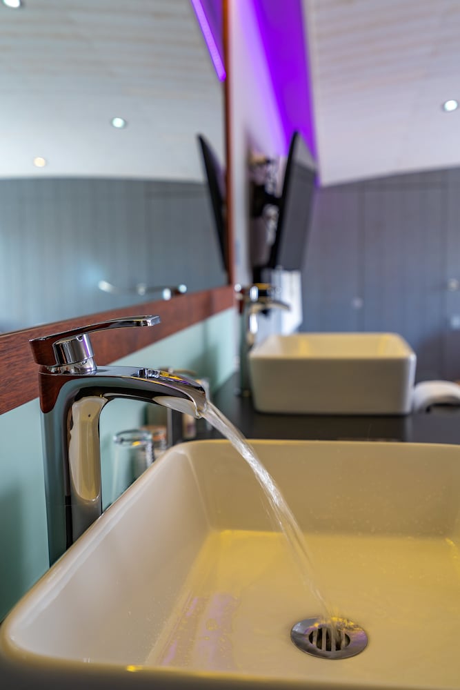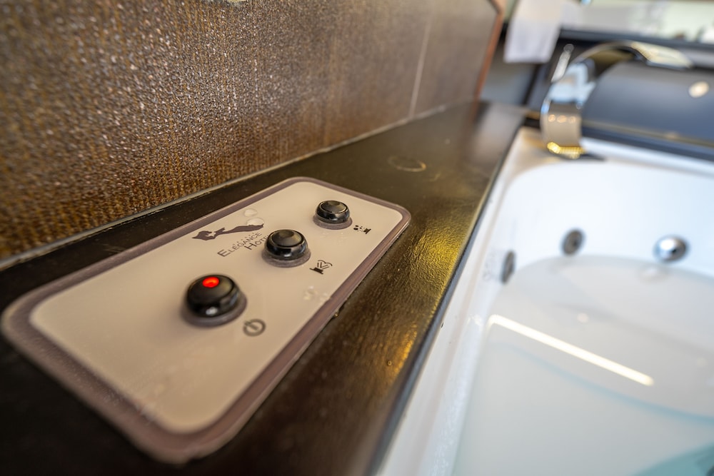 We "splurged" on this hotel and therefore had expectations that it would be a lovely time. The jacuzzi type tub looked exciting! We filled it up and turned on and the jets shot water ALL over the room. My son screamed in horror begging me to turn it off, but within the few seconds of turning it on it had the room soaked. A mess to clean up. It also shot out black specks into the water after the jets were turned on. Gross. Given the tub was a bust, we tried to use the shower...the open shower also was difficult to control and figure out and then the water for that went everywhere as well. It was not pleasant.