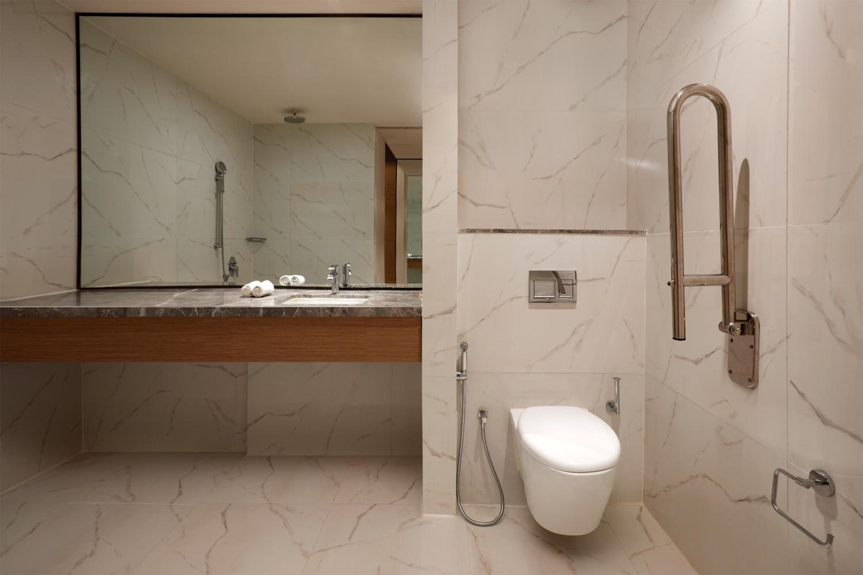 Each room at Sheraton Hyderabad Hotel features a flat-screen satellite TV, a seating area, and a private bathroom with modern amenities. The comfortable and stylish rooms provide the perfect retreat after a day of exploring the city.
