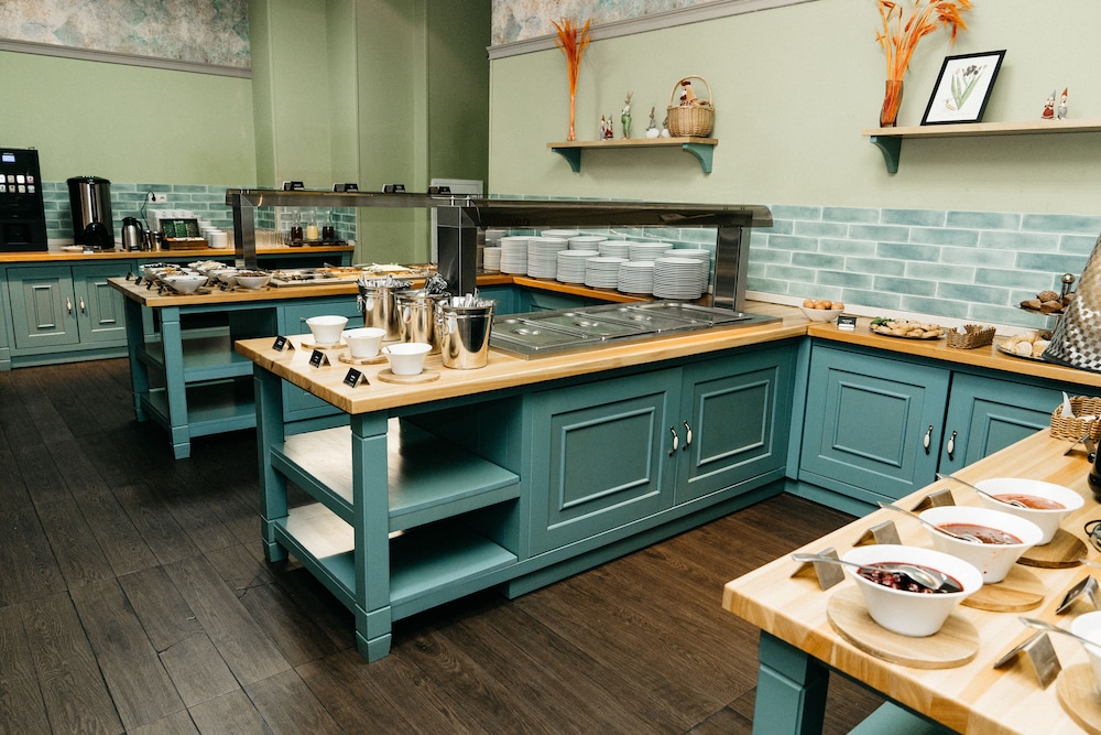 Сначала плюсы: нормальное питание, хорошие завтраки, обед за 390 р. шведский стол. Ресторан симпатичный, но маленький.