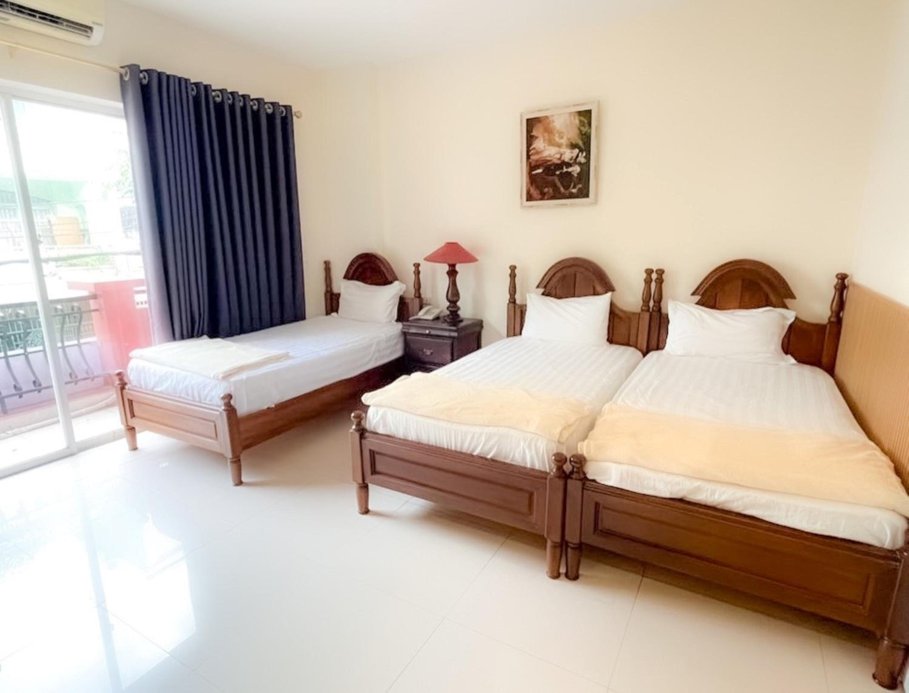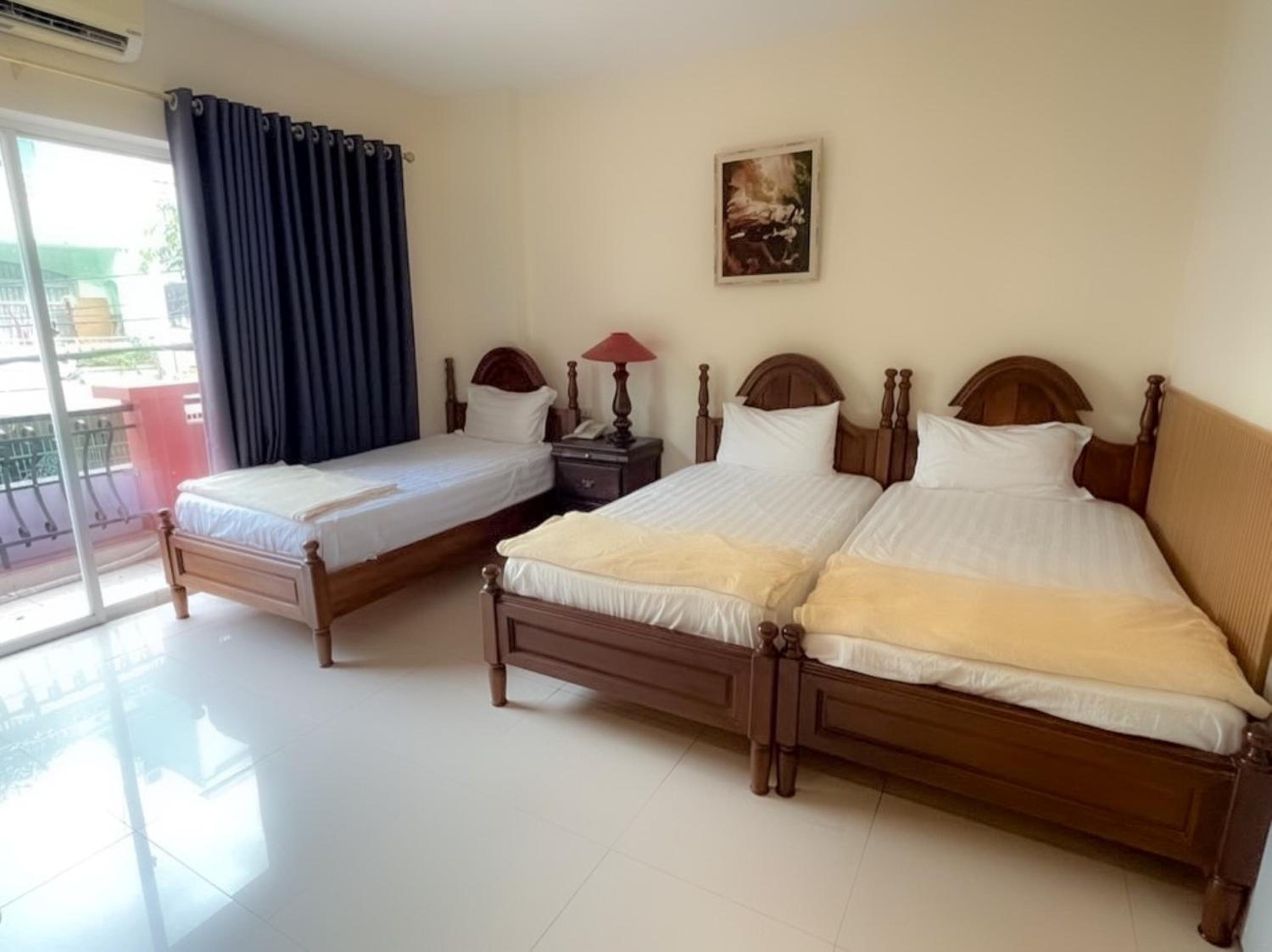 Guest rooms feature modern amenities including air conditioning, flat-screen TV, and free WiFi. Family rooms are also available for your convenience.