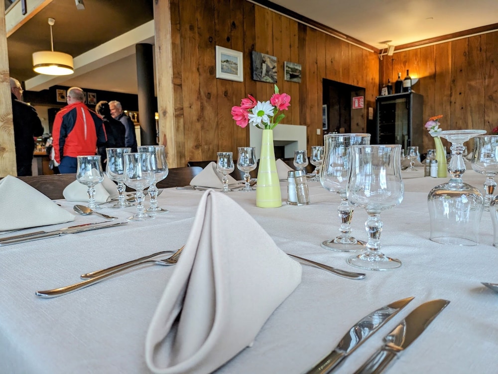 ter inlichting : restaurant gesloten toen ik aangekomen ben ( 18 uur , wegens buiten seizoen ) en geen restaurant in de omgeving op minder dan 12 km. duistere D baan , niet voor zakenreizigers die moeten vroeg opstaan , ontbijt niet voor 9 uur s'morgens . Jammer , want de omgeving moet zeer mooi zijn ;