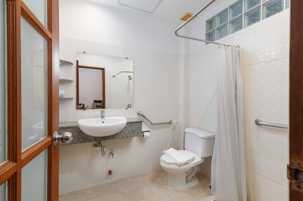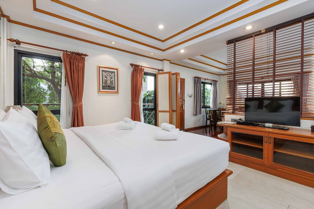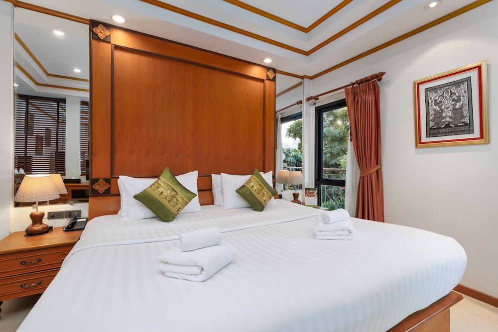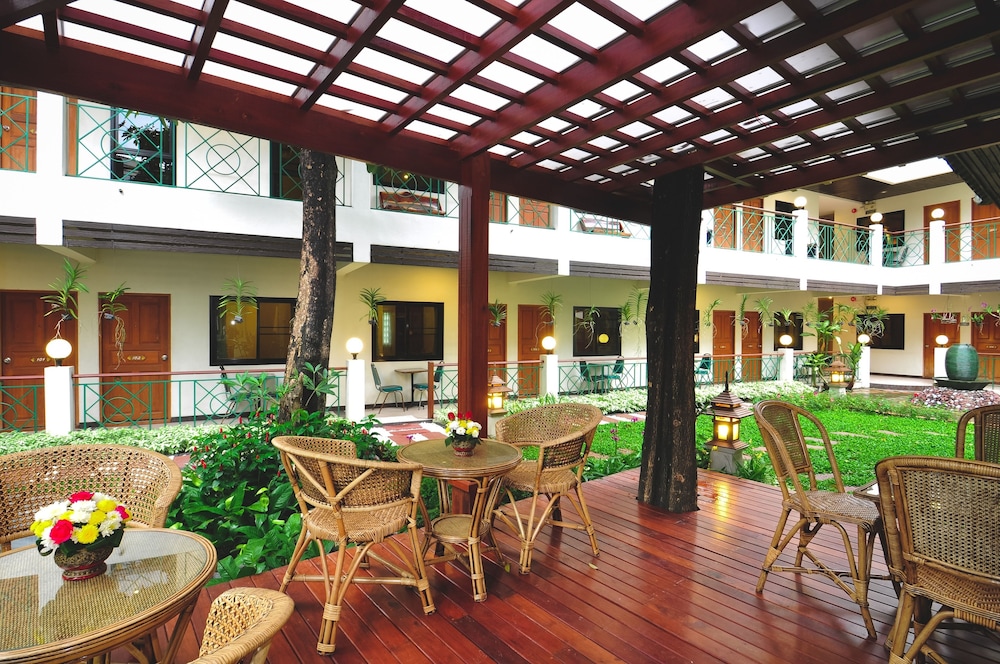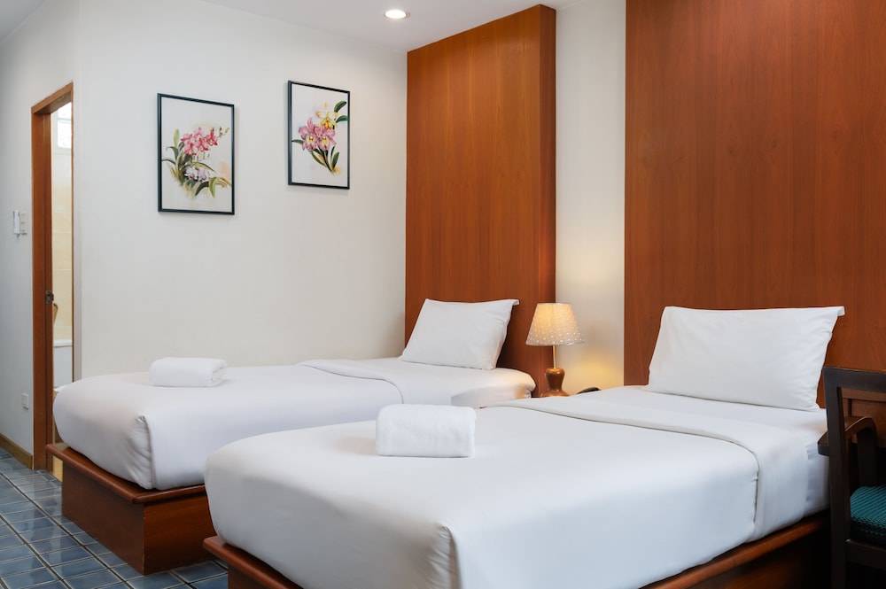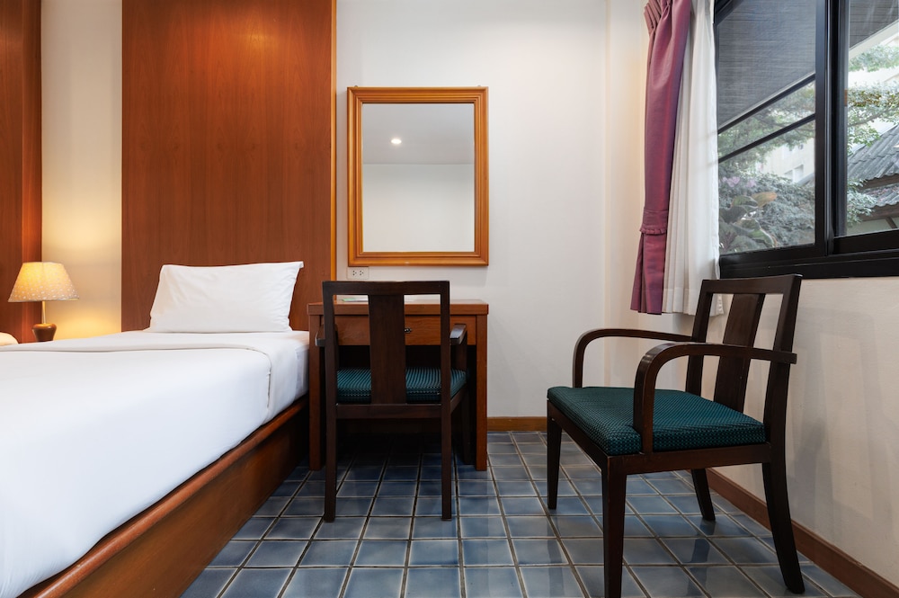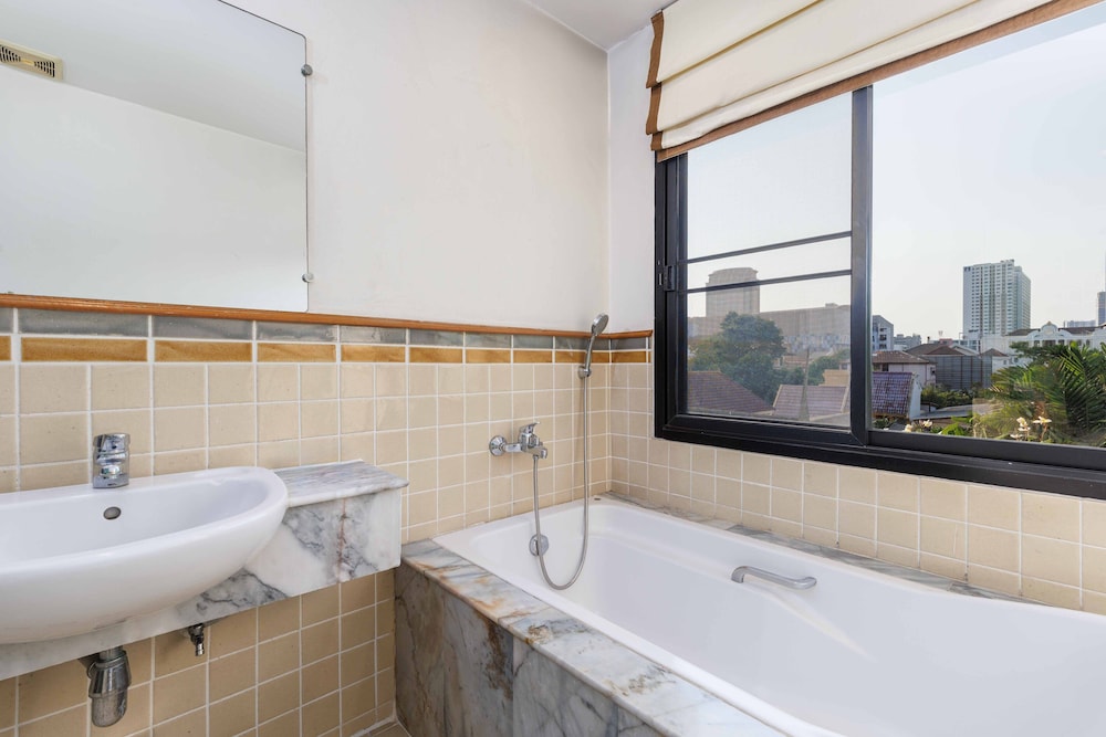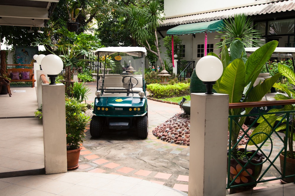 Very quiet secluded hotel in the heart of Bangkok. Lovely and attentive staff, clean and well equipped room, nice pool, koi pond, beautiful flowers and grounds and down an alley and right across the highway from a large department store for whatever you may need. The bed was huge and comfortable with clean linens and the AC worked perfectly. Lots of hot water. Can’t say enough about the place. We loved it.