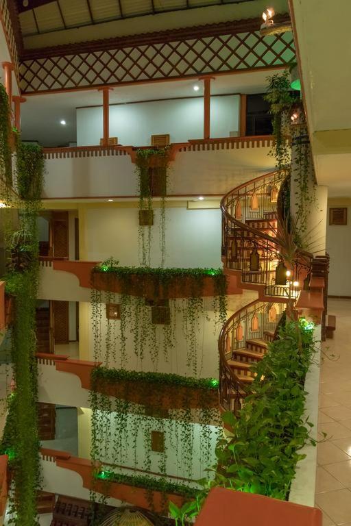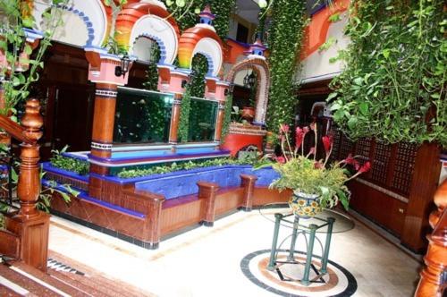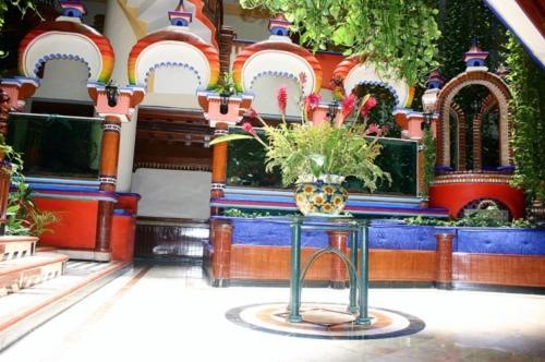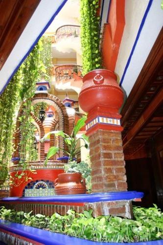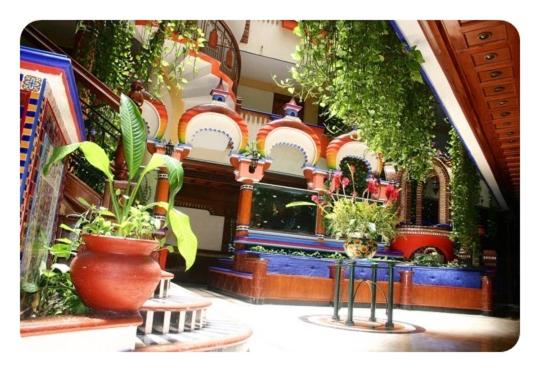 Experience a vibrant welcome at Hotel Báez Carrizal with its colorful lobby adorned with hanging gardens and fountains, setting the tone for a delightful stay.