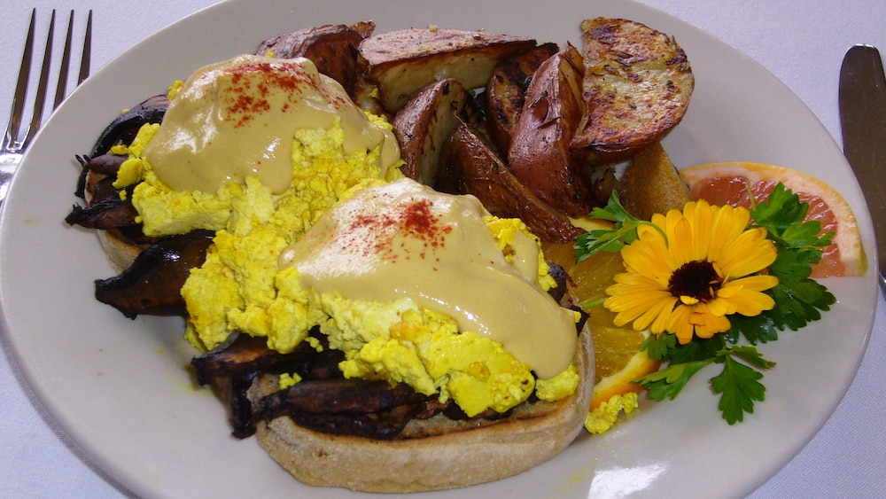 The vegan restaurant is interesting. Breakfast included with the room. Forces clientele to have an open mind to consider a switch to a vegan diet for health, sustainability and to not contribute to cruelty for our non human living creatures. Food was good and certainly gives pause and “food” for thought.