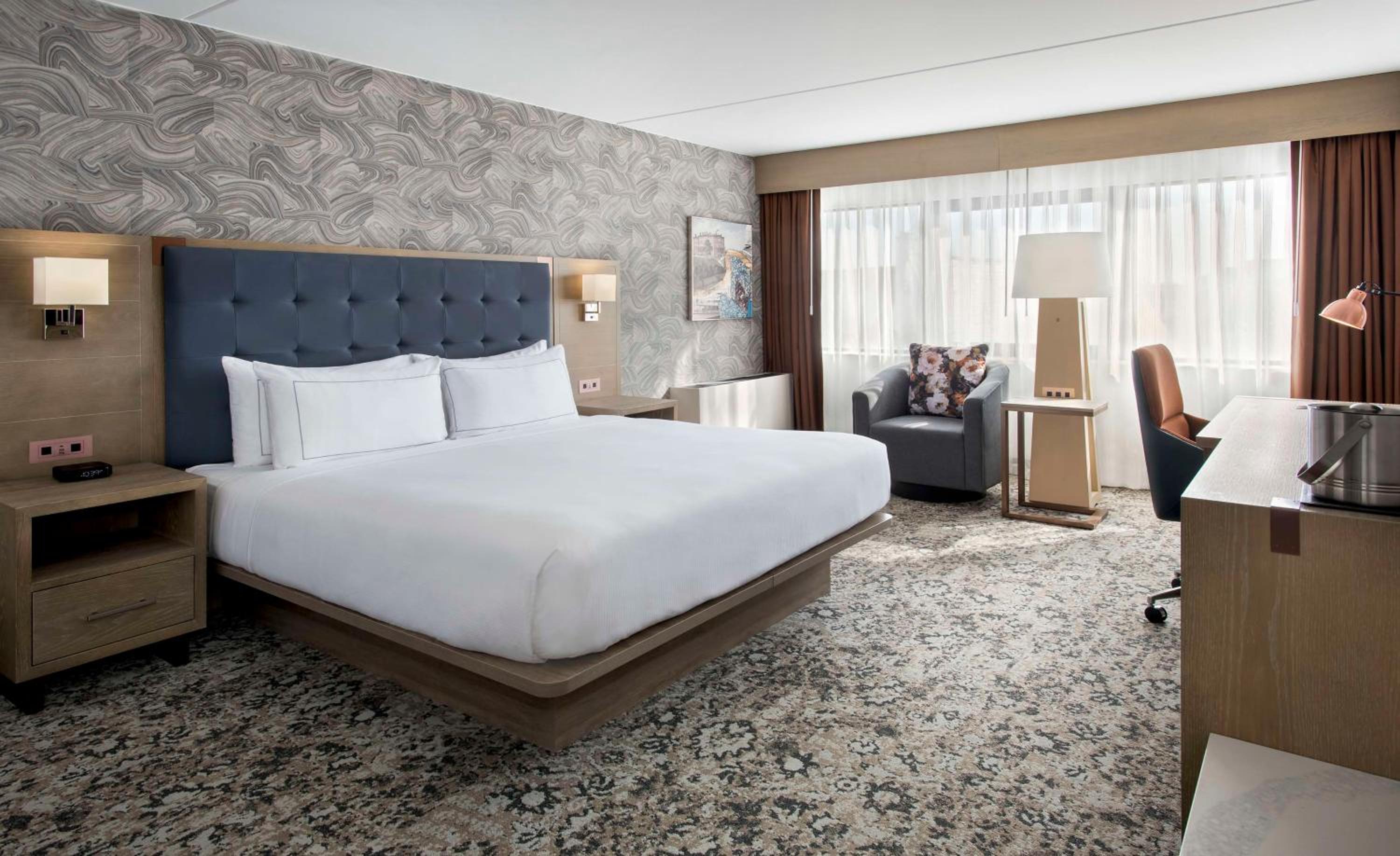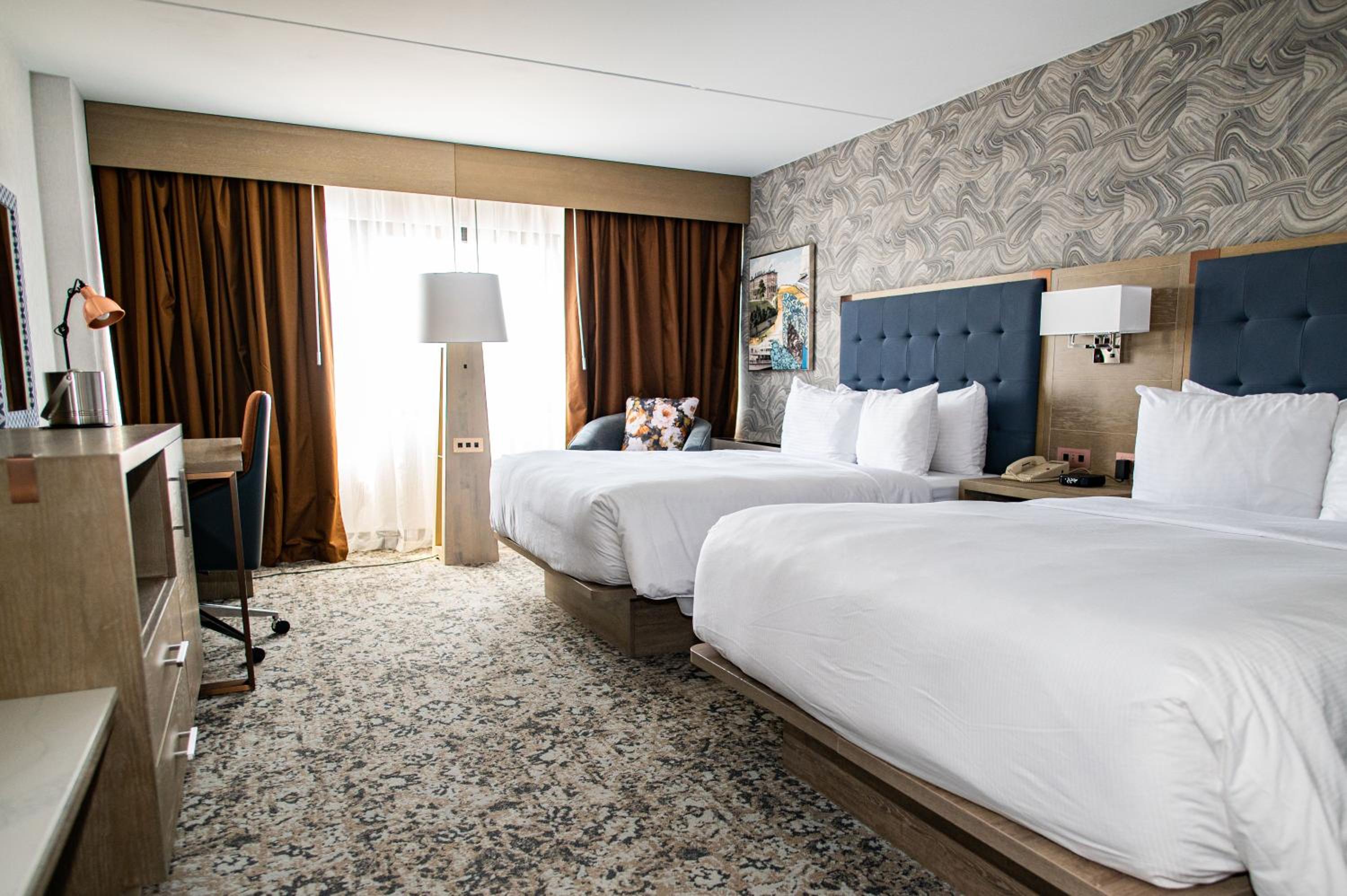 Experience comfort and convenience in every room at The DoubleTree by Hilton Poughkeepsie. Each room is equipped with a microwave, refrigerator, and coffee machine for your enjoyment. Relax in the private bathroom with a soothing bath and shower, and take in stunning city or river views from the comfort of your room.