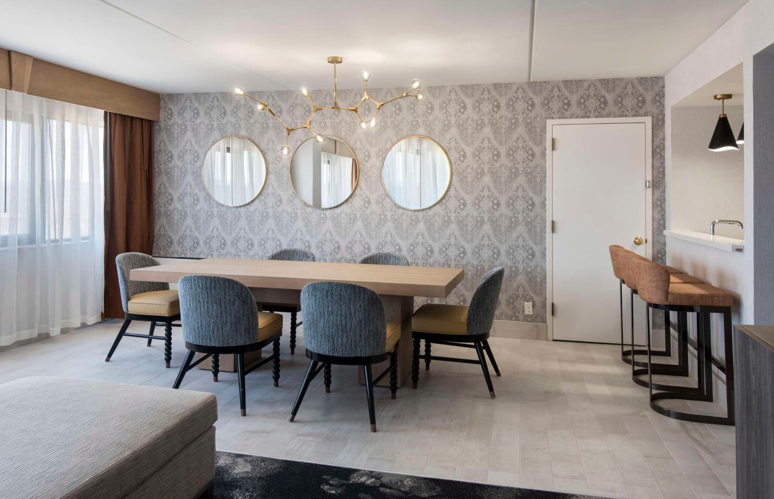 The hotel is beautiful and the staff was attentive and friendly. We were there for a dance competition that was on-site. The restaurant/bar was understraffed but they really tried to provide great service. The food was okay at best. My only complaint was the price of breakfast. It was your standard hotel buffet and it was $20 pp! I could justify that for a cooked to order breakfast, but it should have been priced at no more than $10. Overall great place! I'd go back at eat at Dunkin! :)