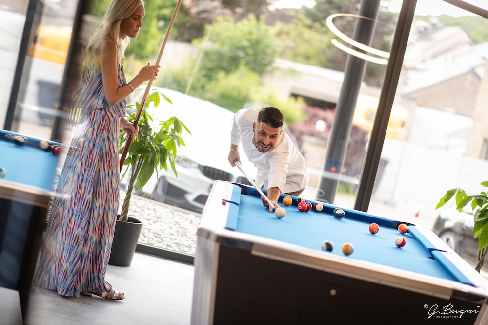 : the train station and bus stops were near the hotel, so it was convenient for us to go round. There was a big supermarket that's 2min away from the hotel. The hotel was surrounded by the trees and nature so, it was very peaceful and quiet. There was a table tennis table where you can play and refresh. But, what's most important is that the hotel is nearby the Thermes de Spa and other tourists places. You can go around there by walking.