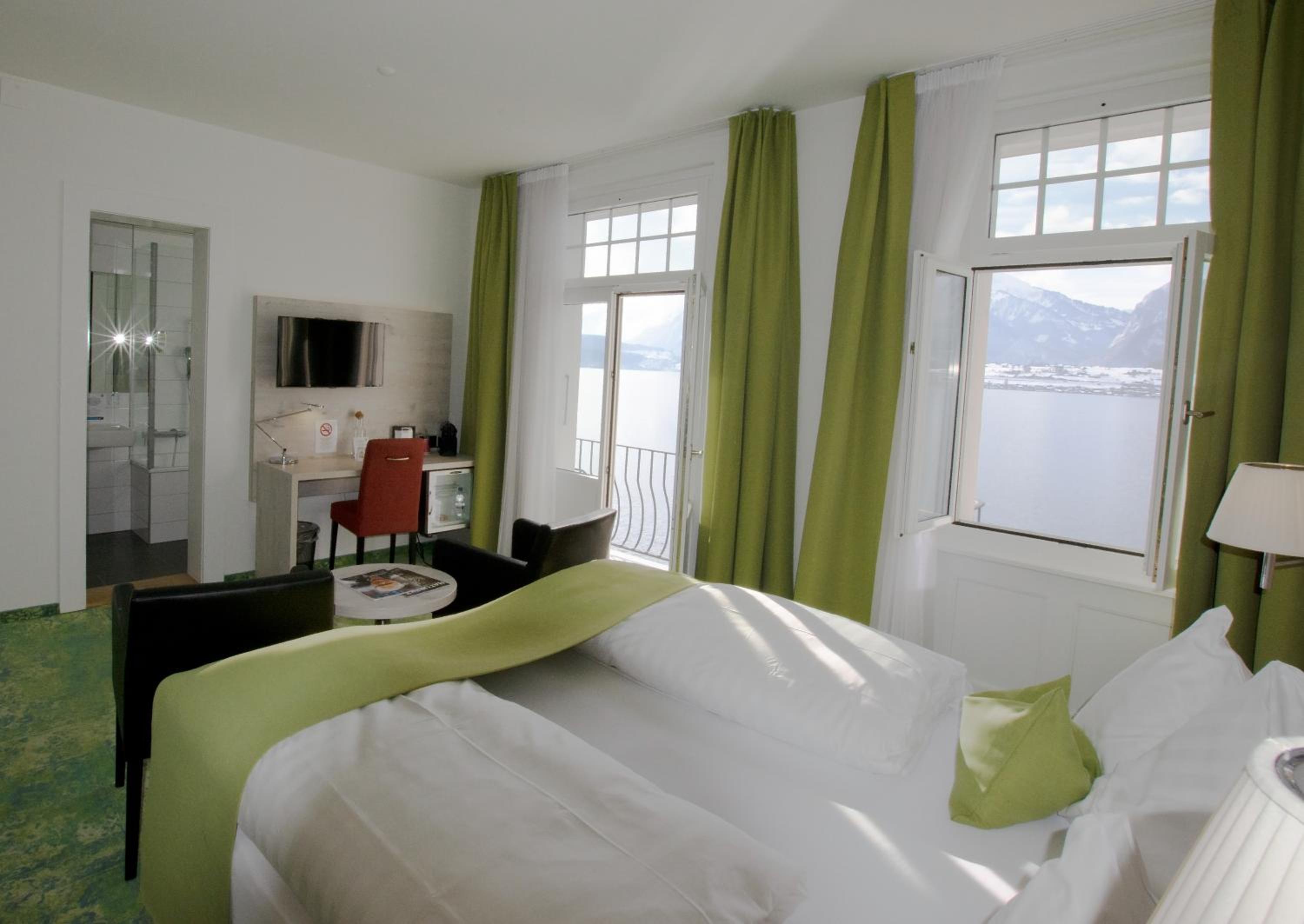 Located directly on the shore of Lake Thun, the 3-star superior Hotel Restaurant Bellevue au Lac offers a picturesque setting for your stay. Built in 1918, the property boasts modern renovated rooms with complimentary parking and WiFi, each equipped with a minibar and a fan.