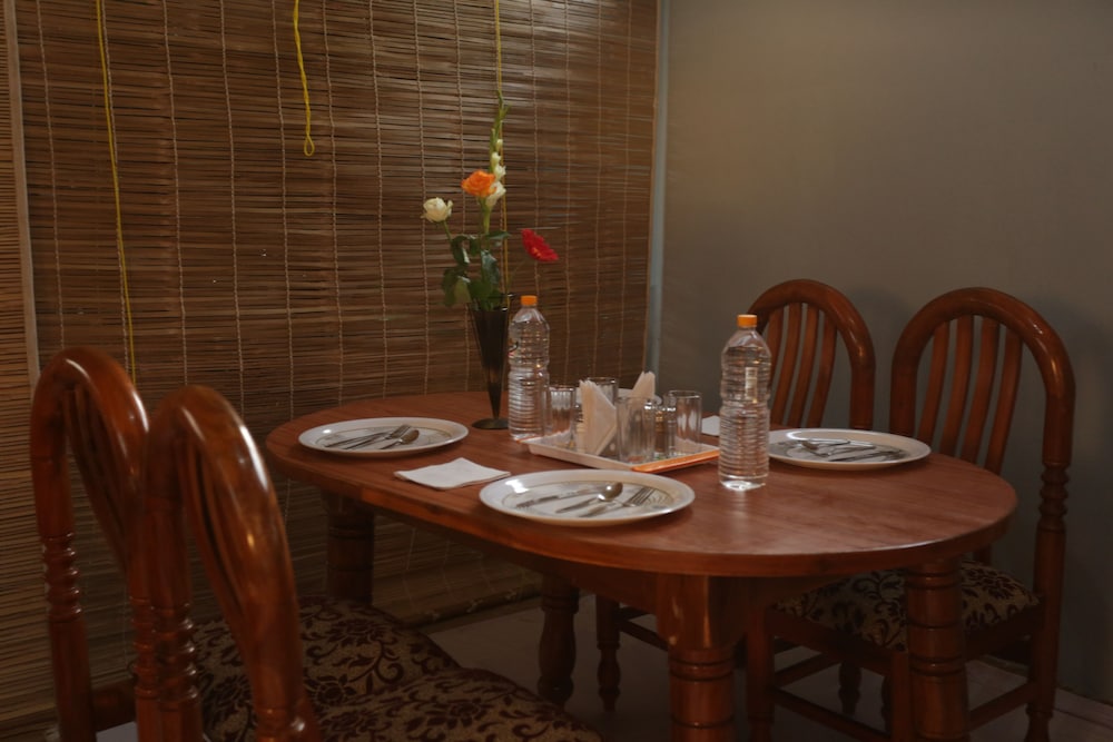 We only stayed for an hour. The AC did not work. The kettle did not work. The bathroom was not clean. The furniture is old. The TV was falling apart. Problems with the generator meant the whole of the ground floor was filled with with smelly fumes and we struggled to breathe. We could not contemplate eating or drinking in this place. We left. Even without the fumes, I would suggest staying elsewhere as the facilities are not only basic, but inadequate.