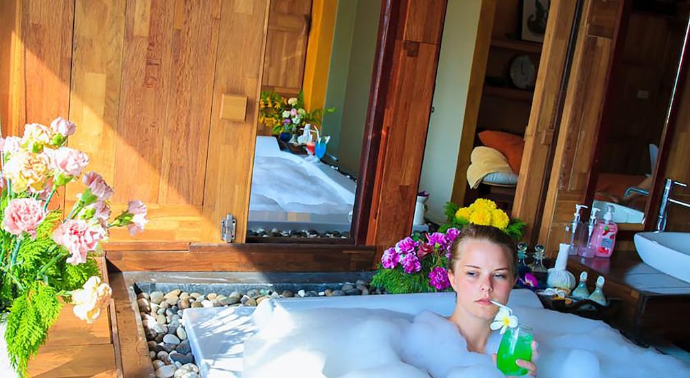 Vi boede i beachfront bungalow, i 2. Række ned til stranden. Den levede fuldt ud op til vores forventninger, hvis ikke mere end det. Vi nød det store værelse og fantastiske badeområde med både indendørs og udendørs bruser.