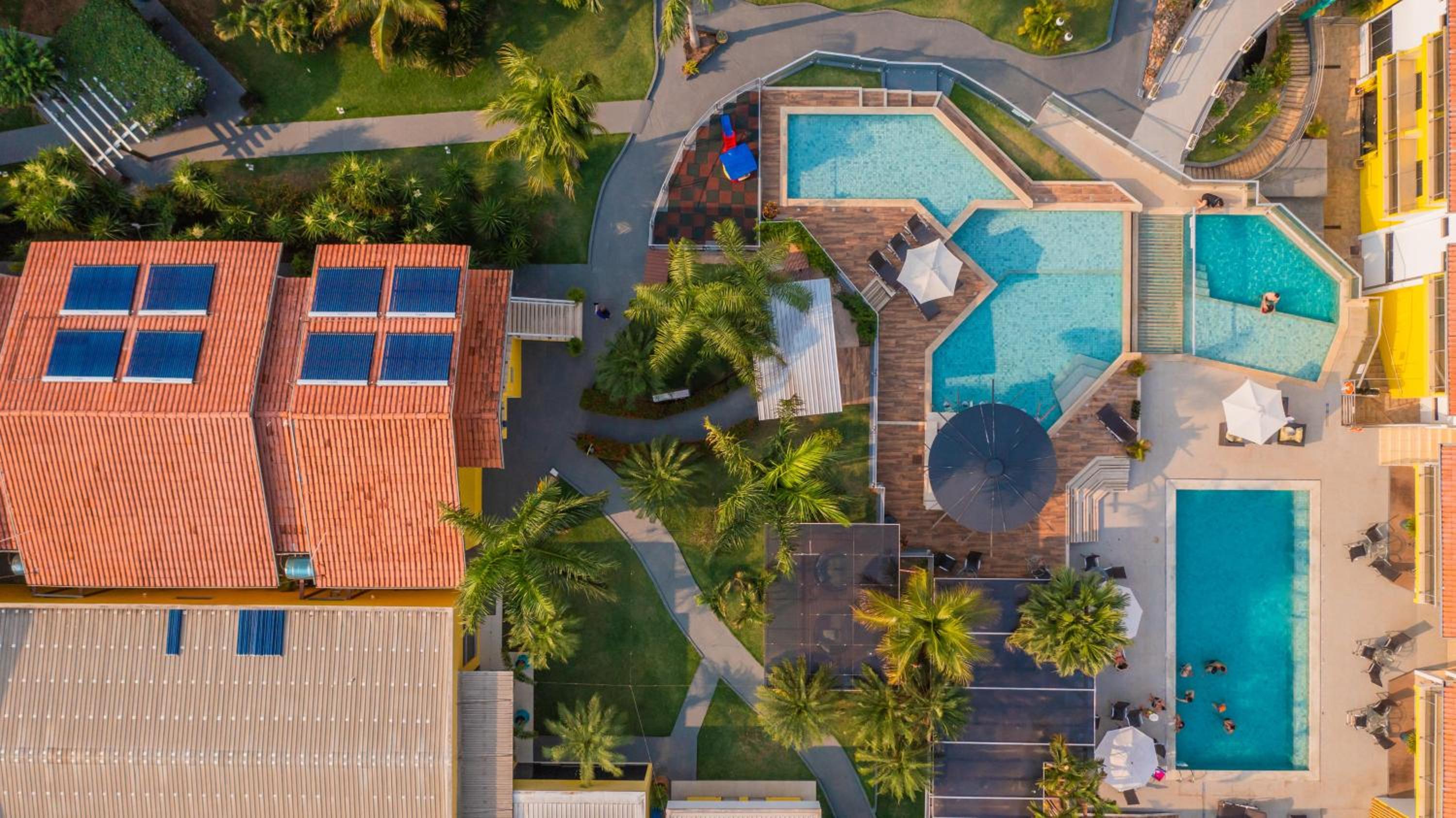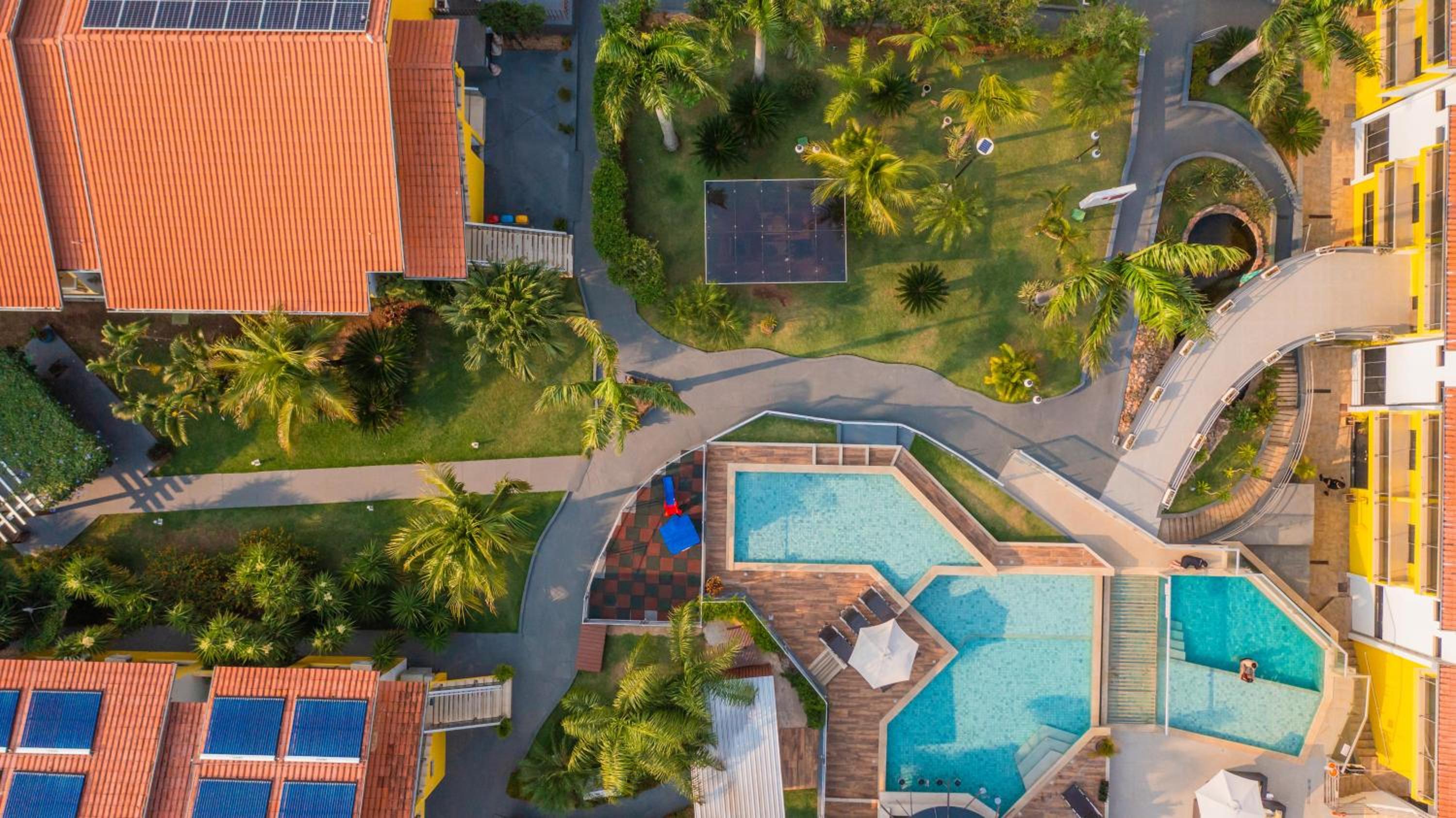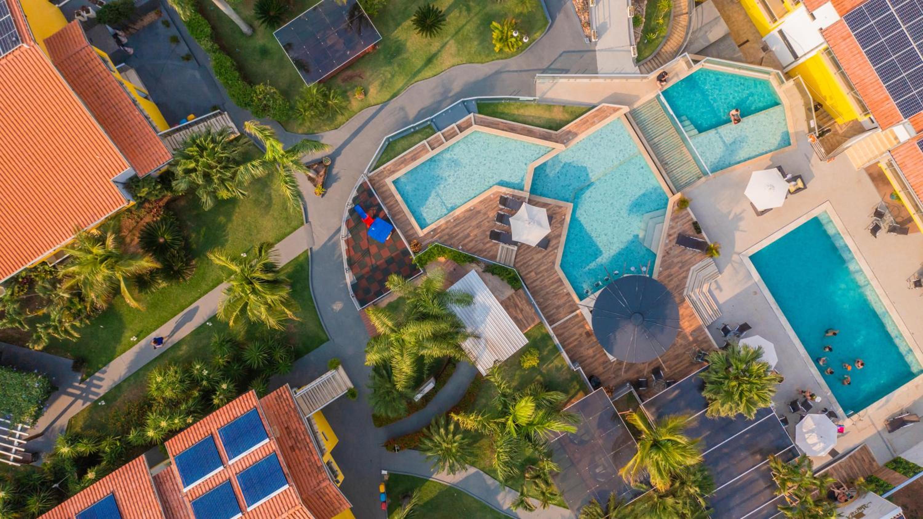 A localização, as piscinas e o bar do hotel.