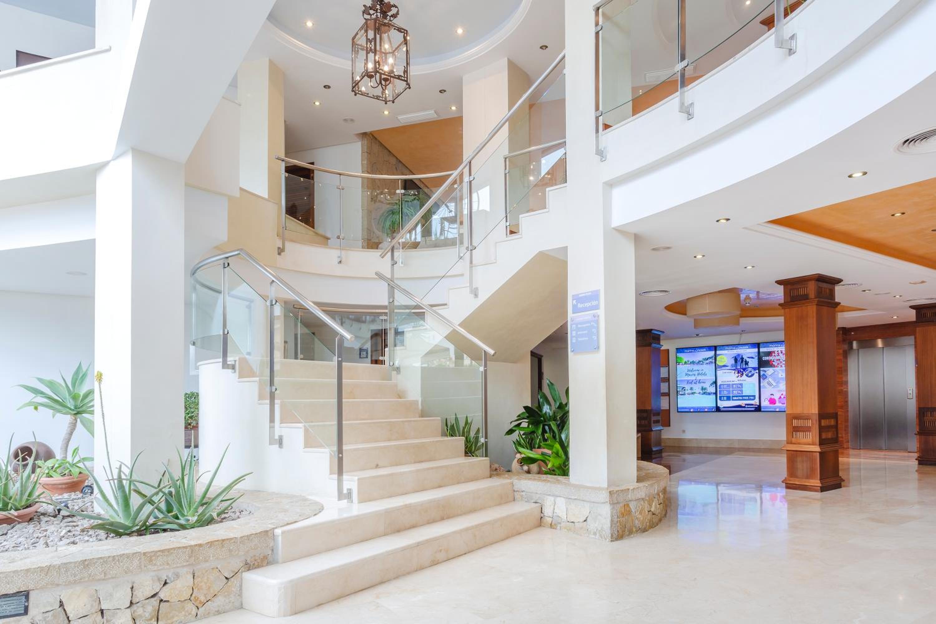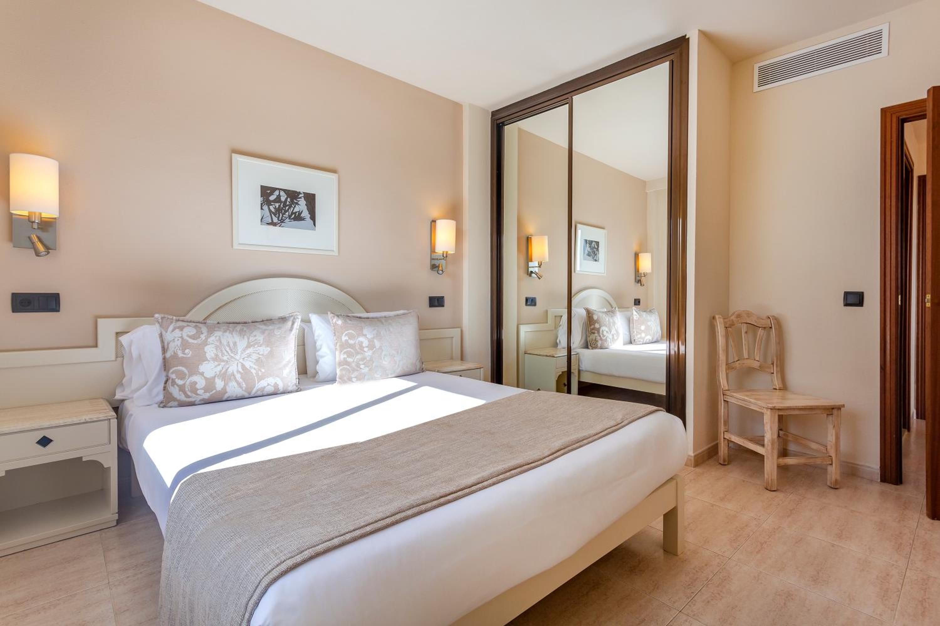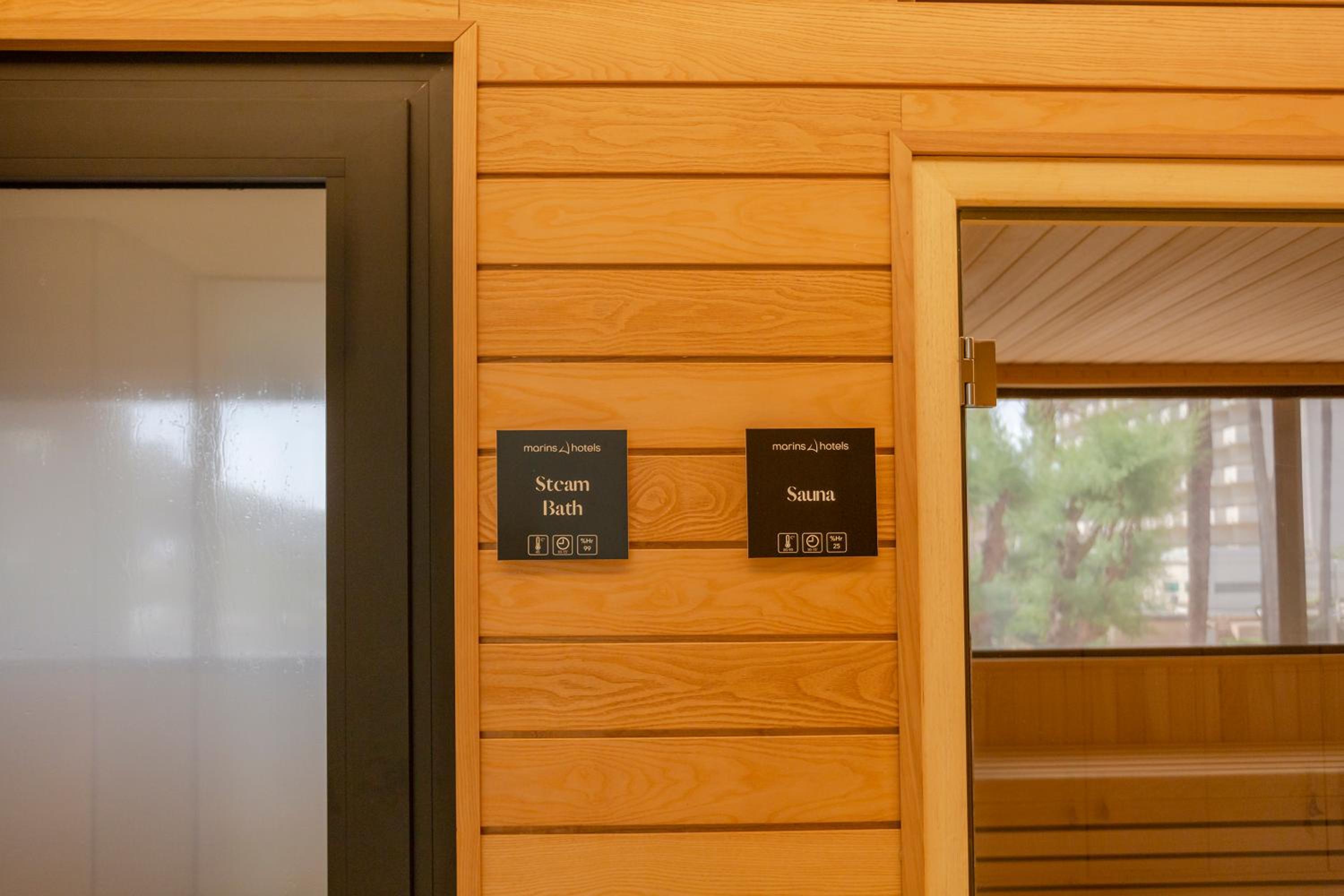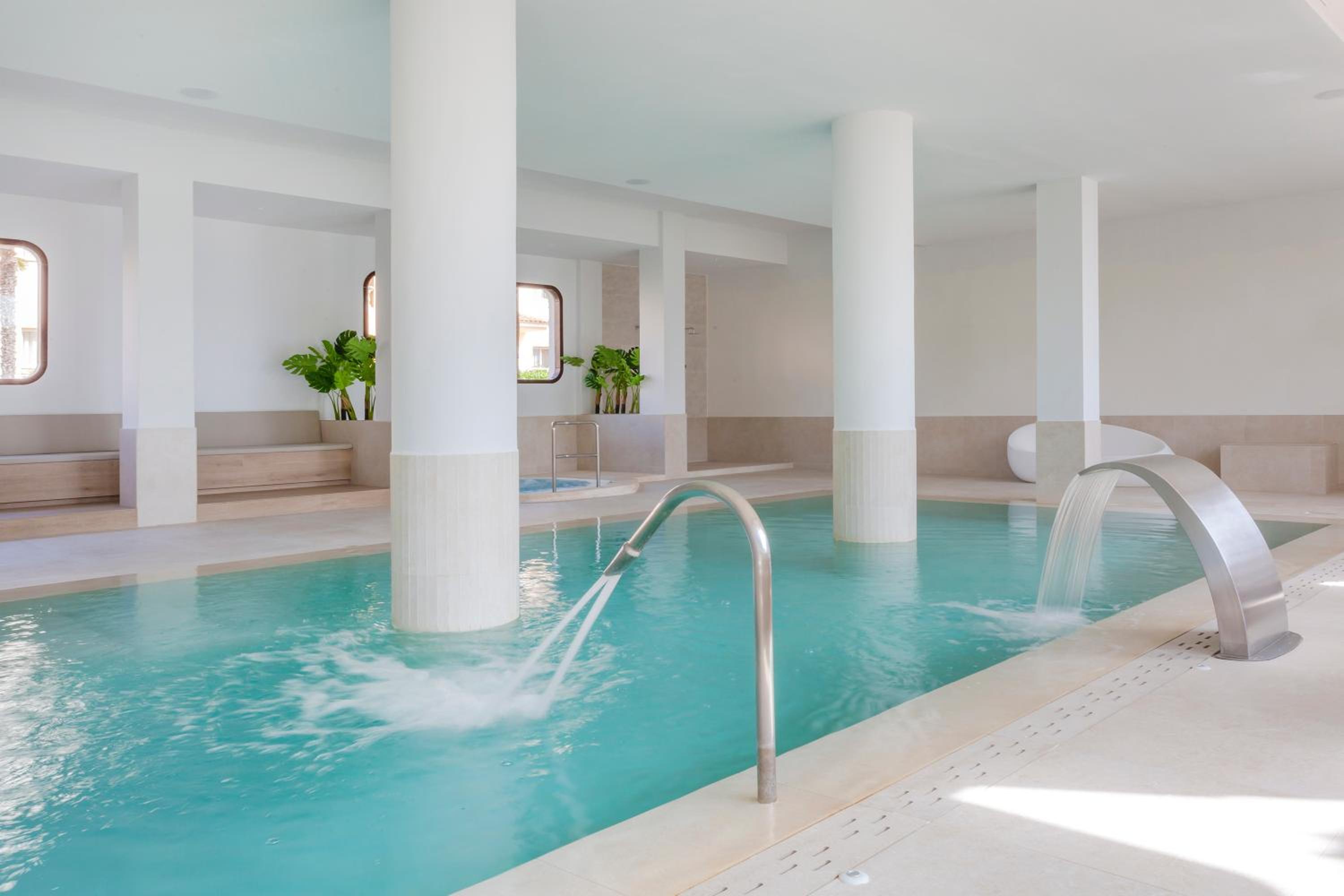 Indulge in the outdoor swimming pool, fitness center, and indoor pool at Marins Playa. The air-conditioned rooms with modern amenities ensure a comfortable stay.