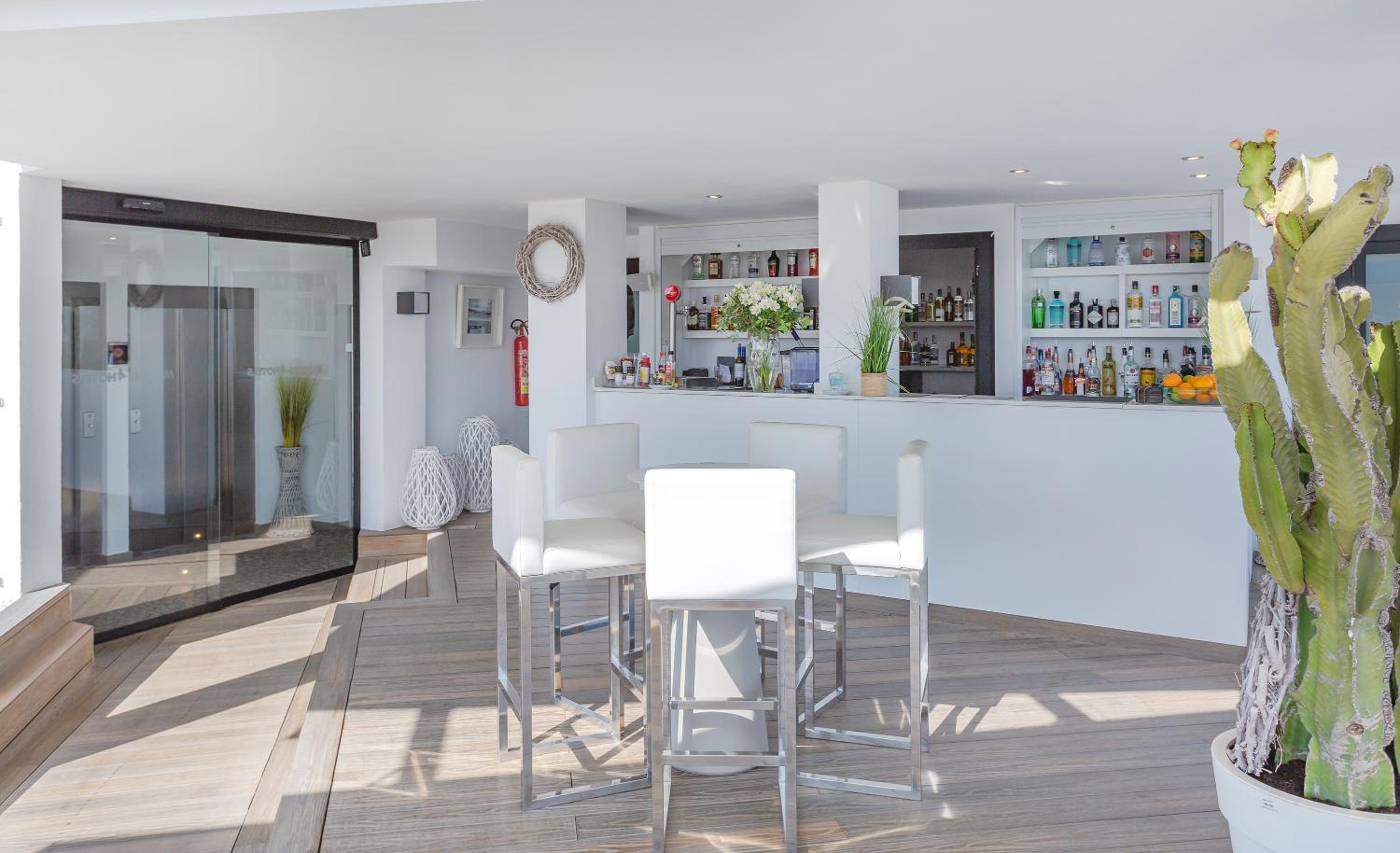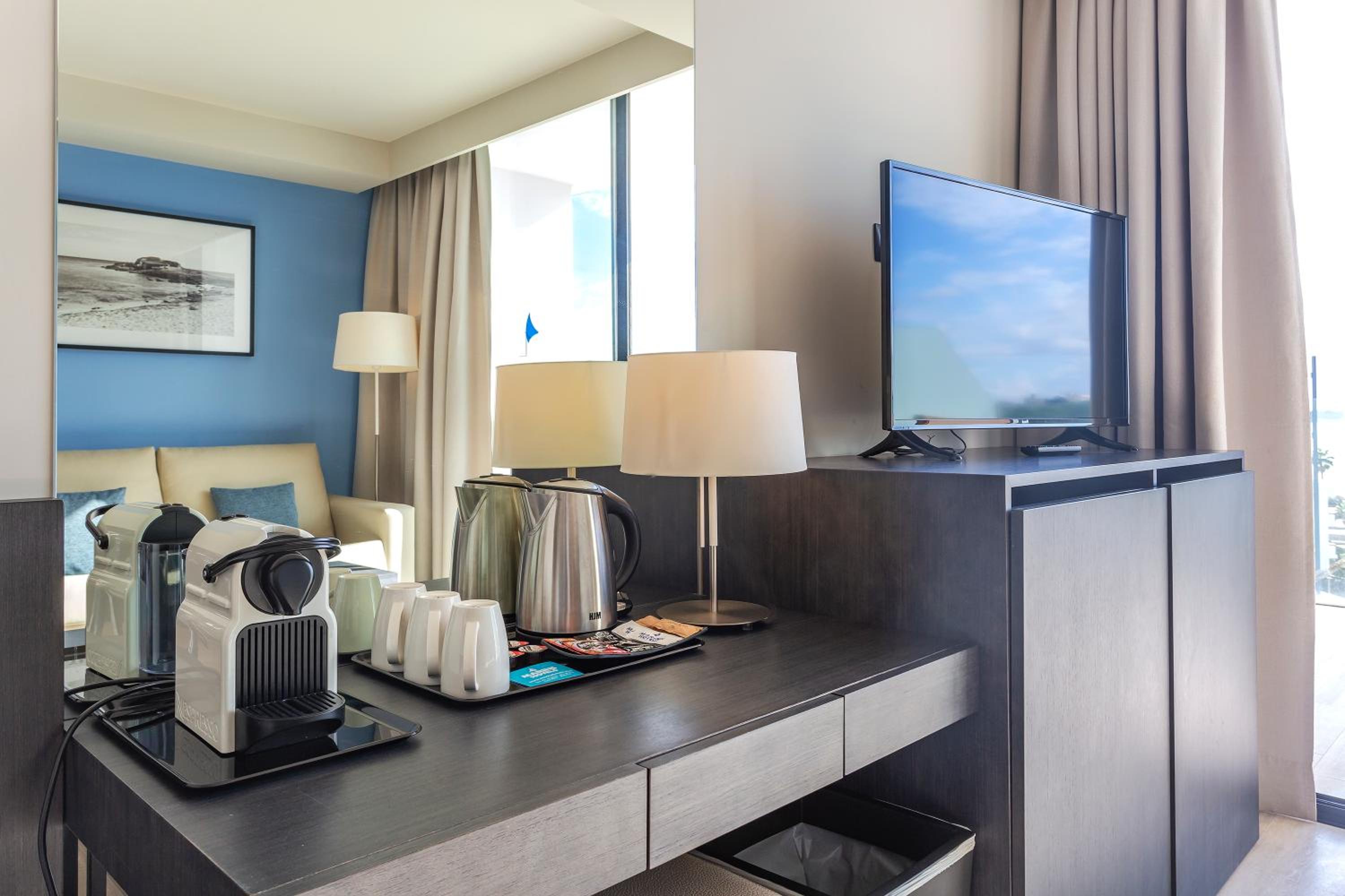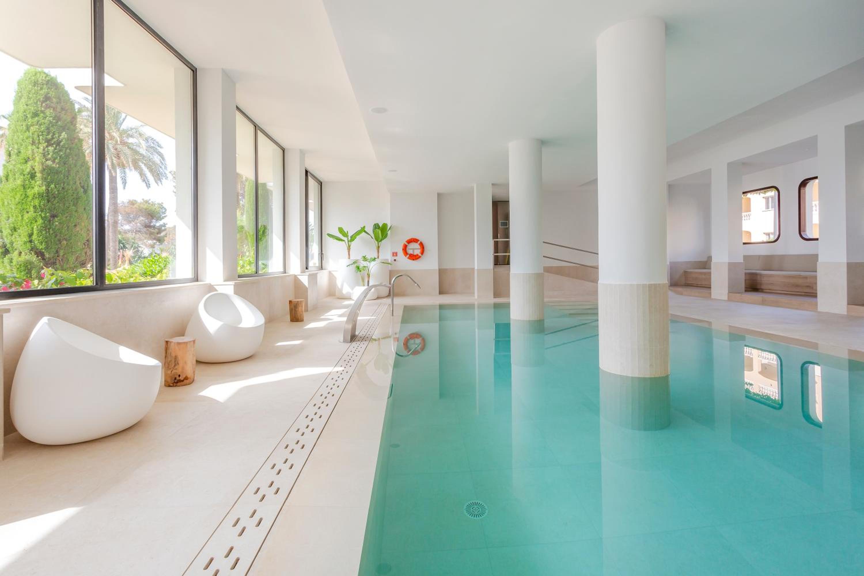 Indulge in the outdoor swimming pool, fitness center, and indoor pool at Marins Playa. The air-conditioned rooms with modern amenities ensure a comfortable stay.