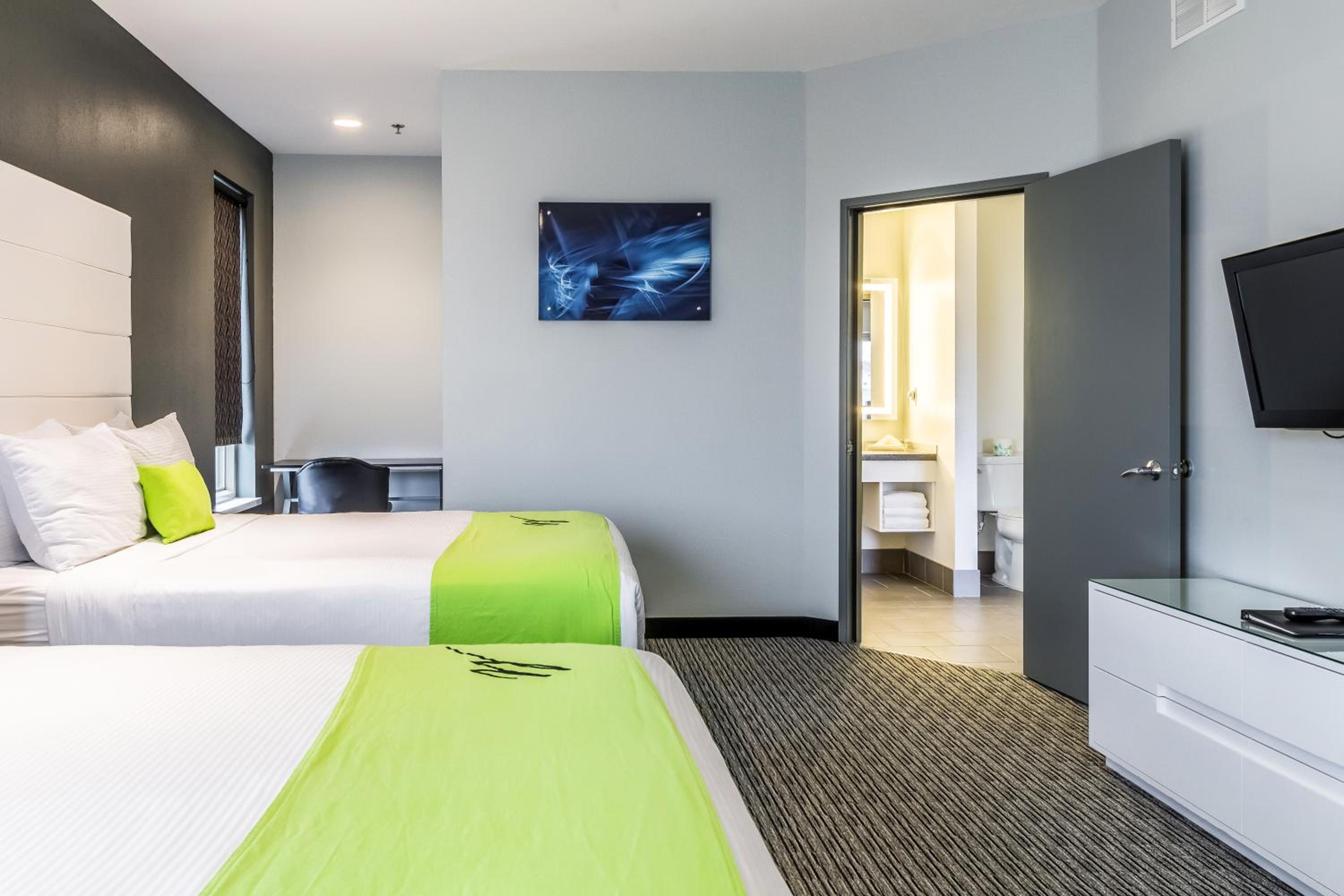 Experience modern designed rooms at The Wallhouse Hotel, Ascend Hotel Collection featuring flat-screen HDTV, luxury bedding, and convenient amenities like a microwave and refrigerator. Some rooms even offer a private balcony for a perfect retreat.