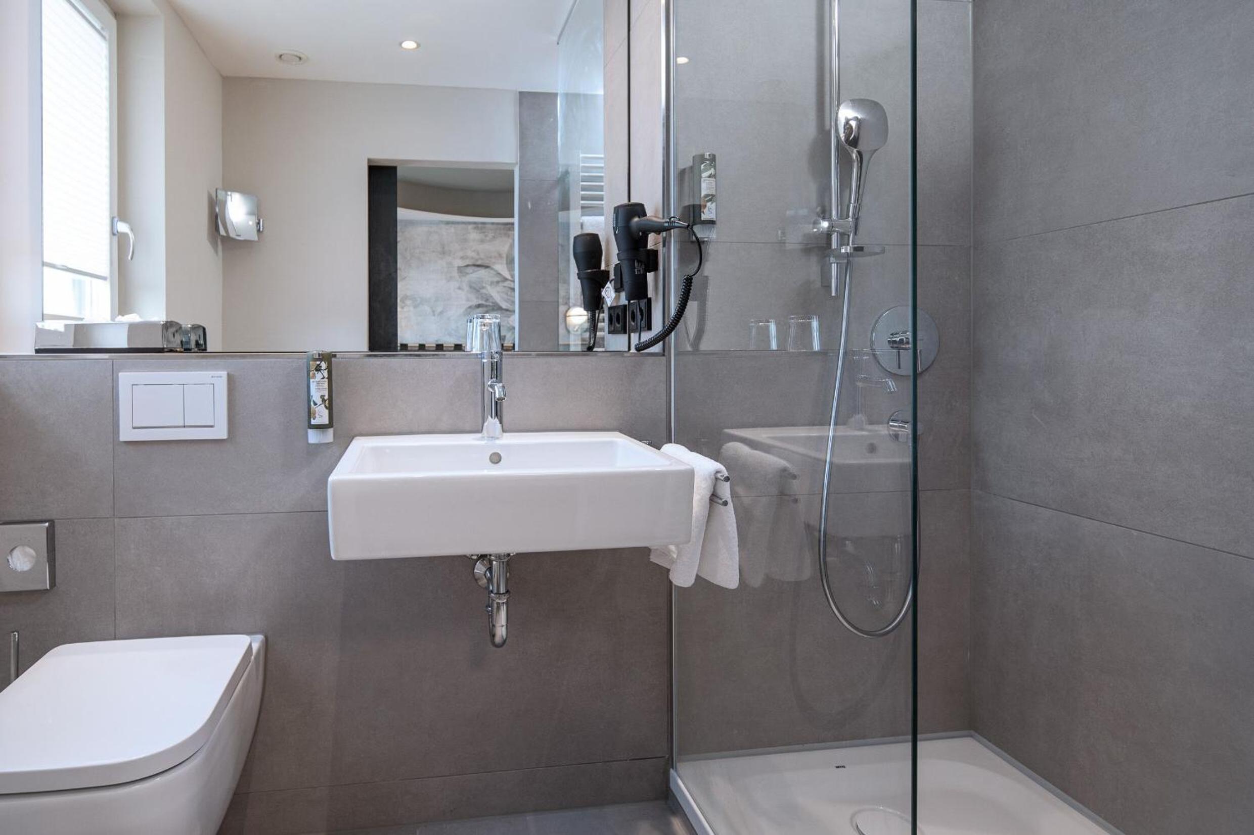 Řešení sprchy a toalety v rodinném pokoji.