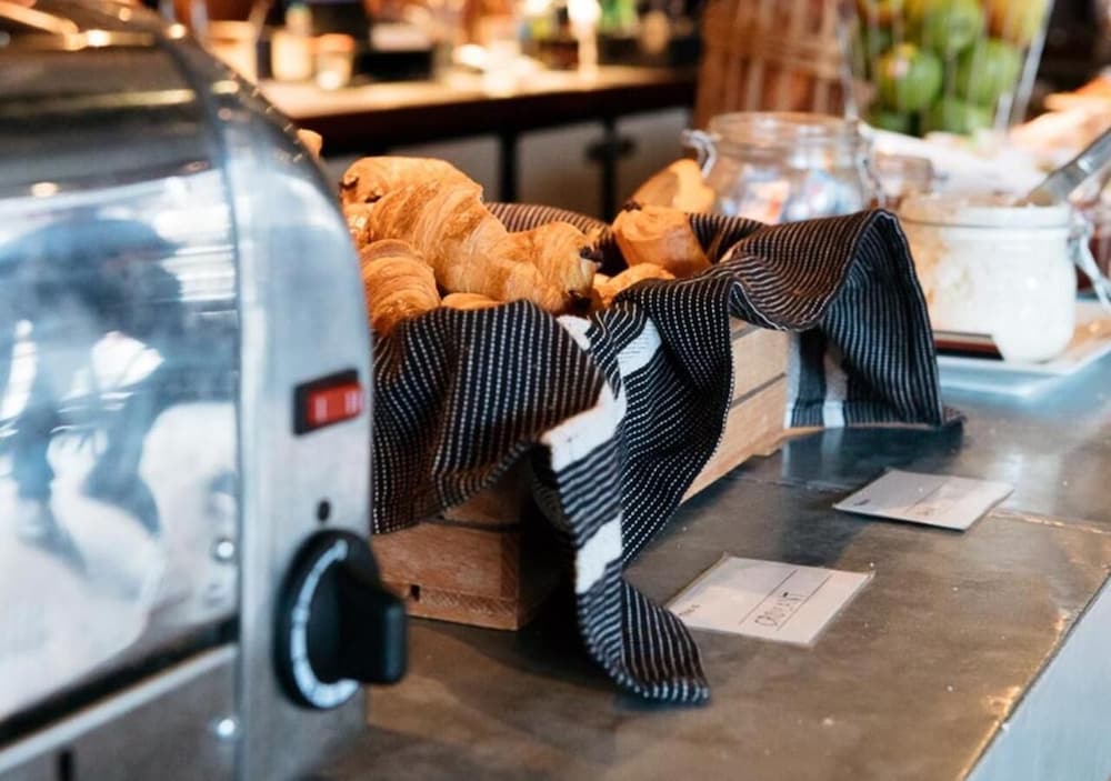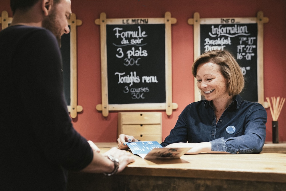 accueil sympa, bar et restaurant branché en bas, personnel jeune et souriant. réservé quelques heures avant nous avons pu prendre une chambre pour trois.