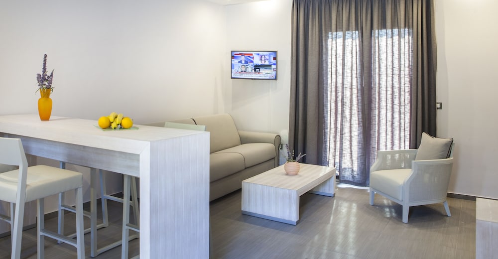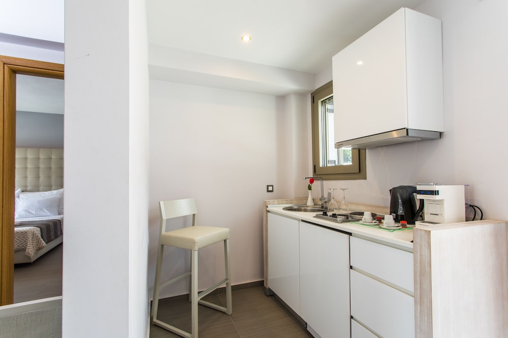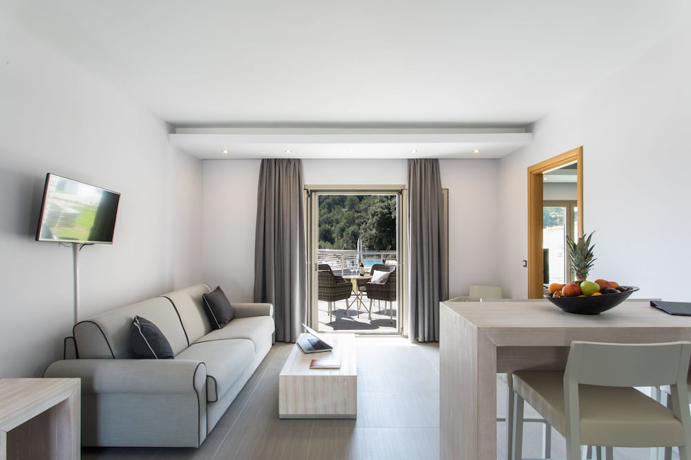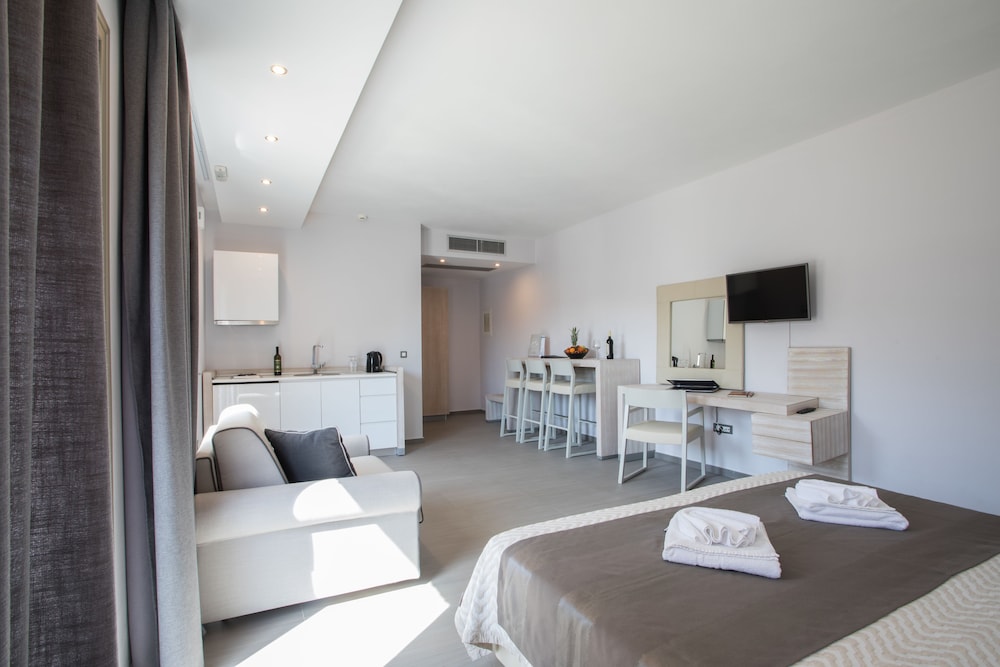 Rooms have sea view, side pool view and no view. Our party stayed in a junior suite church had a living room and kitchenette and pullout bed and bedroom with insuite bath. The accommodation was great for our family although it would have been nice if the bathroom was not in our bedroom. We had an issue with our room key card and access to WiFi, and everything was addressed immediately. The kitchenette was not stocked with any utensils or plates, but this was on account of coronavirus restrictions. The hotel had very low occupancy on account of coronavirus, which negatively impacted F&B supplies and some dishes that were prepared had poor quality products. As the days went by, things gradually improved. Staff wore masks and we felt that all safety measures were being obeyed, from sterile pool towels in plastic wrap to the constant cleaning of all outdoor surfaces. The location is nice, although the beach near the hotel is just ok and the single-lane yet two-way access road must be tricky during high season. Congrats to the hotel during this difficult time and especially to Nikos and Afroditi for their graciousness. Note: I did not notify the hotel that I was a celiac as I brought my own food, but they informed me that if I had they would have ensured that there were ample options for me.
