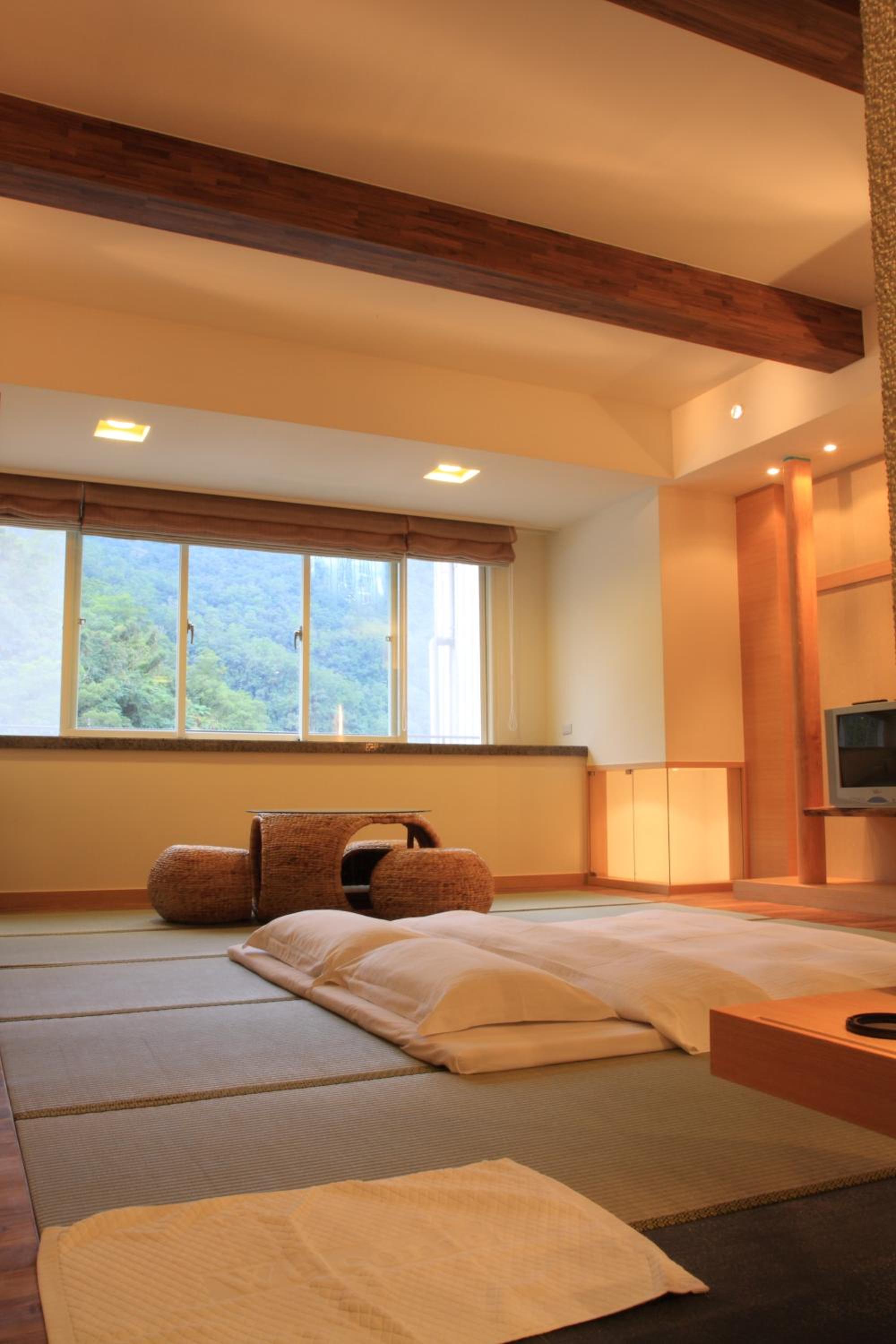 房間很大,日式風情濃厚,可借用嬰兒澡盆,住宿還可免費泡湯,附早餐,重點是吃早餐的地方風景很美