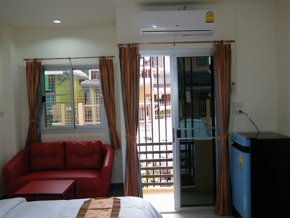 This hotel is very close to Big C shopping centre and the night markets with good quality local food at a low cost. It is easy to get into the city centre using the frequent songthaews., The airport is only about 2Km away but you cannot hear any aircraft. The bus depot is only about 400 metres away.