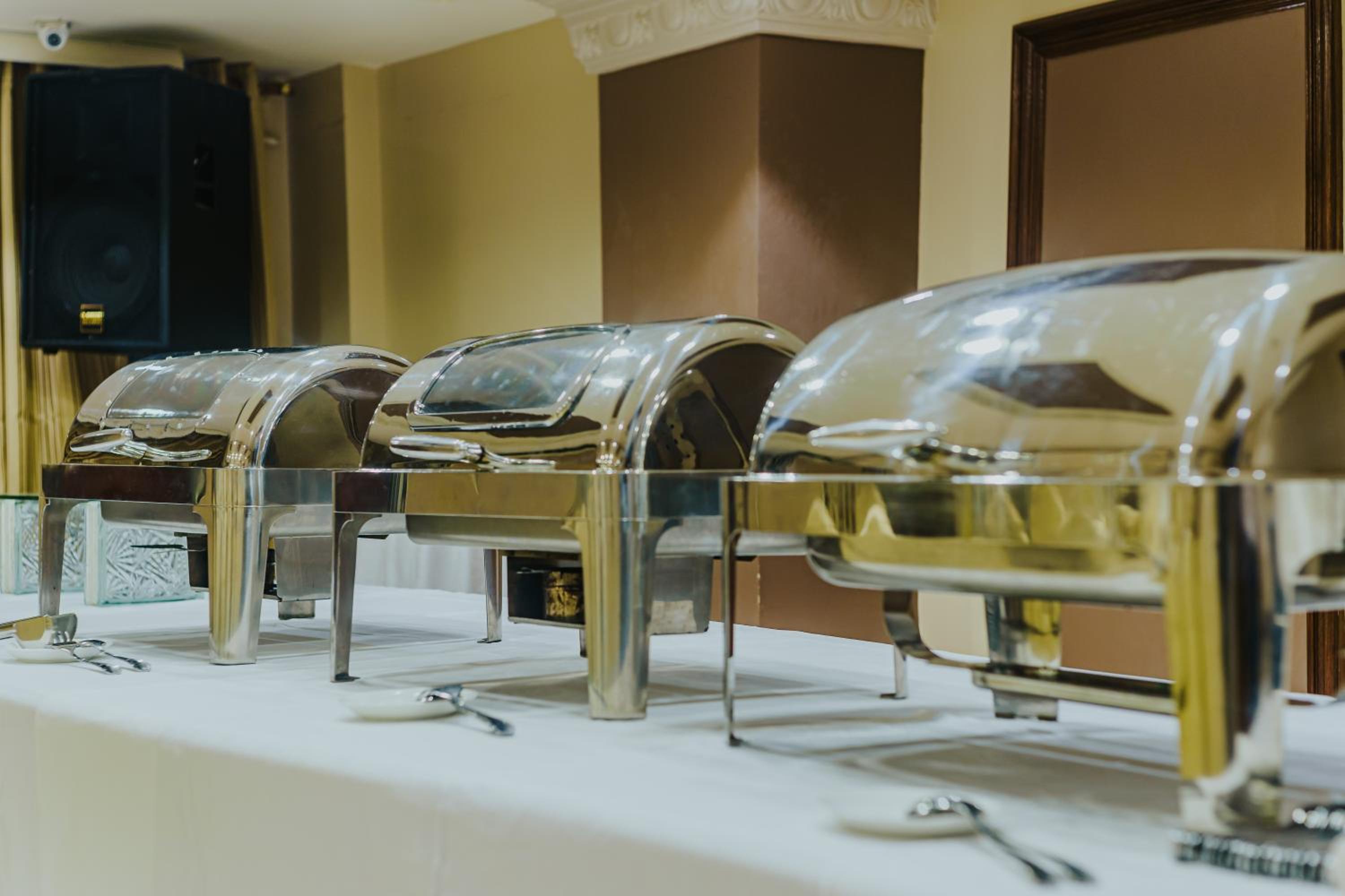 Staff, food selection at the buffet and location.