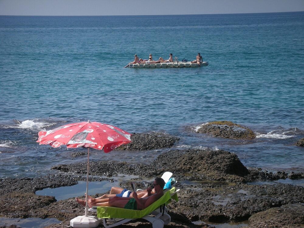 Als wir ankamen, waren wir etwas irretiert, wir hatten auf den Pool gehofft aus der Beschreibung, aber es gab keinen mehr. Wir erfuhren die Gründe für den Rückbau und es war okey, weil wir ja direkt vor dem Hotel auf einer Leiter ins Mittelmeer steigen konnten.