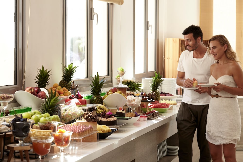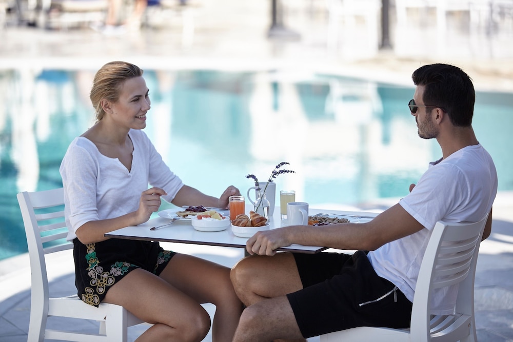 Food - Amazing! They have different themed night throughout the week and overall the food was a really good standard and hot. The buffet did get extremely busy and noisy in the early evening making the restaurant feel really full. The staff all worked very hard bringing you drinks and clearing plates. We preferred to sit outside by the pool and never struggled to get a seat. Meze restaurant is a must that was great.