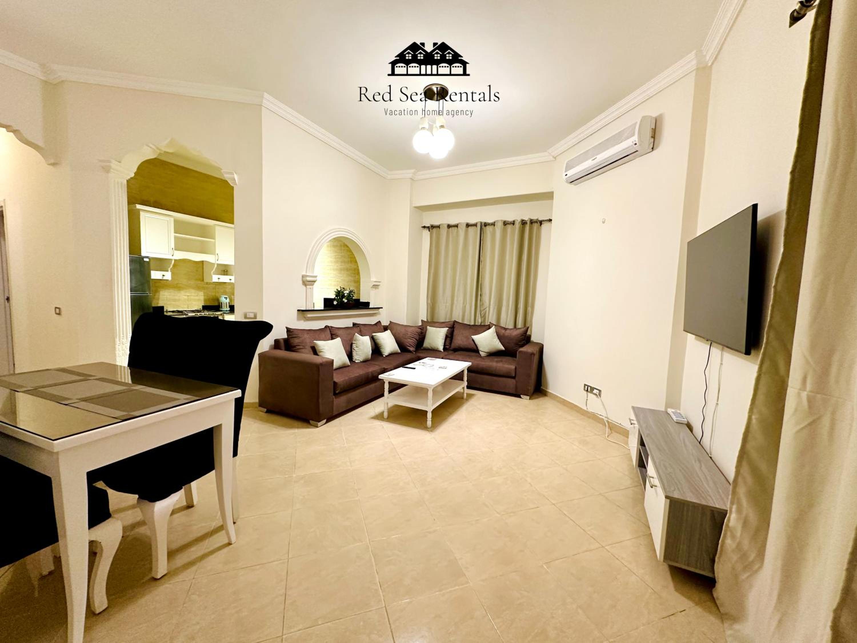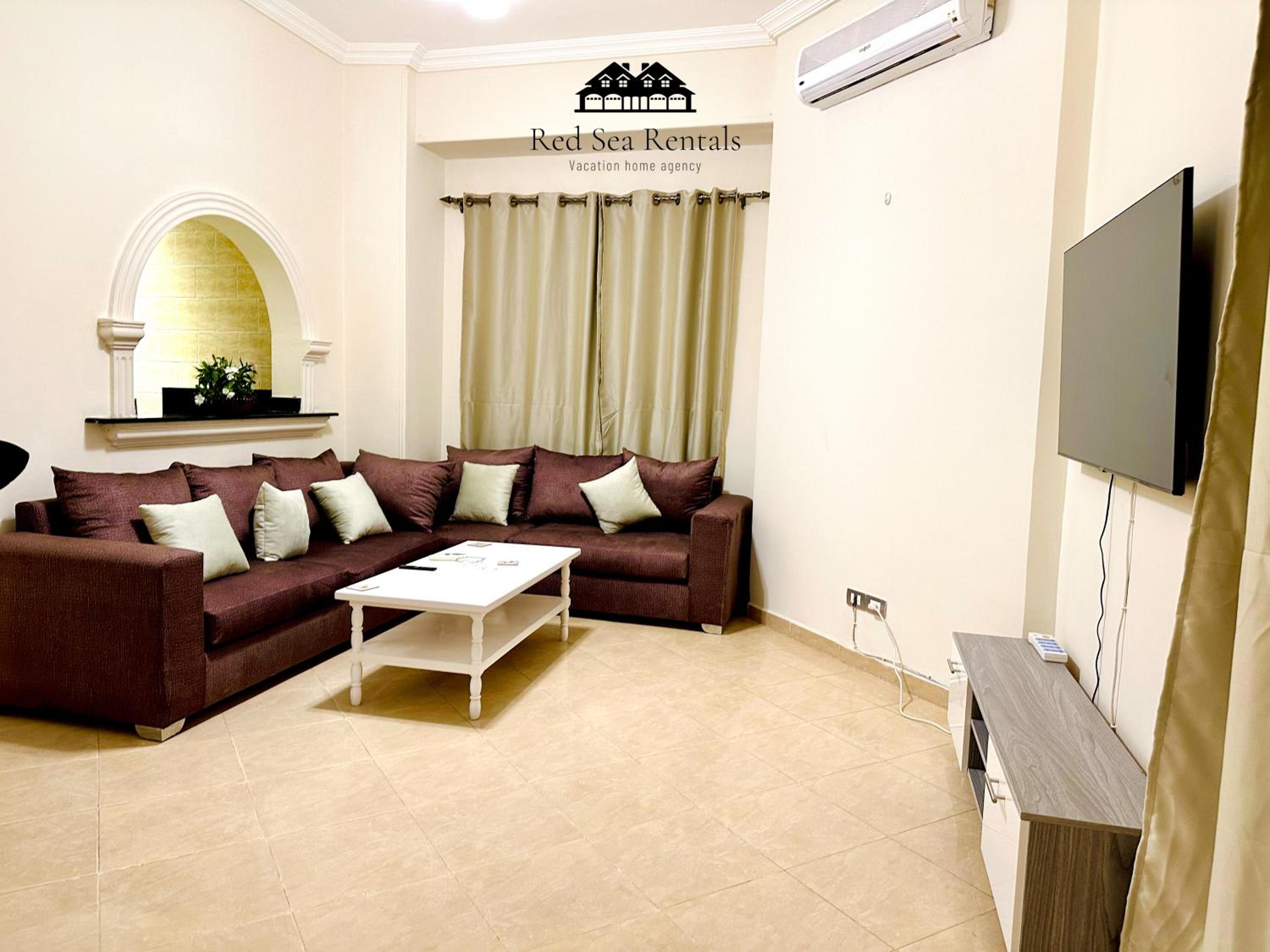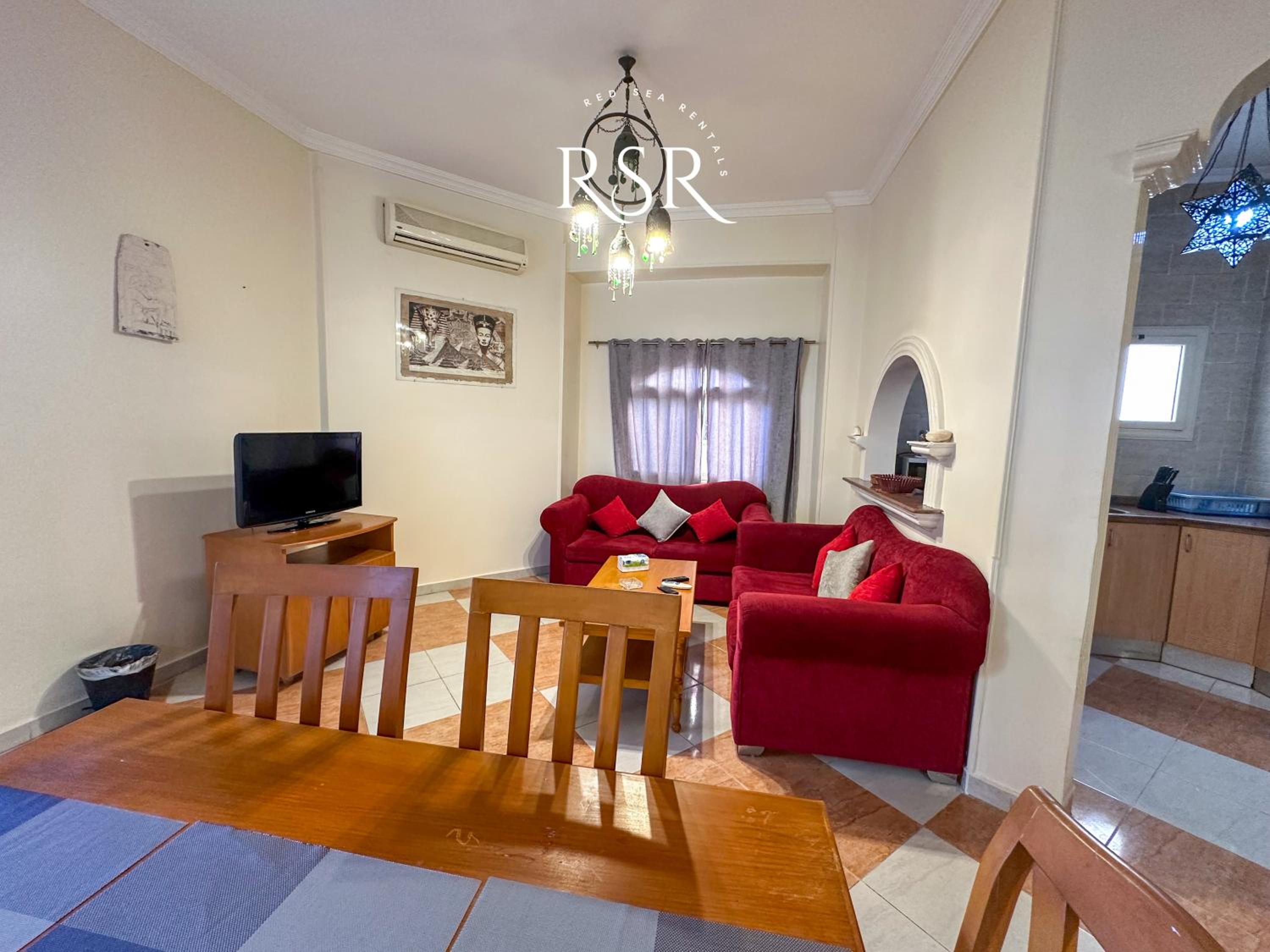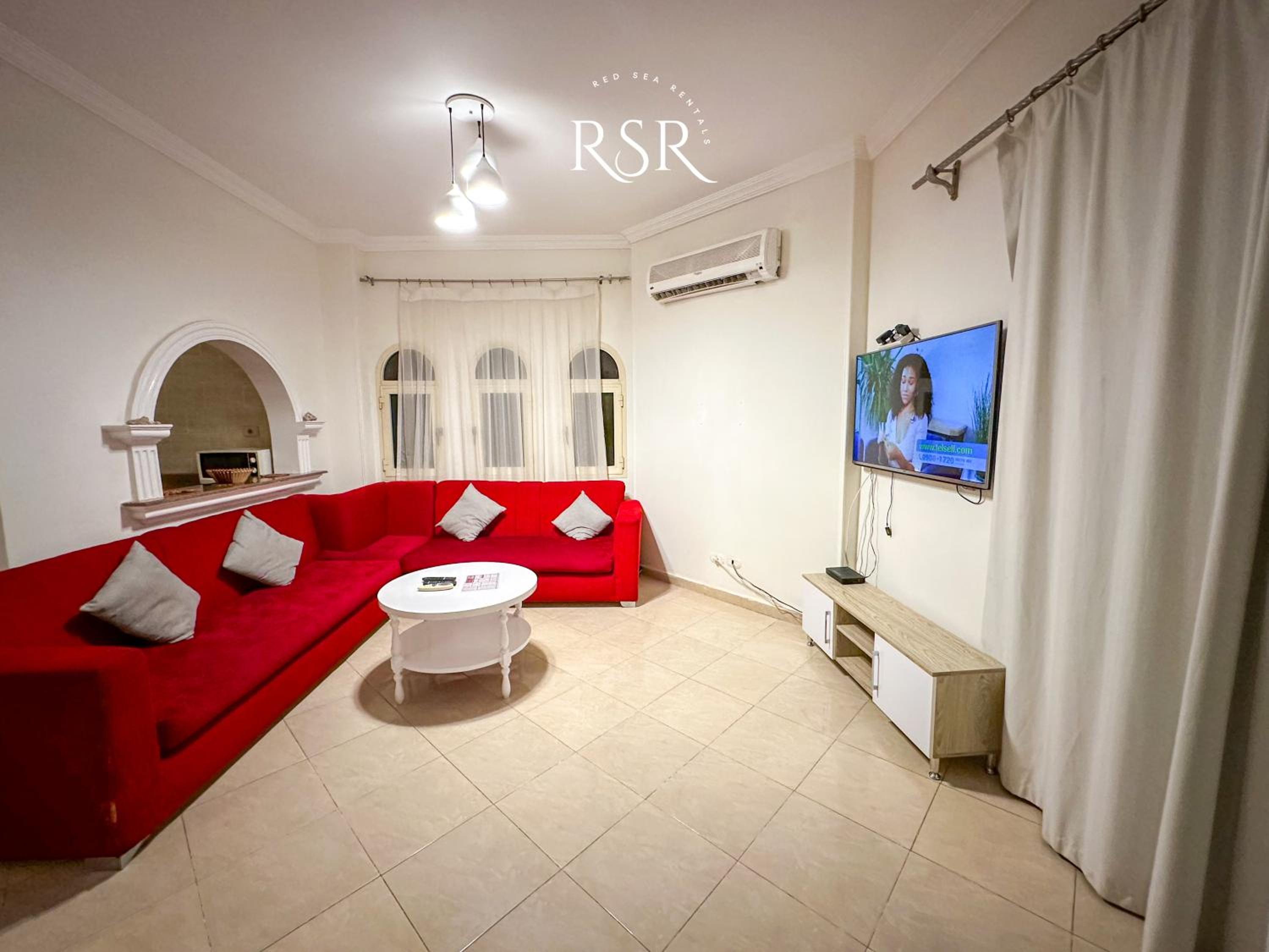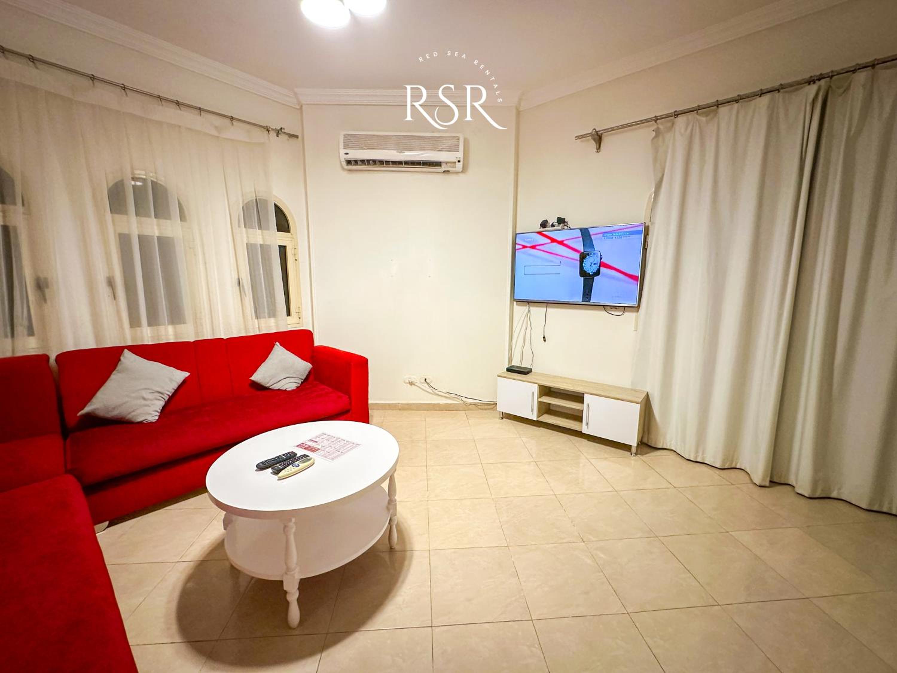 Each air-conditioned apartment is tastefully decorated with tiled floors and vibrant colors, featuring a cozy living room with sofas and a satellite TV for relaxation.
