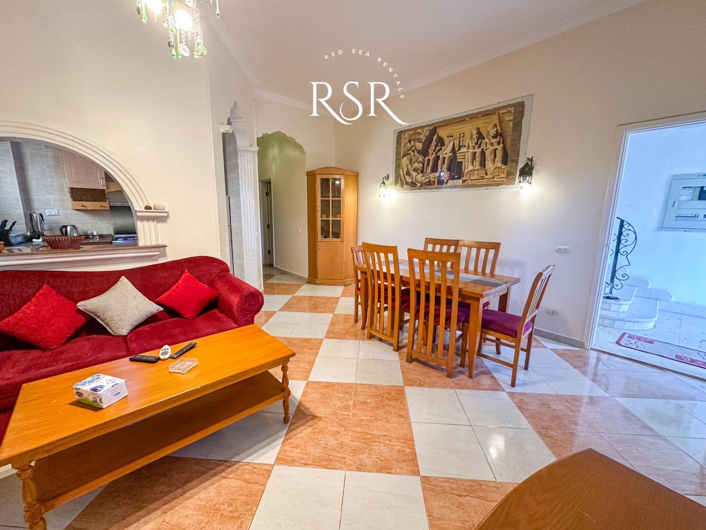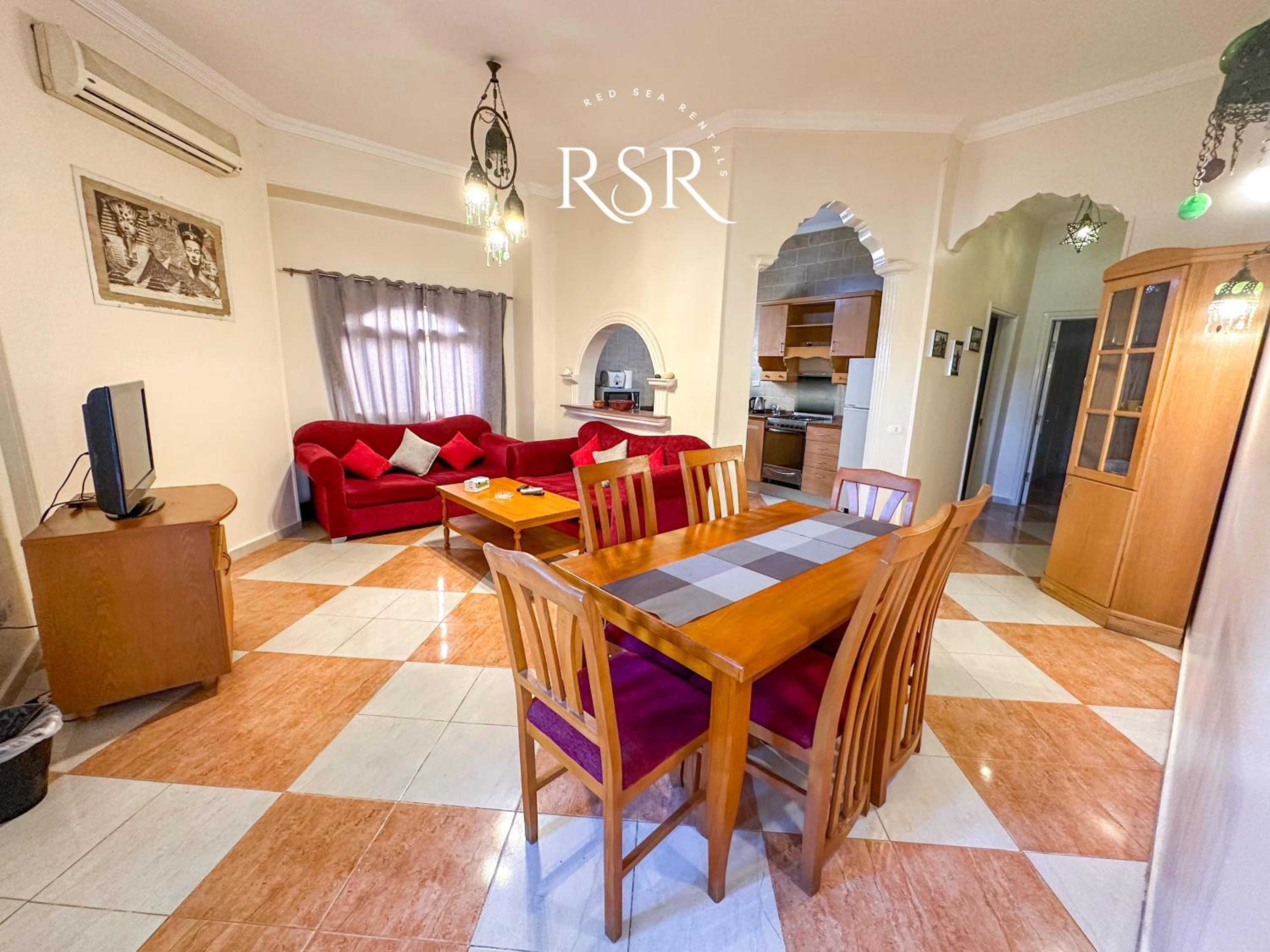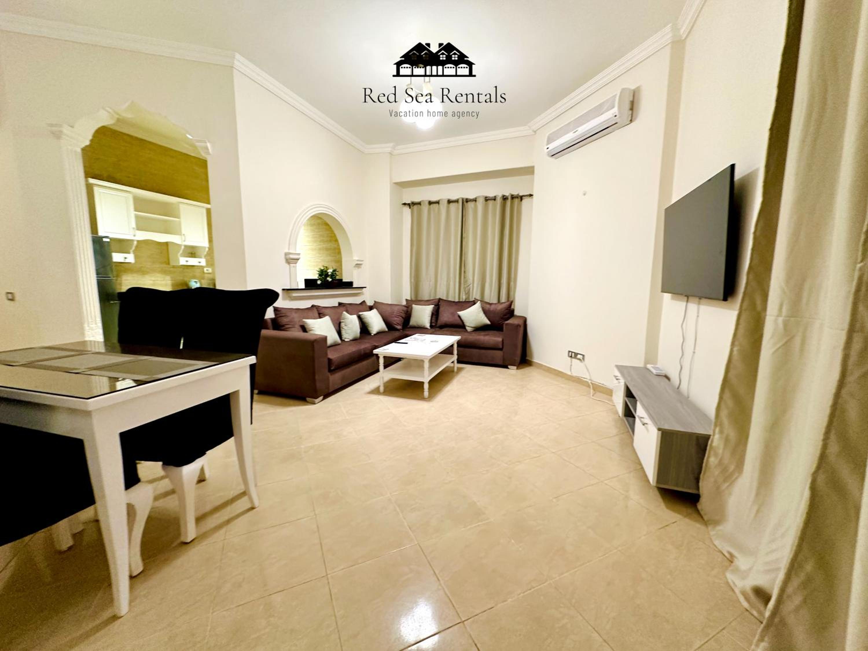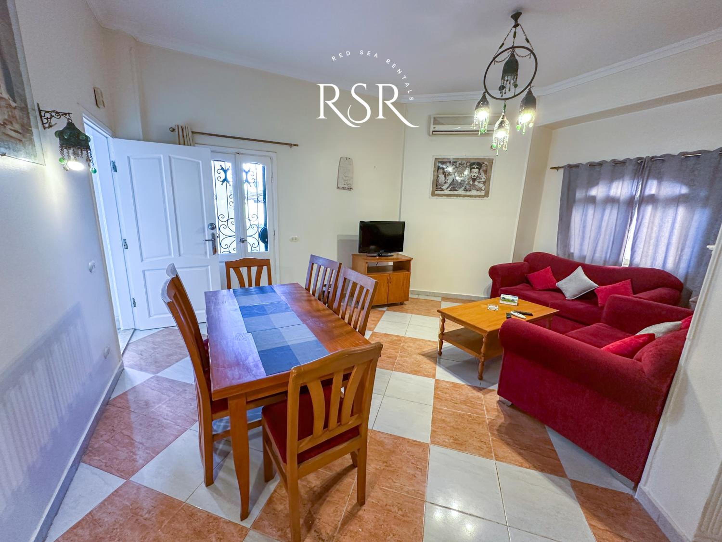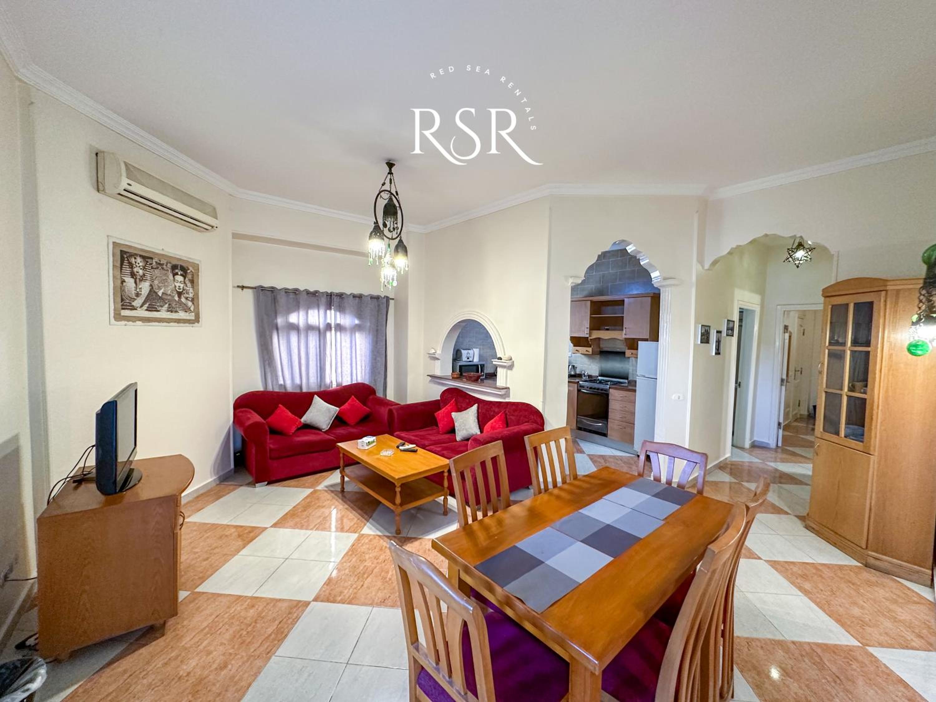 Each air-conditioned apartment is tastefully decorated with tiled floors and vibrant colors, featuring a cozy living room with sofas and a satellite TV for relaxation.
