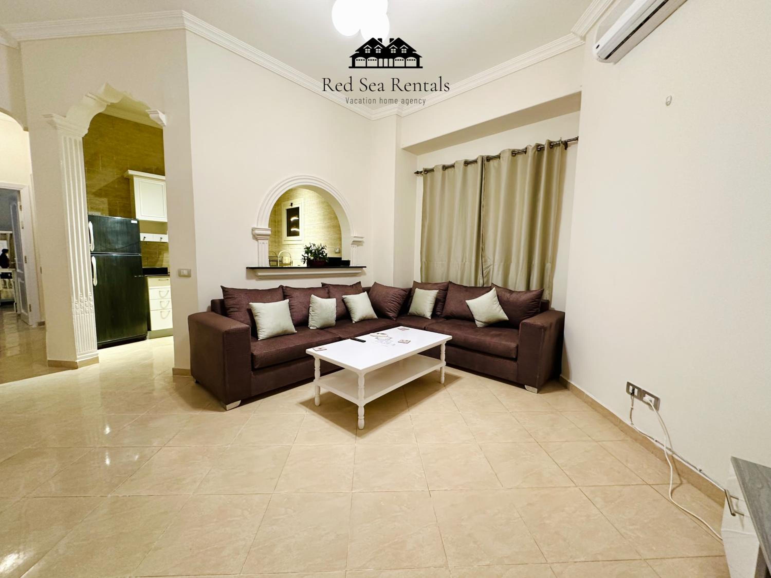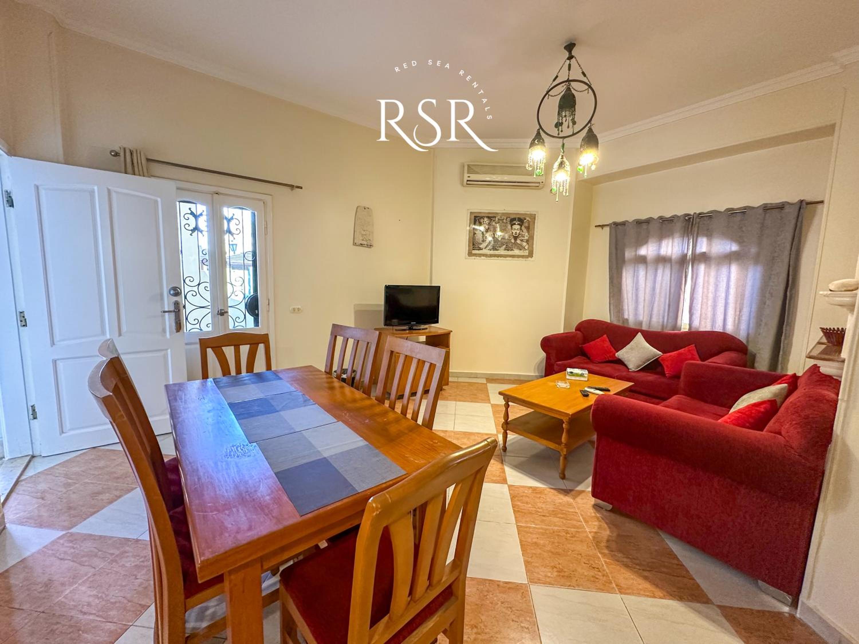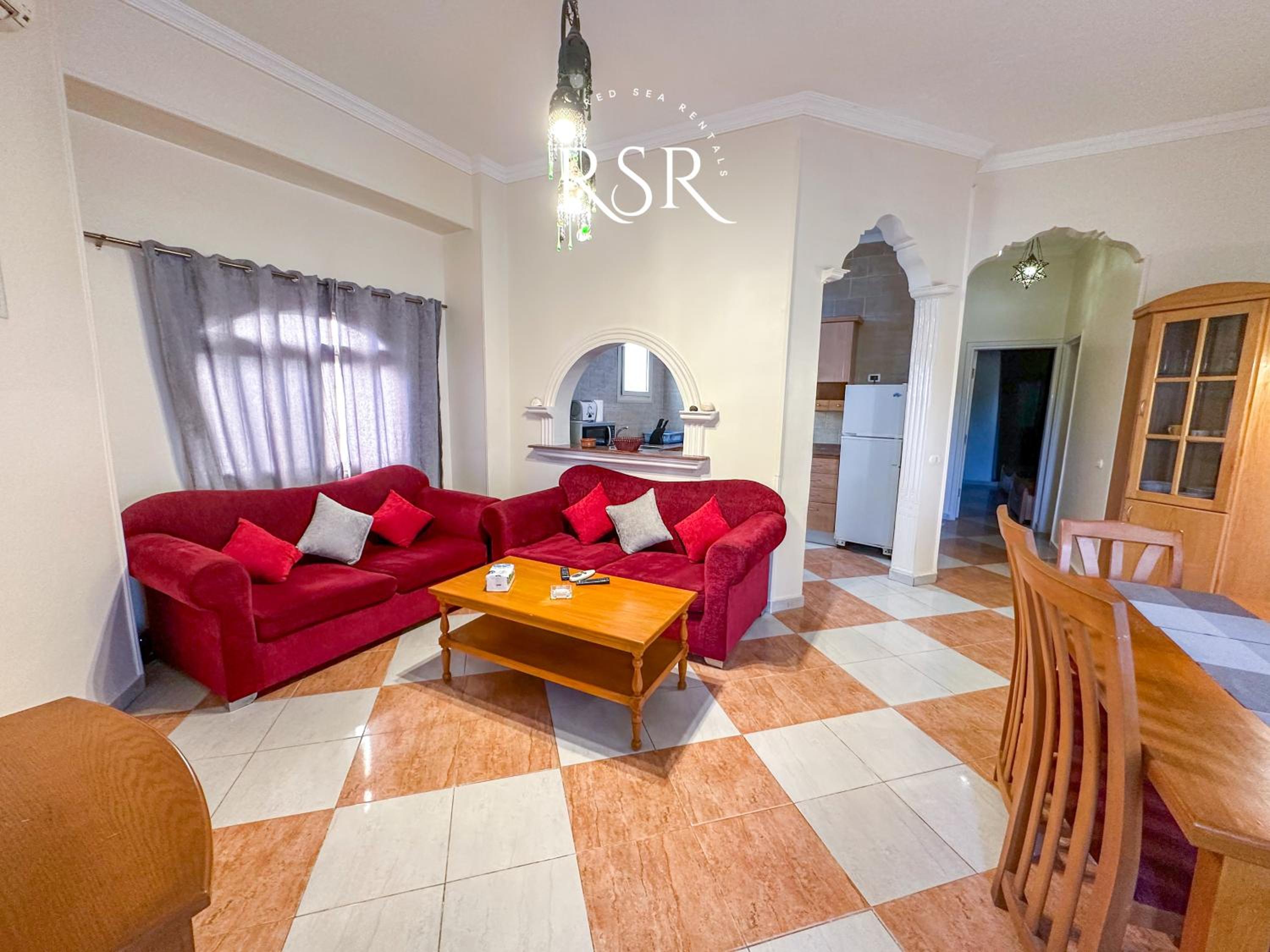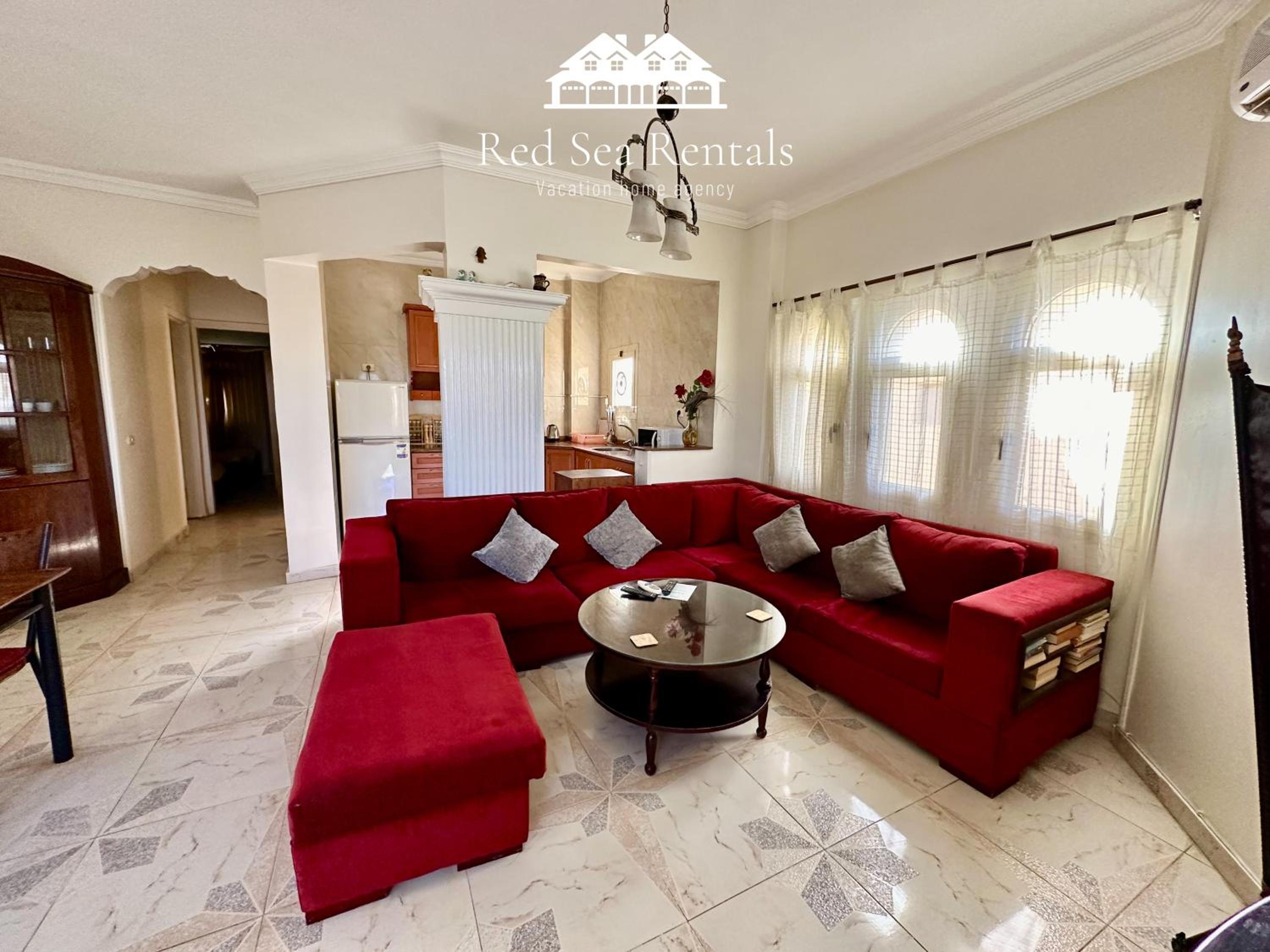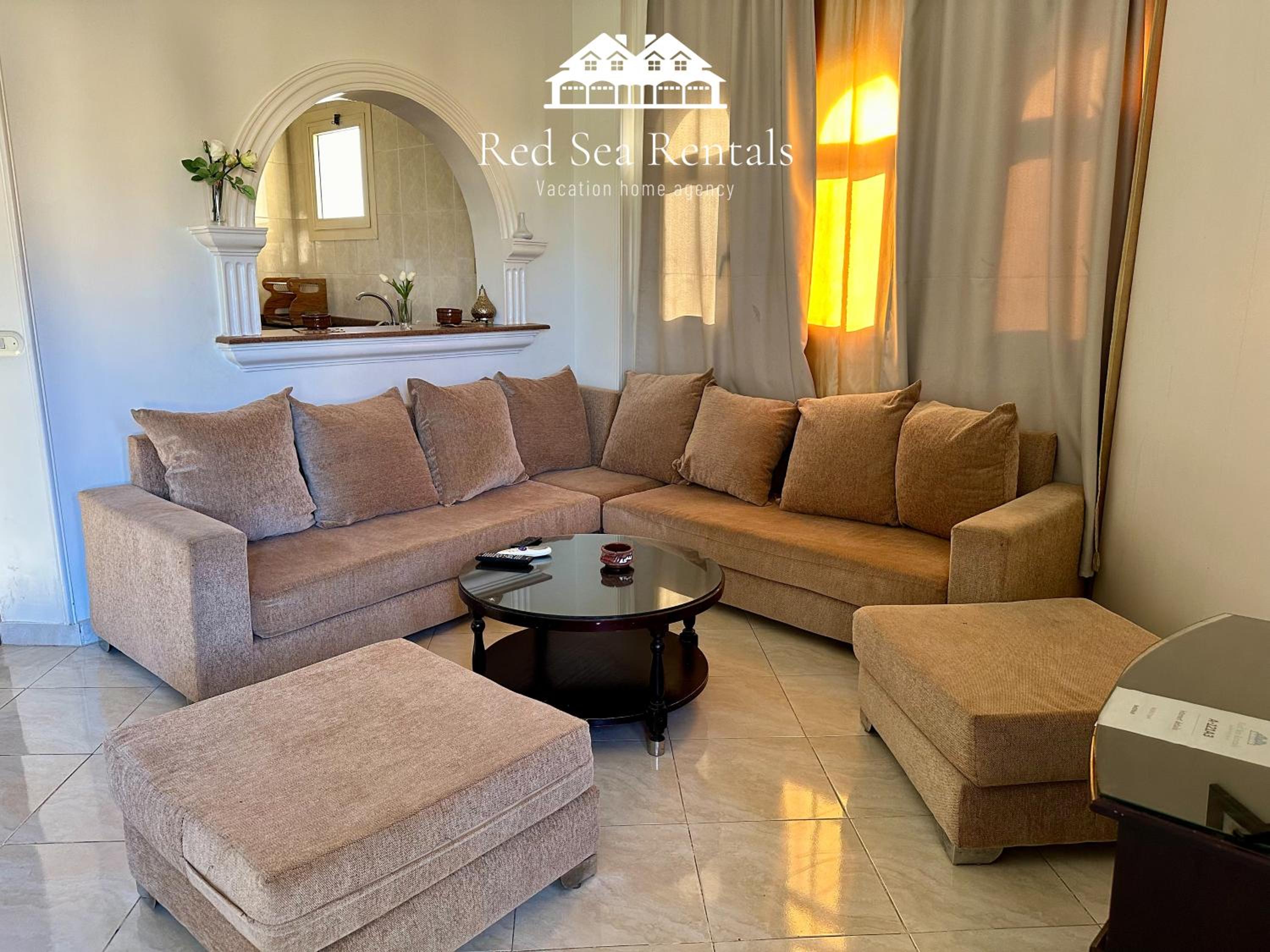 Each air-conditioned apartment is tastefully decorated with tiled floors and vibrant colors, featuring a cozy living room with sofas and a satellite TV for relaxation.
