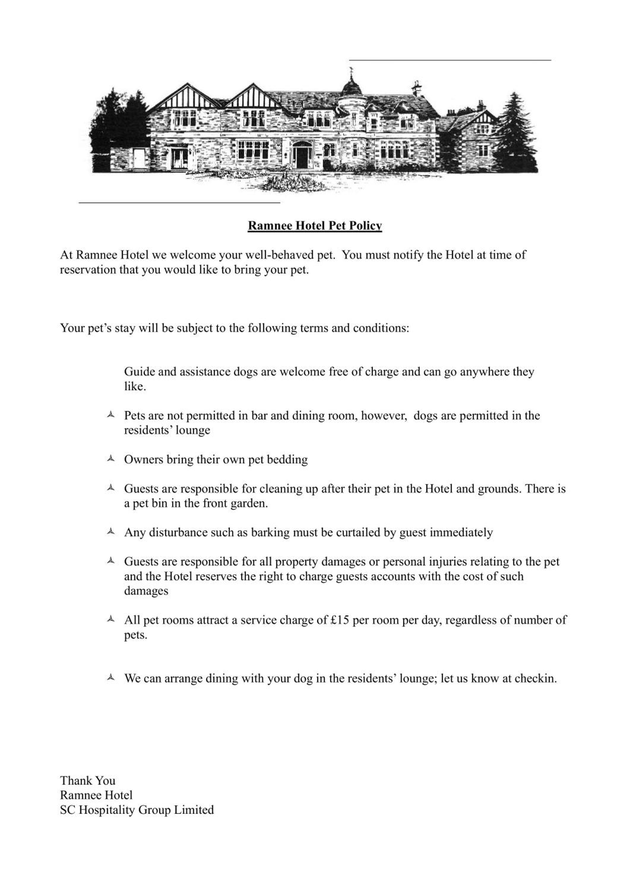 Dogs are allowed at the hotel but guests must inform the property by email before booking. There is a charge of GBP £10 per small dog or £15 per large dog, per night. Please note dogs are not allowed in the bar, restaurant and dining areas.