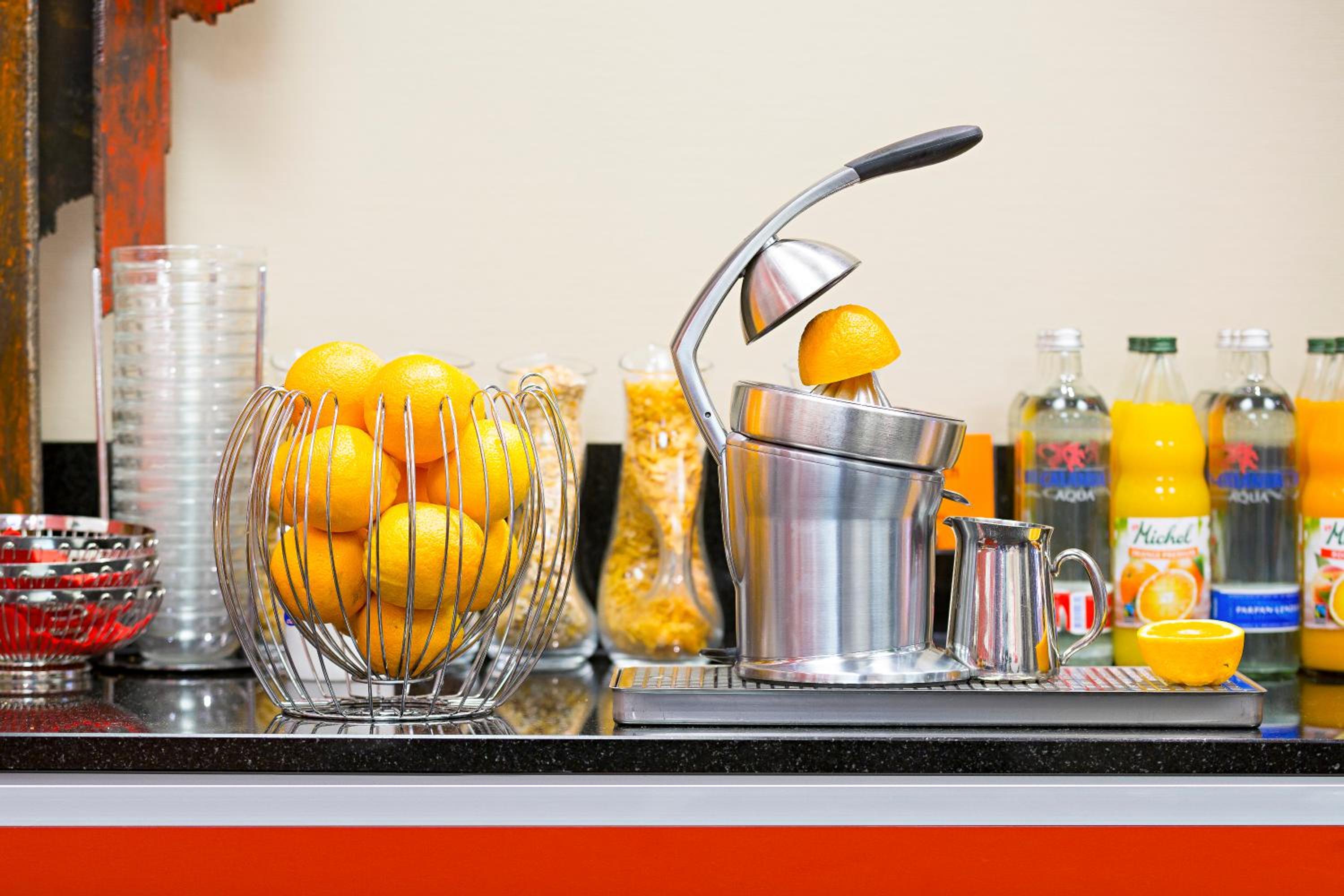Dazu hebt sich das Hotel mit kleinen Innovationen vom Rest ab: Gratis Kaffee-/Tee-/Wasserstation im EG. Beim (guten!) Frühstück gibt es wie in den Schnellrestaurants von Migros und Coop Tablare, auf die Teller und Getränke gestellt und mitgenommen werden können. Das erspart mehrmaliges Hin- und Herlaufen.