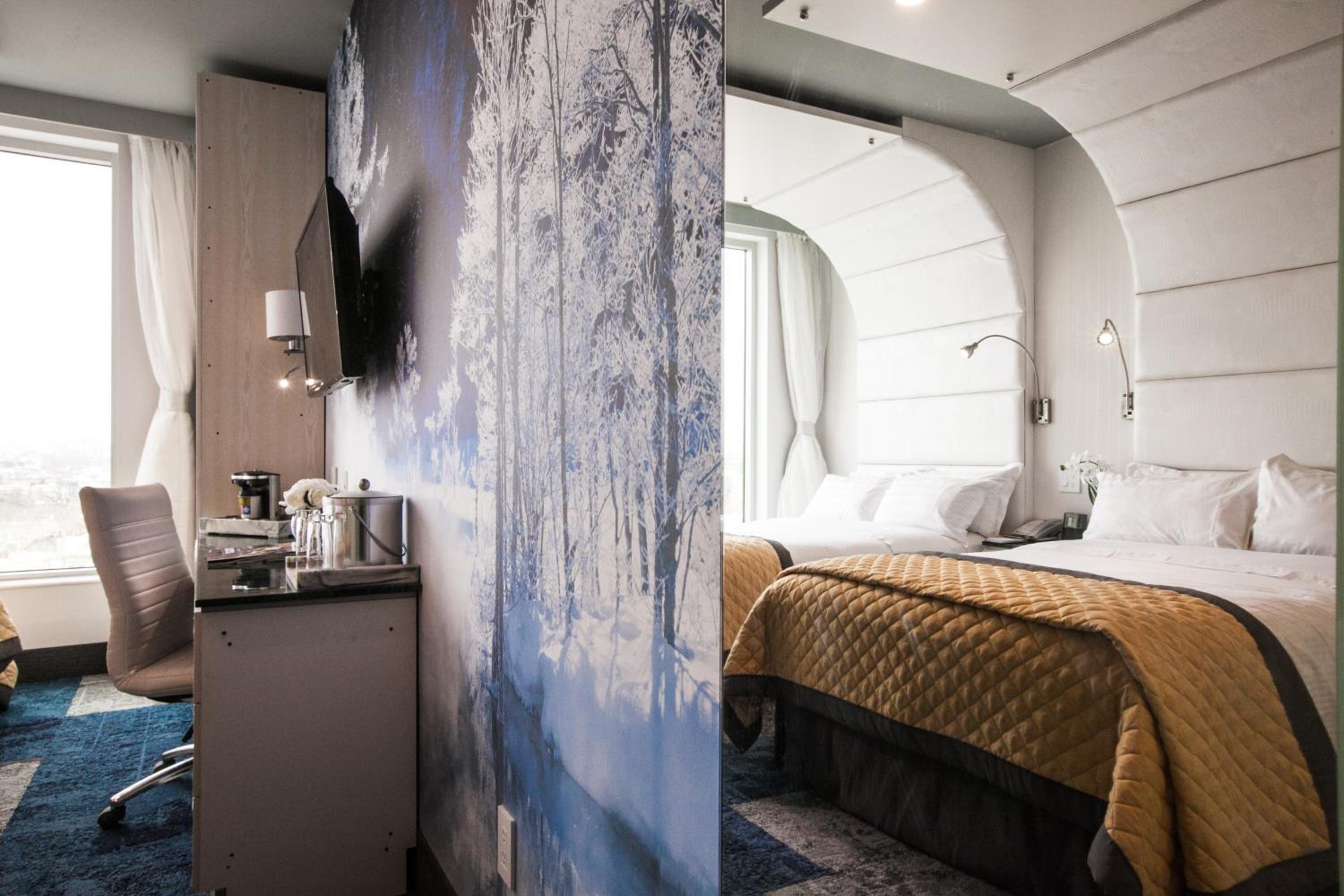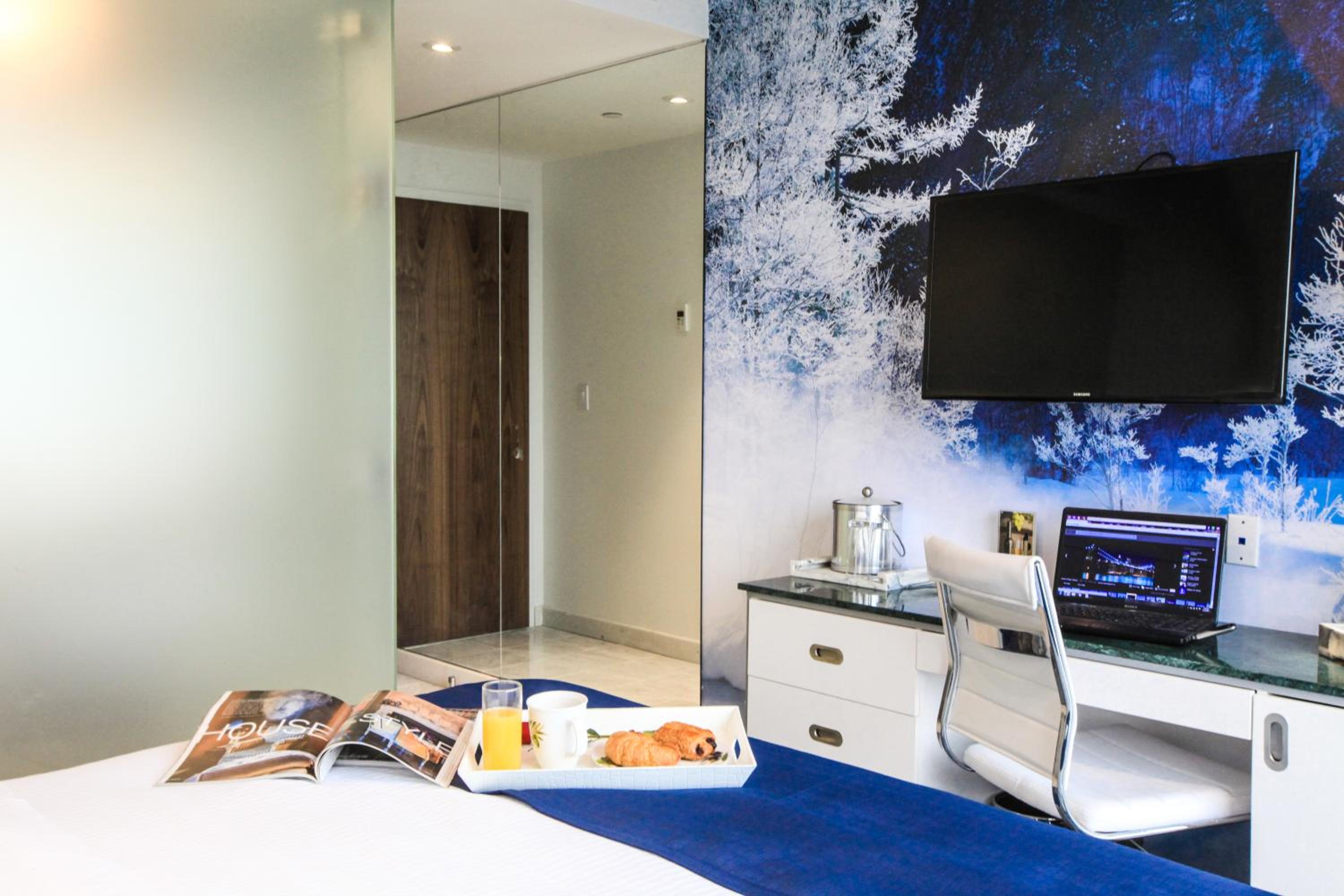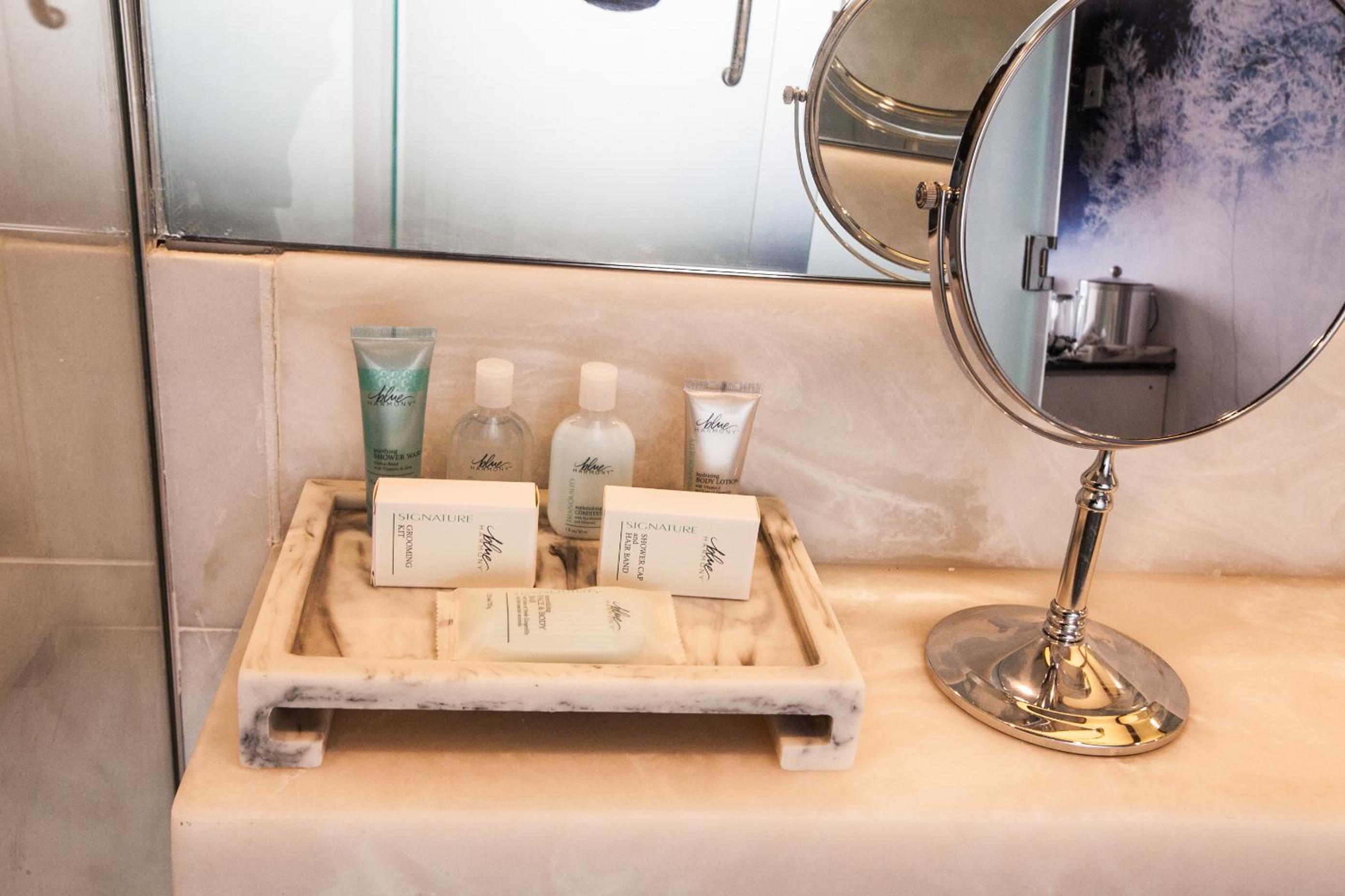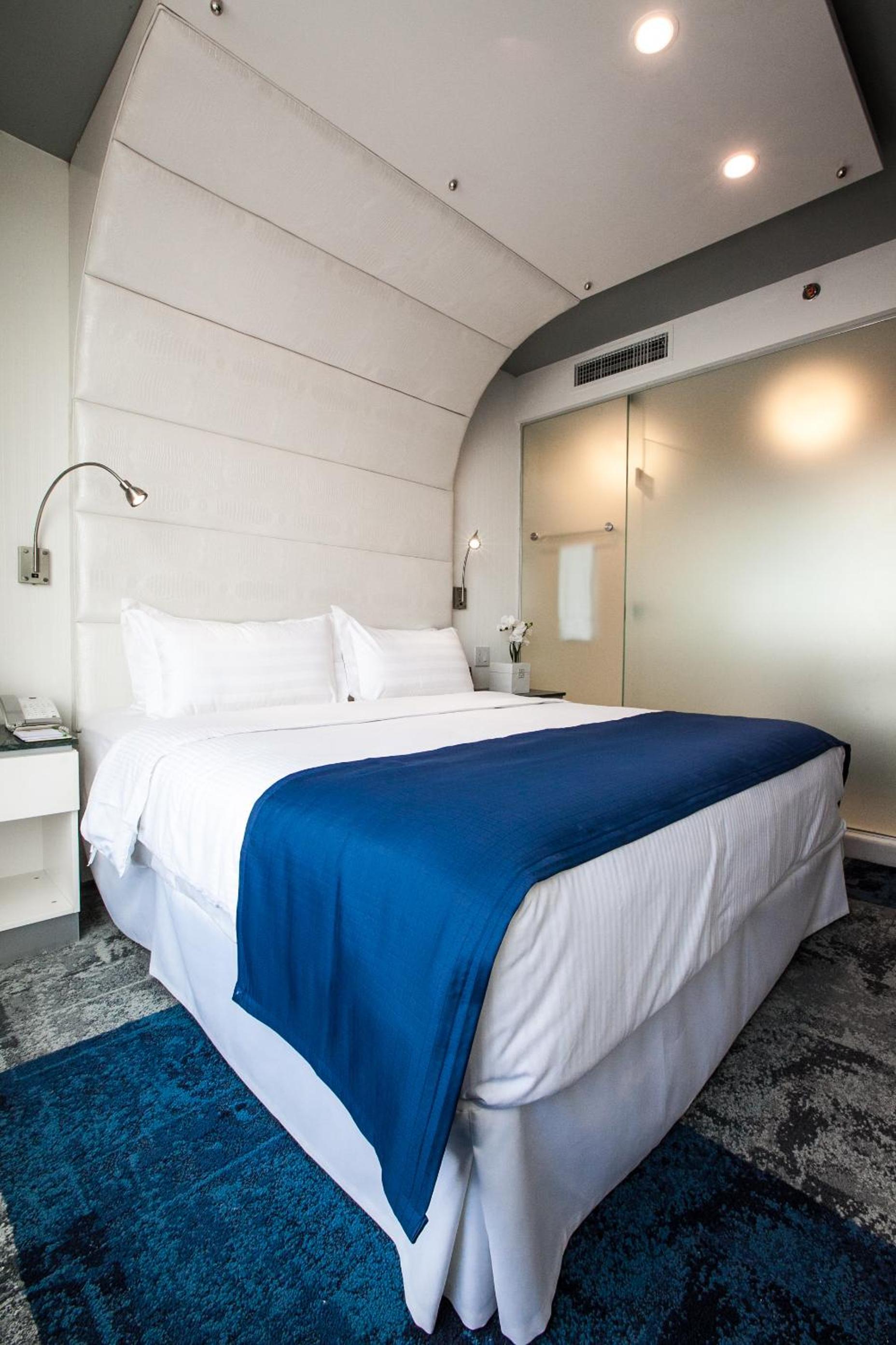 The room was very nice and clean. I was offered an upgrade when I arrived and got a fantastic view of Manhattan from the 7th floor. The glass bathroom is not see through and offers privacy. Also came with a robe and slippers, lots of towels, and full sized shower products. Although room is compact they offer a good bit of storage for belongings. Area around hotel is well lit and has plenty of dining options within walking distance( a few are late hour/ 24 hour). About a 10 minute walk from the subway (a bit uphill from subway to hotel) and passes by a bank. The staff is very friendly and recommend some food options. They do offer early check in for $60 extra.