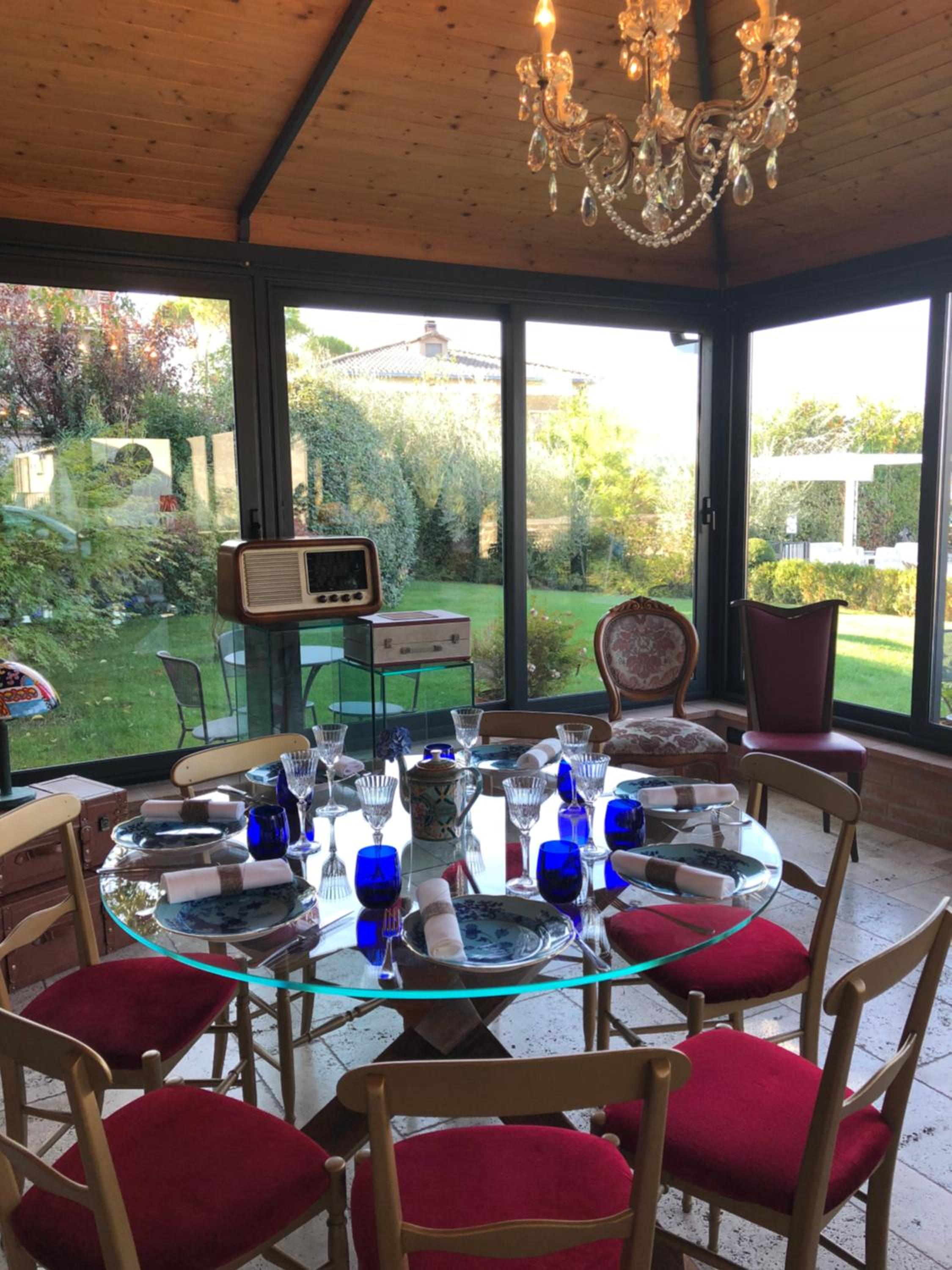 La hall dell'hotel dà un valore aggiunto alla struttura, gazebo chiuso esterno per la colazione con mobili di design e piscina esterna davvero carina.