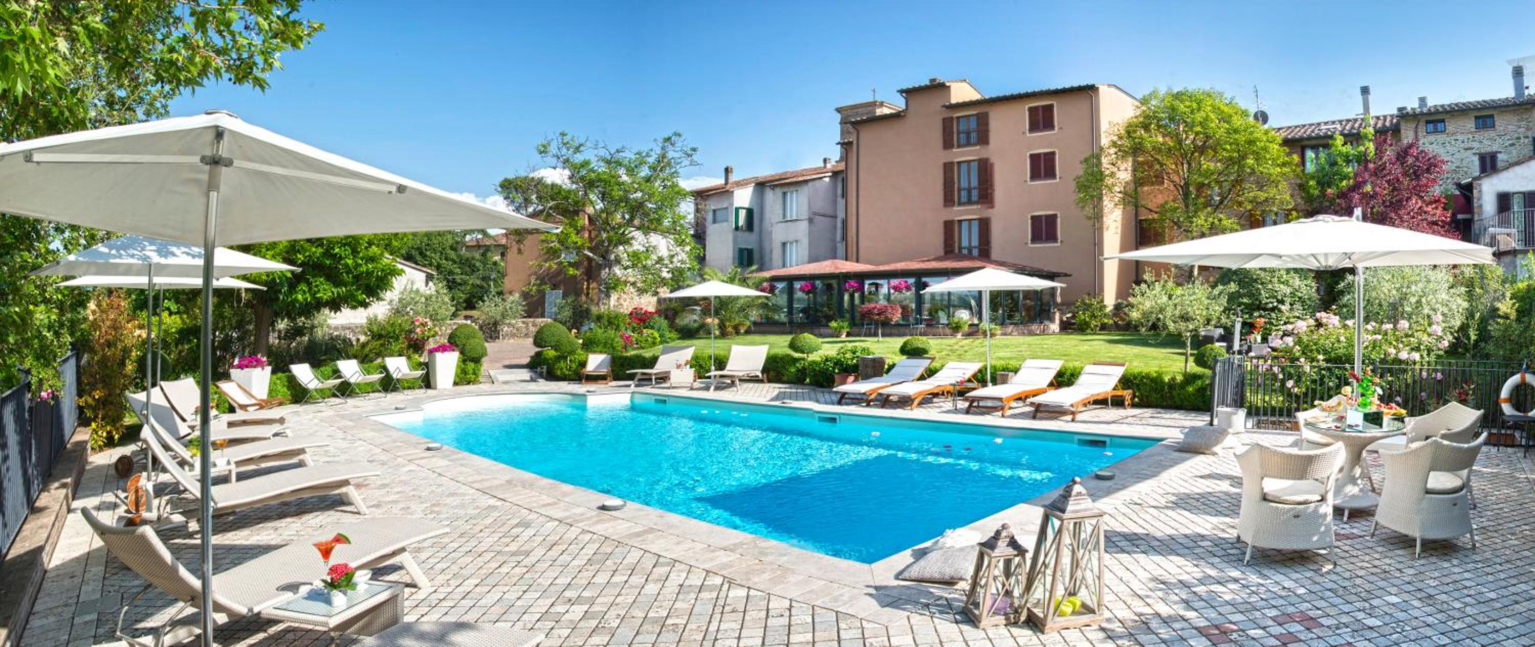 Great hotel with garden area and pool to relax after a day walking hill top towns