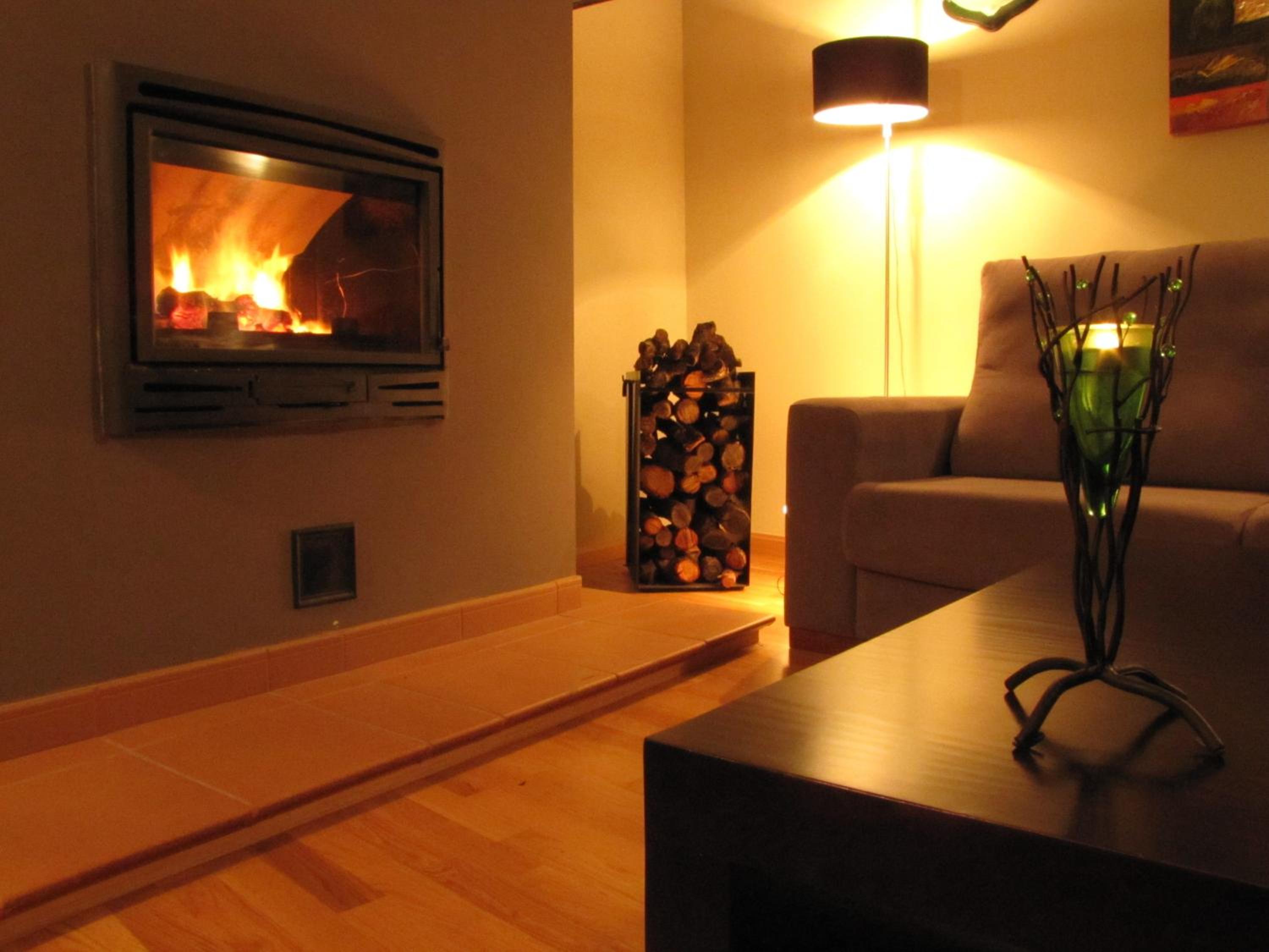 camas individuales y chimenea sin leña