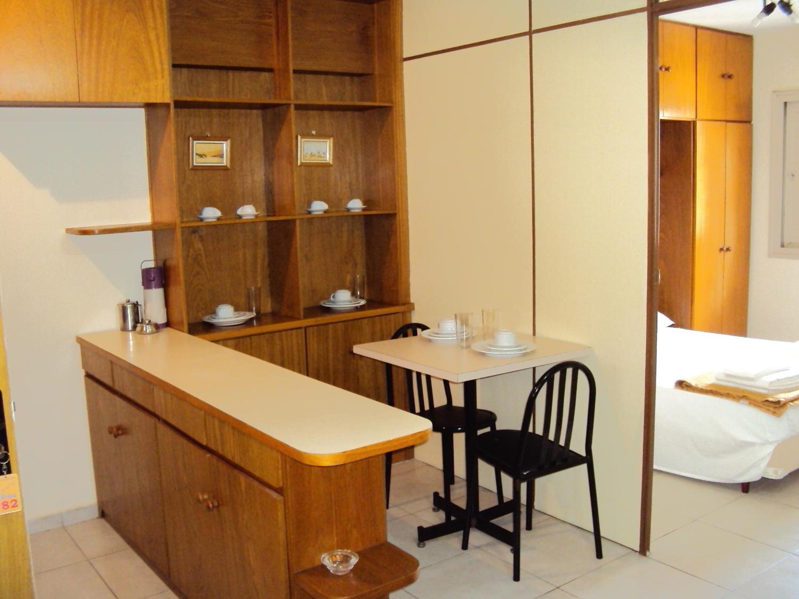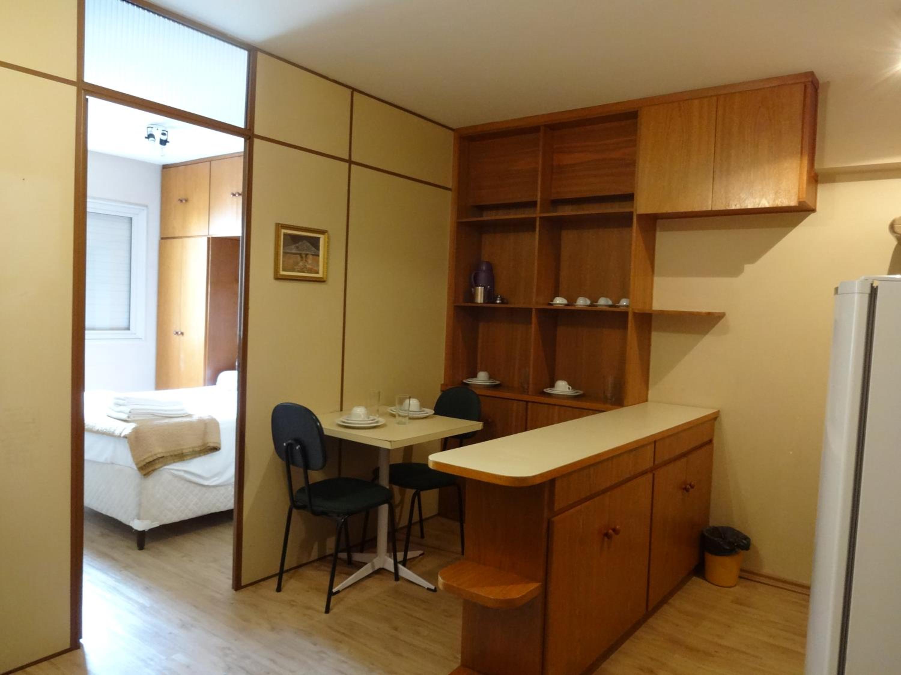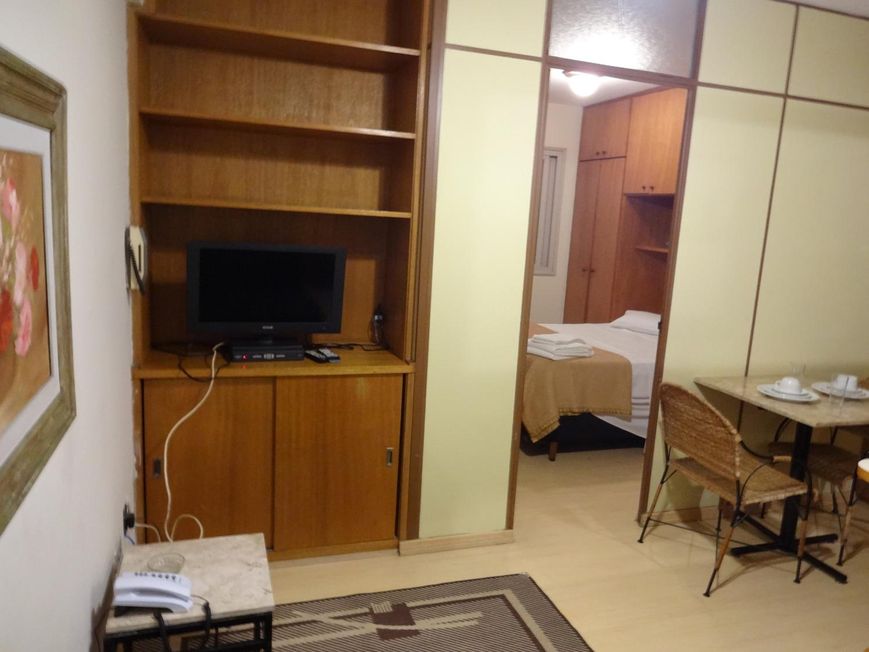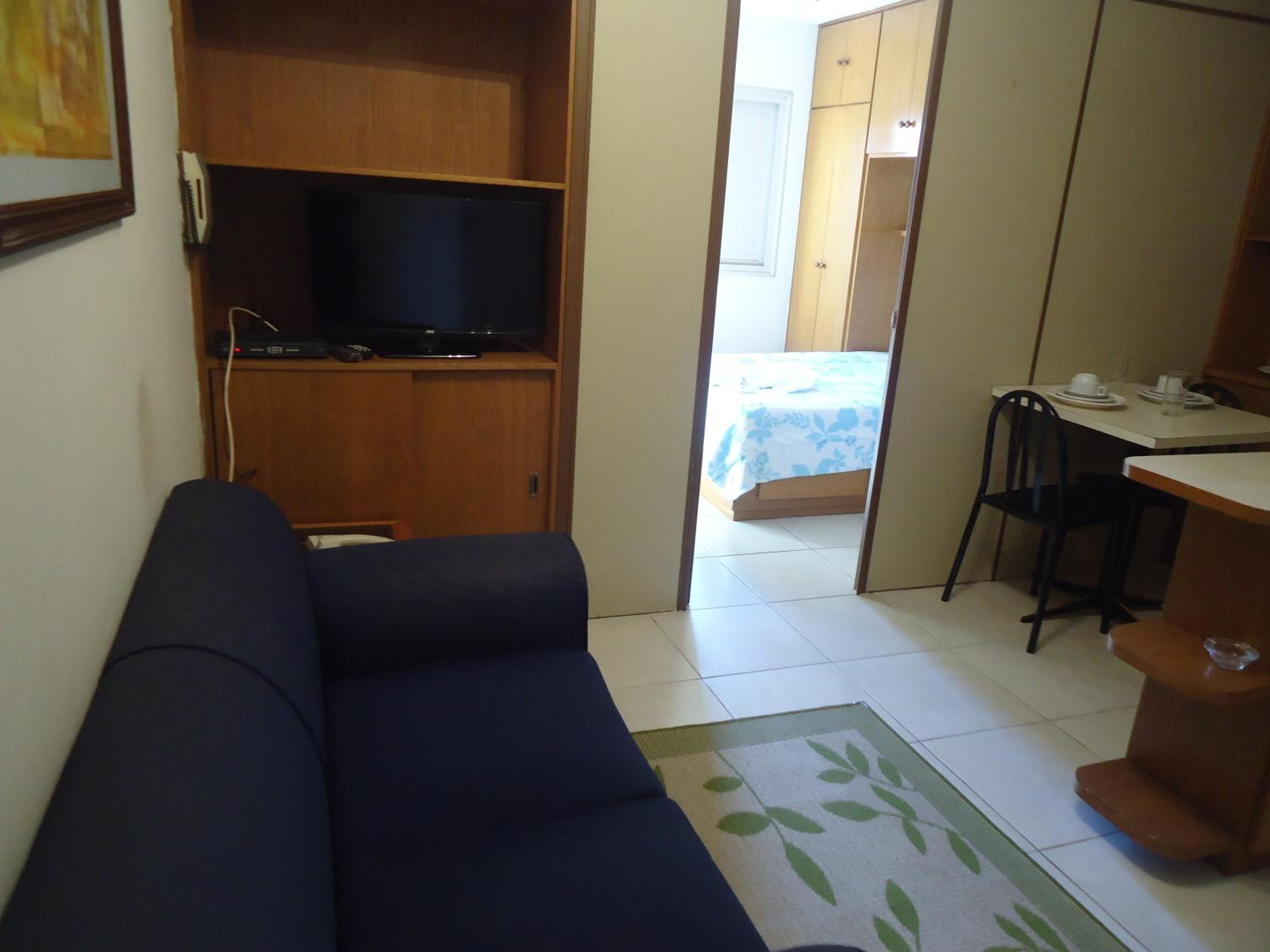 Na sala tem um sofa, uma cama de solteiro, tv , a cozinha é junto com a sala . Tem fogão , microondas , geladeira e utensílios básicos para se usar. Fizemos algumas refeições lá .. coisa simples O quarto tem uma cama de casal bem gde , tipo king ... Armário (antigo) , ar condicionado .