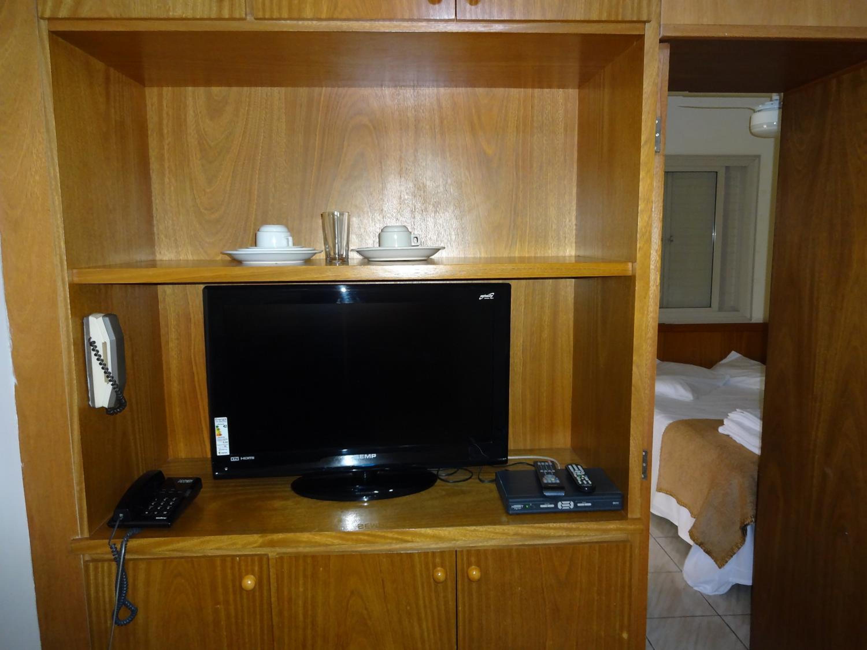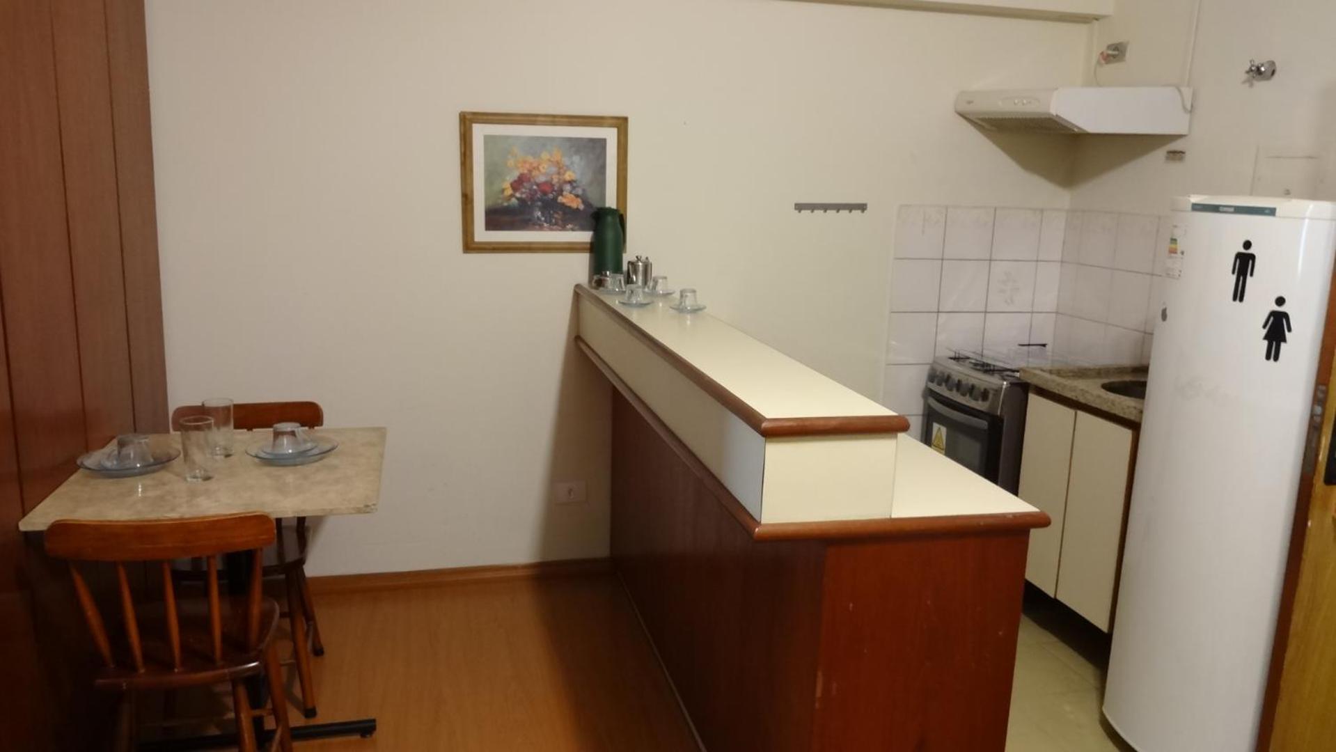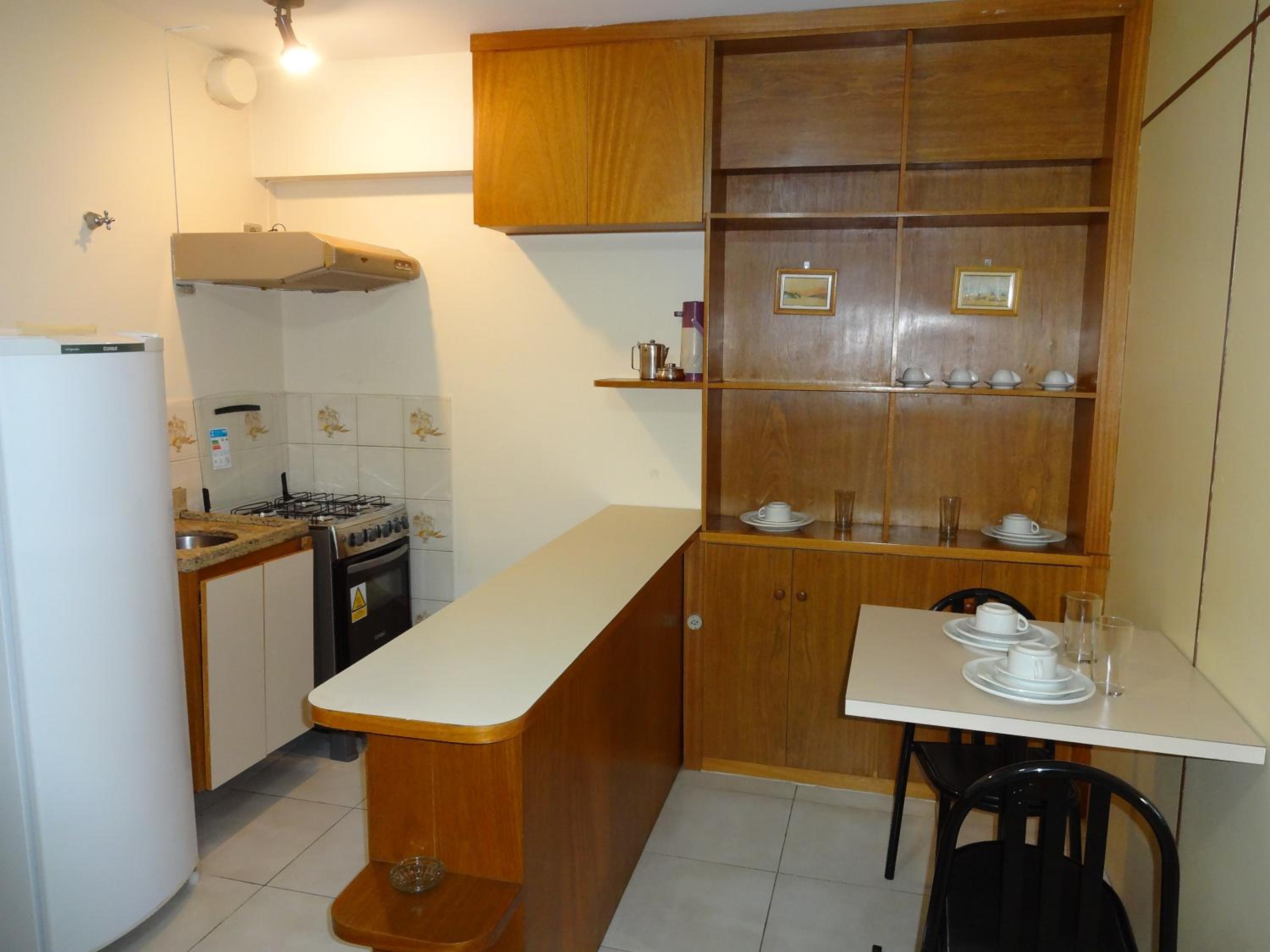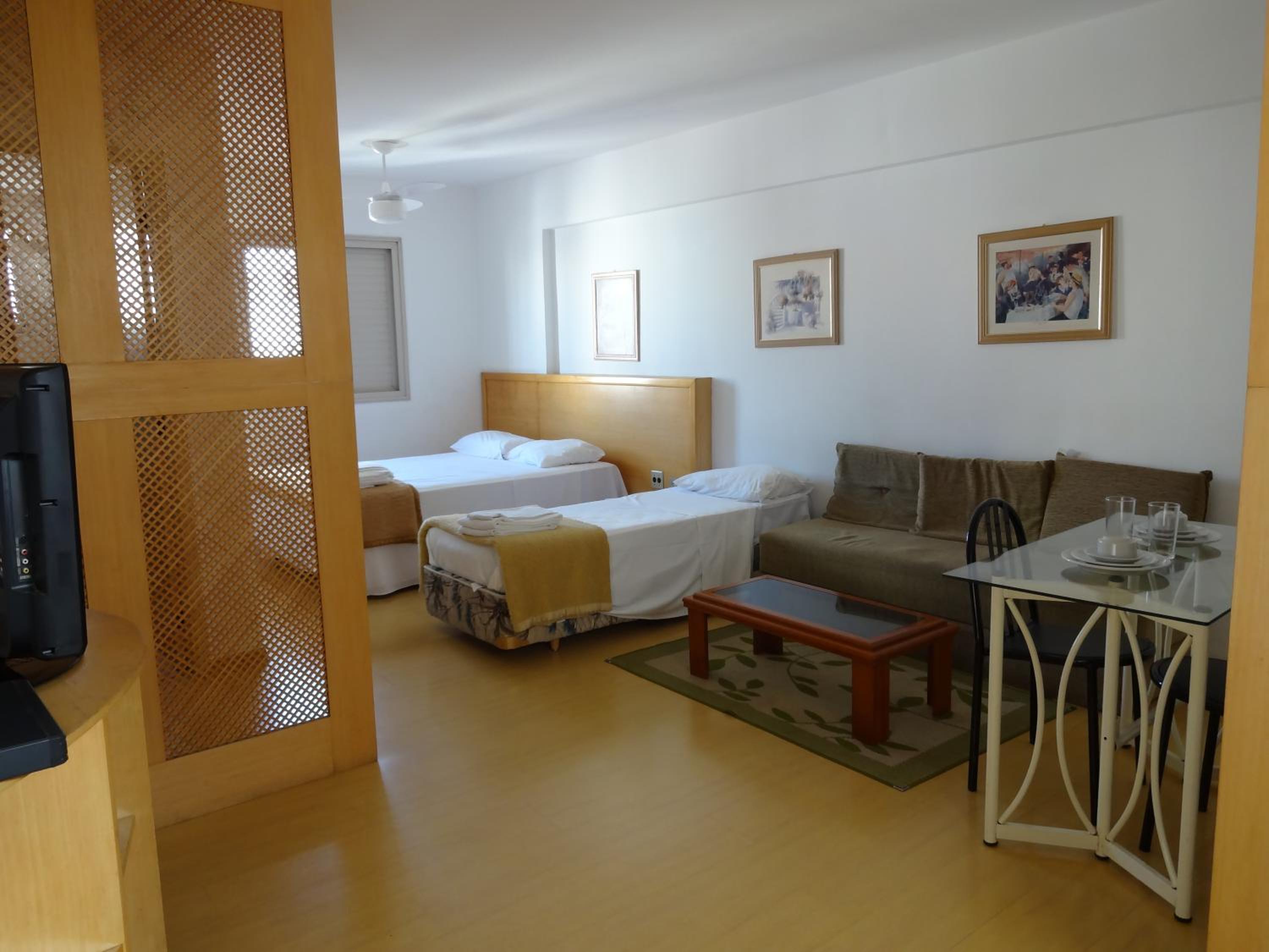 Na sala tem um sofa, uma cama de solteiro, tv , a cozinha é junto com a sala . Tem fogão , microondas , geladeira e utensílios básicos para se usar. Fizemos algumas refeições lá .. coisa simples O quarto tem uma cama de casal bem gde , tipo king ... Armário (antigo) , ar condicionado .