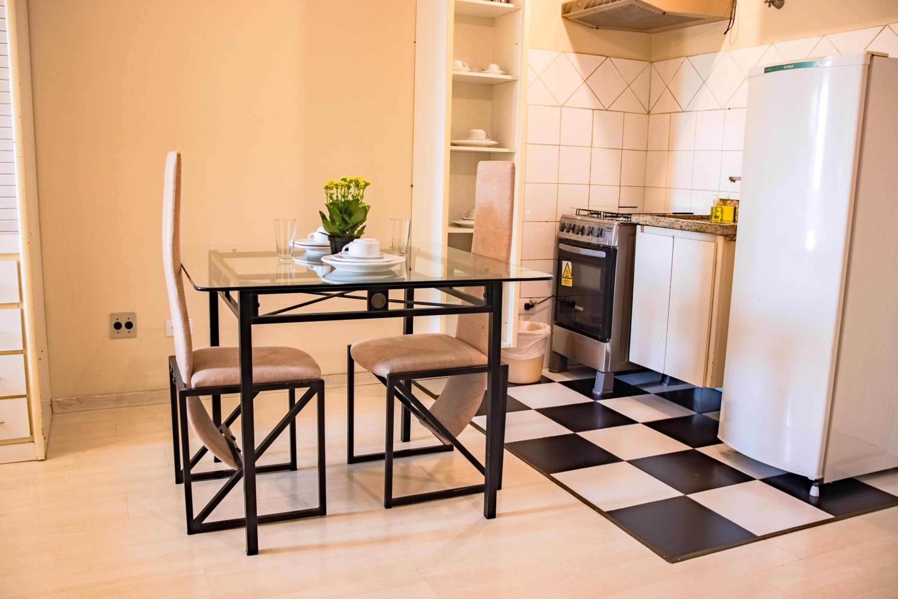 As instalações são bastante antigas, precisando de modernização, sobretudo na cozinha. Iluminacao ruim, sem abajur no quarto, pouca tomada. Mesa de jantar com cadeiras muito antigas e ruins de sentar para trabalhar/estudar. Poucas panelas, não tinha um tabuleiro para usar o forno, tive que fazer pão de queijo no prato, tudo bem antigo. Academia pobrinha, colchão velho.