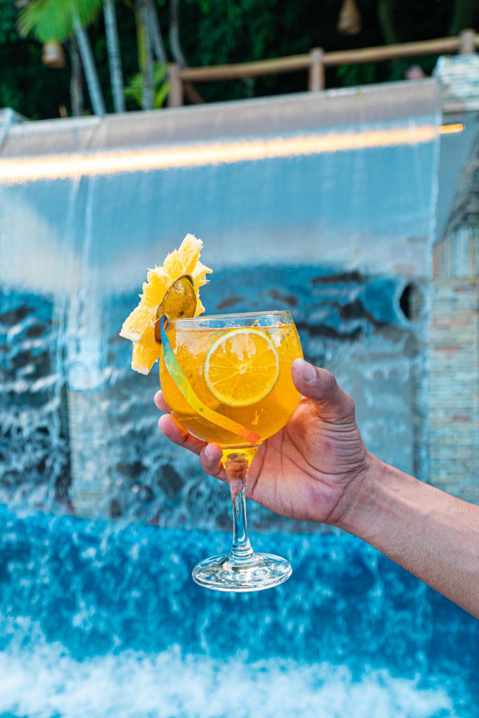 The pool with waterfall and breakfast