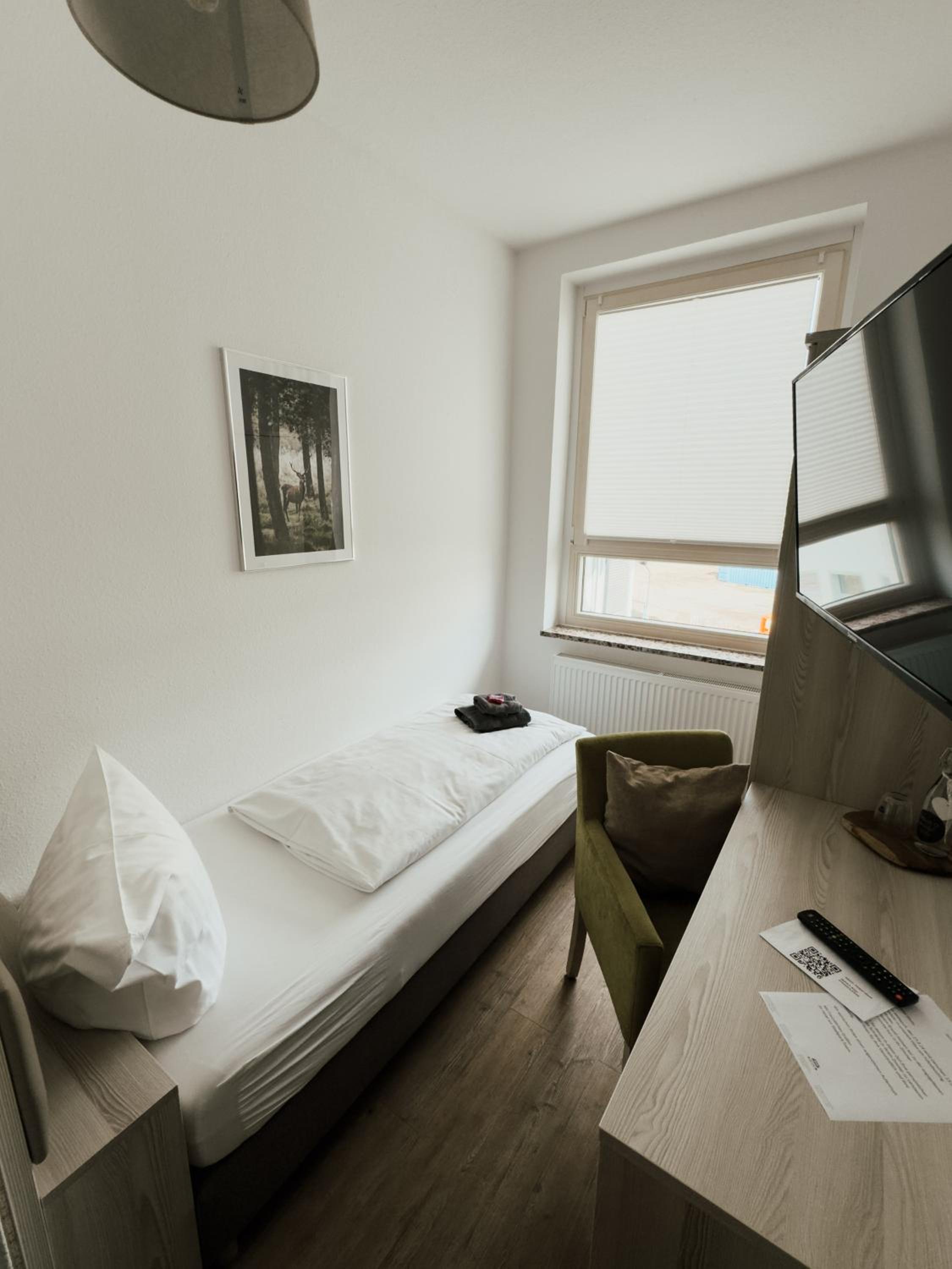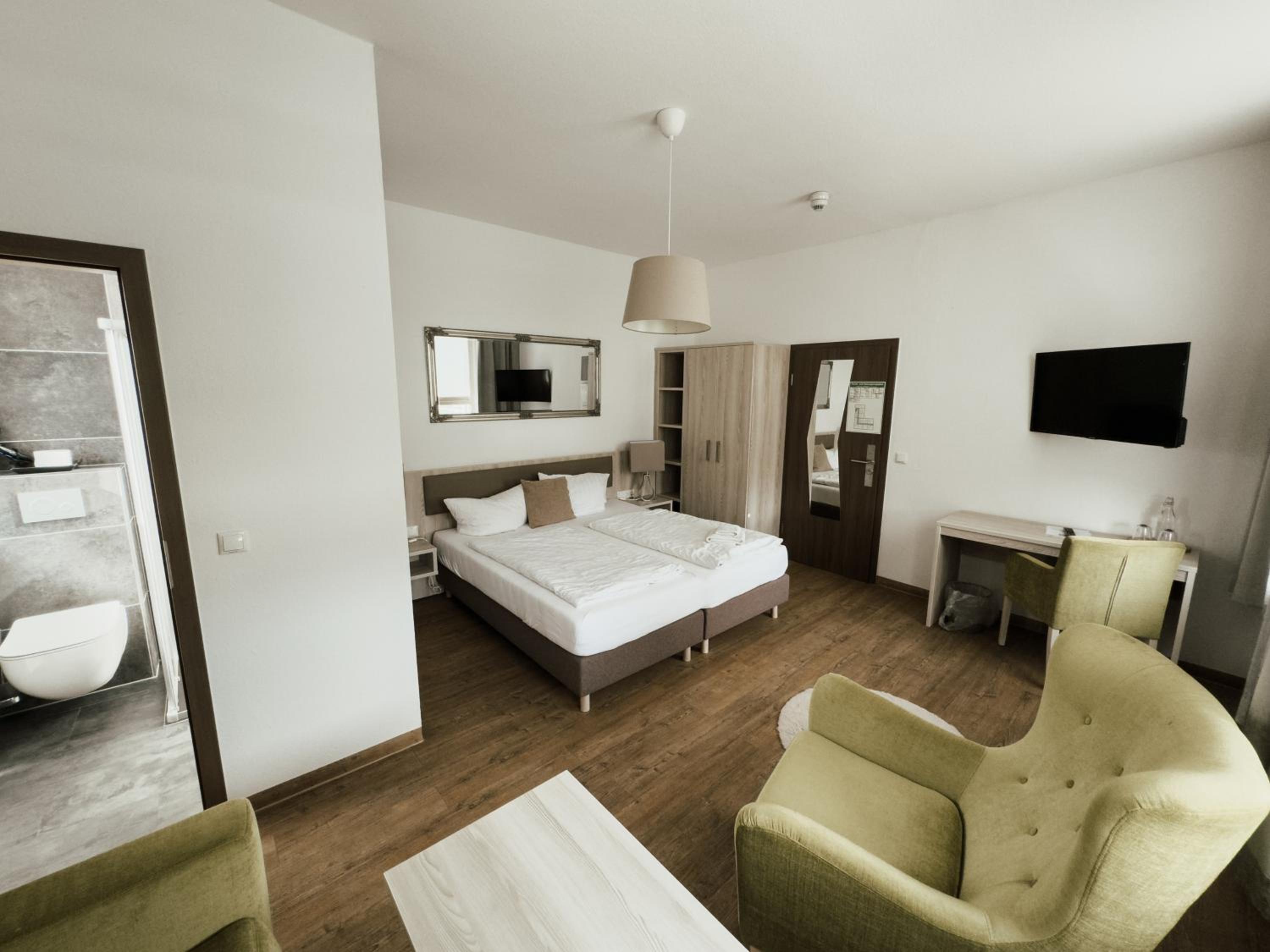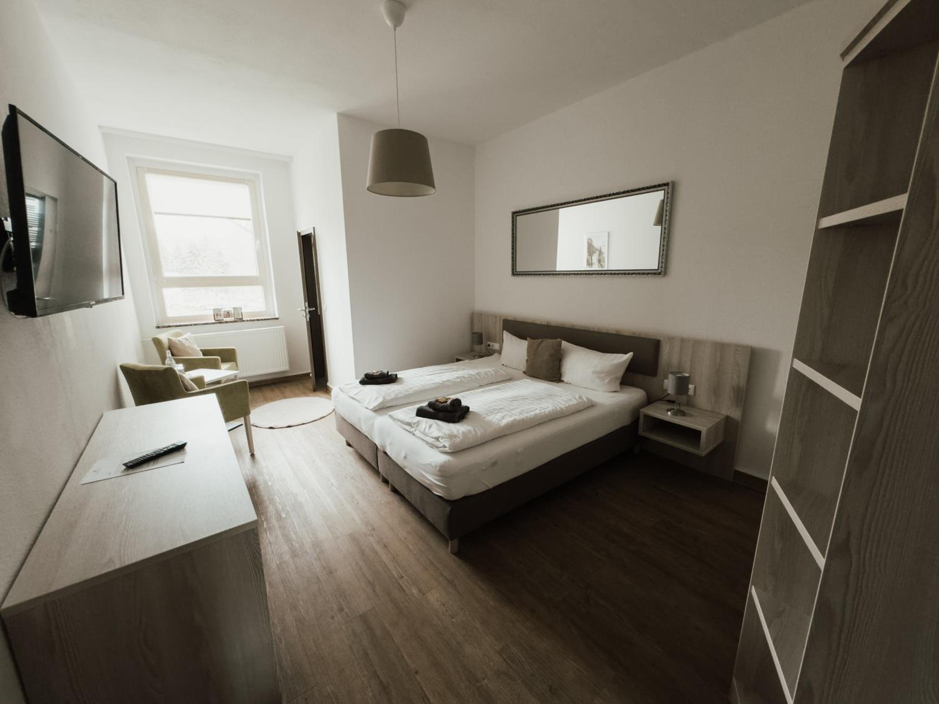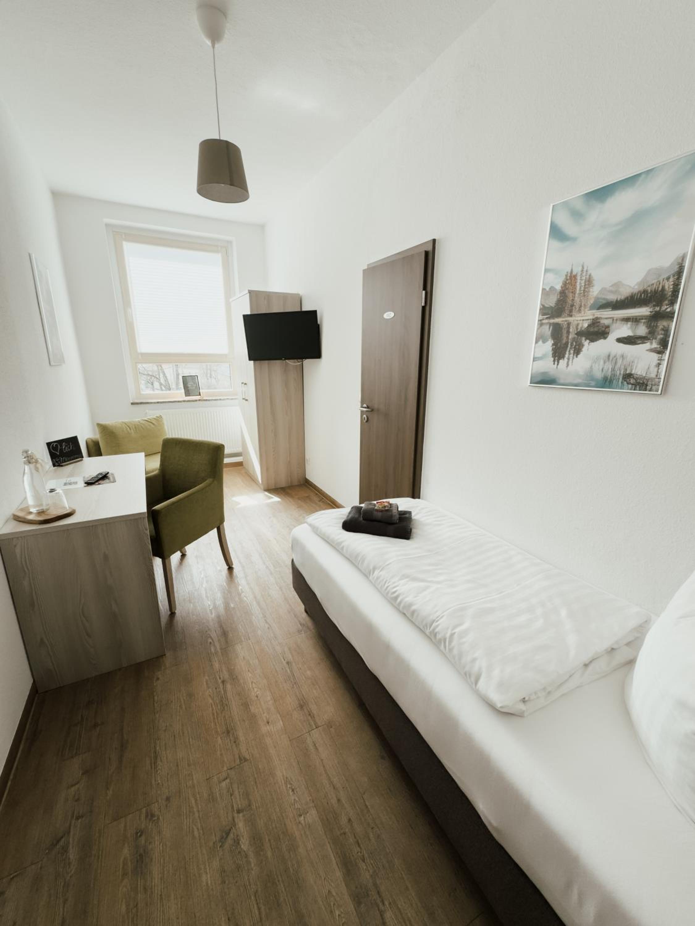 Spacious location with lots of nature and a big park, parking place for guests, friendly staff, luxurious room. Promising views on old center if Nordhausen.