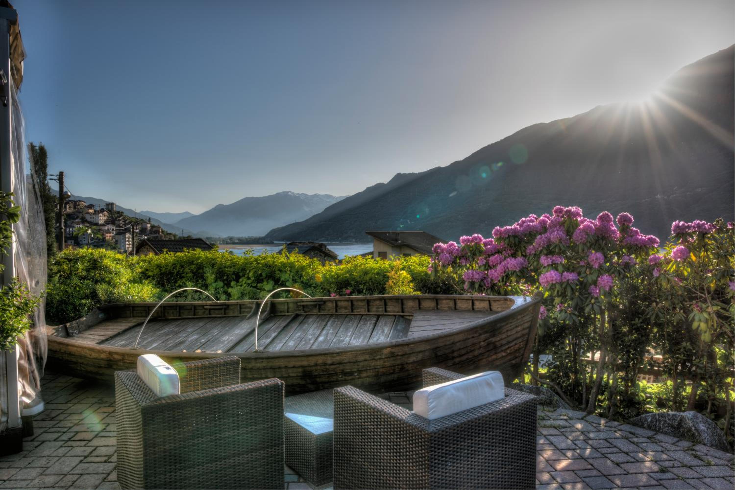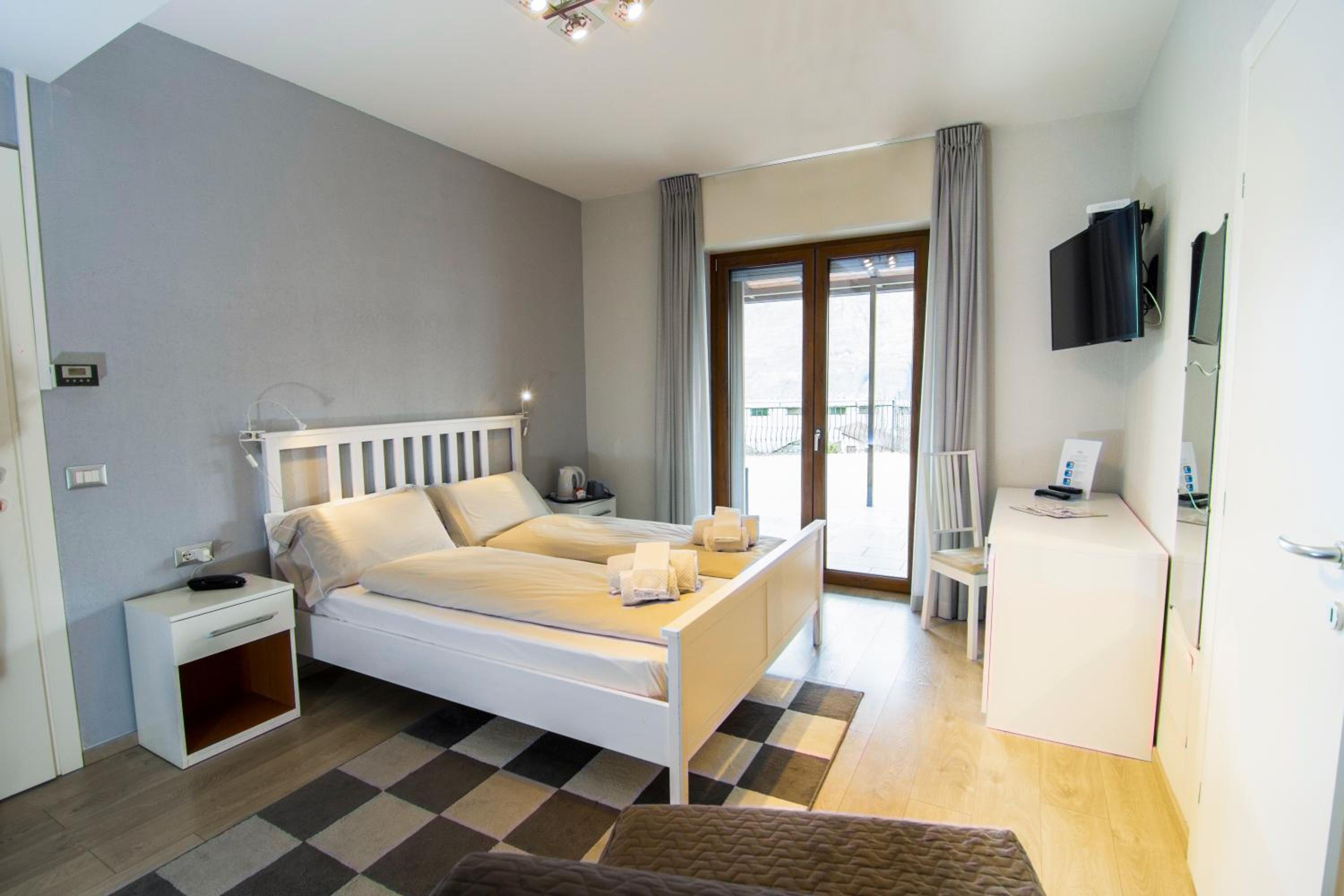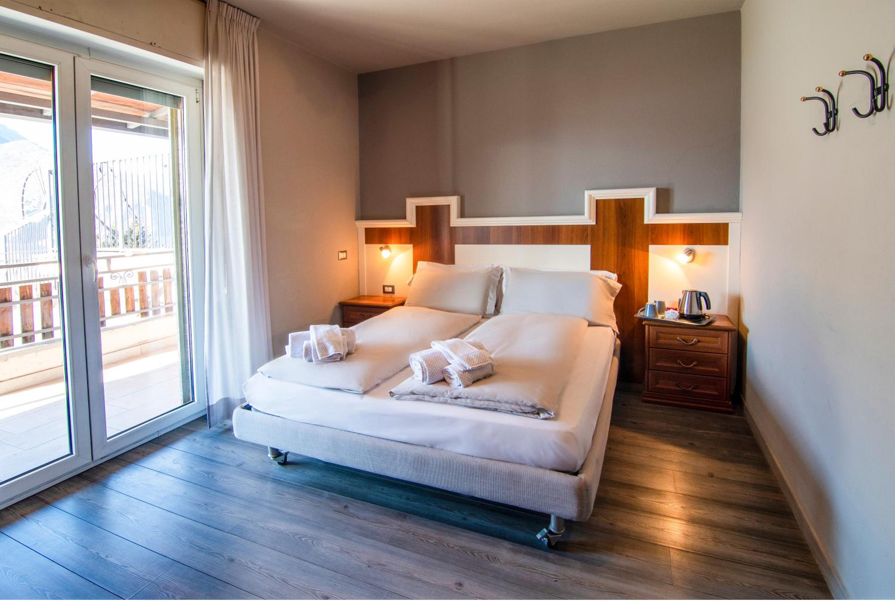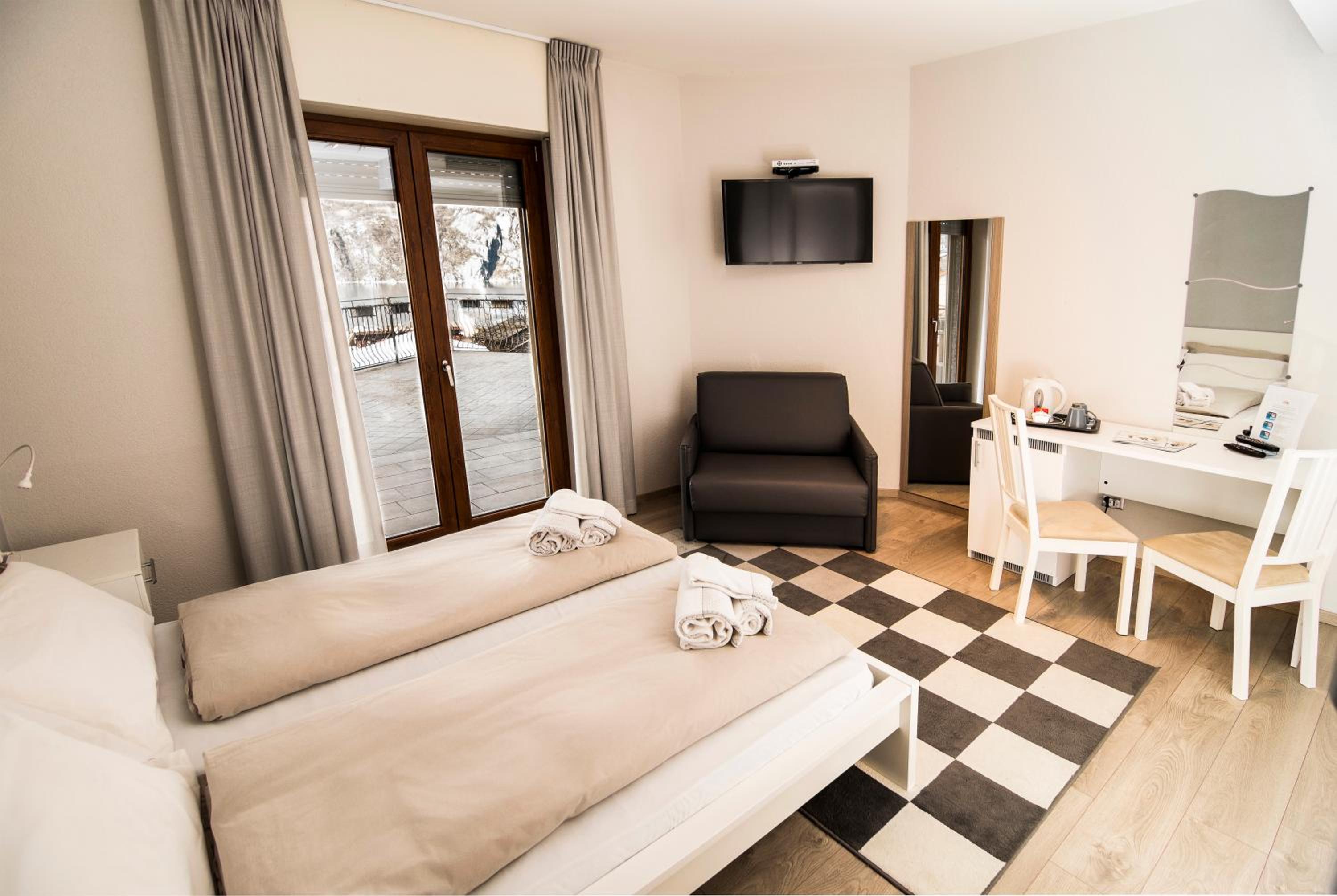 The hotel's elegant rooms feature wood floors, modern amenities such as a minibar and satellite TV, and some even offer breathtaking views of the lake or mountains. Guests can start their day with a delicious buffet breakfast, unwind with a drink on the terrace, or explore the surroundings with the convenient bike rental service.
