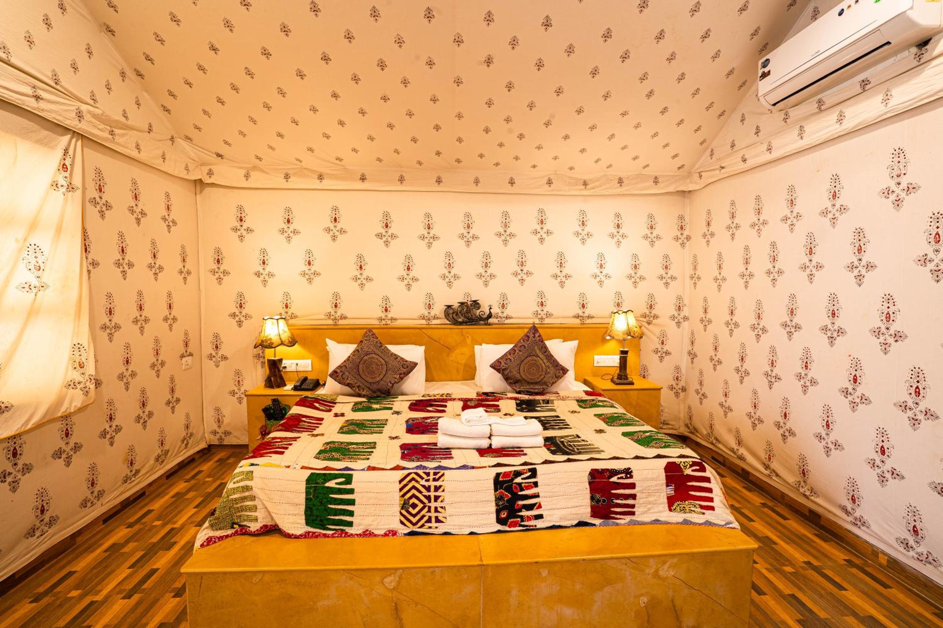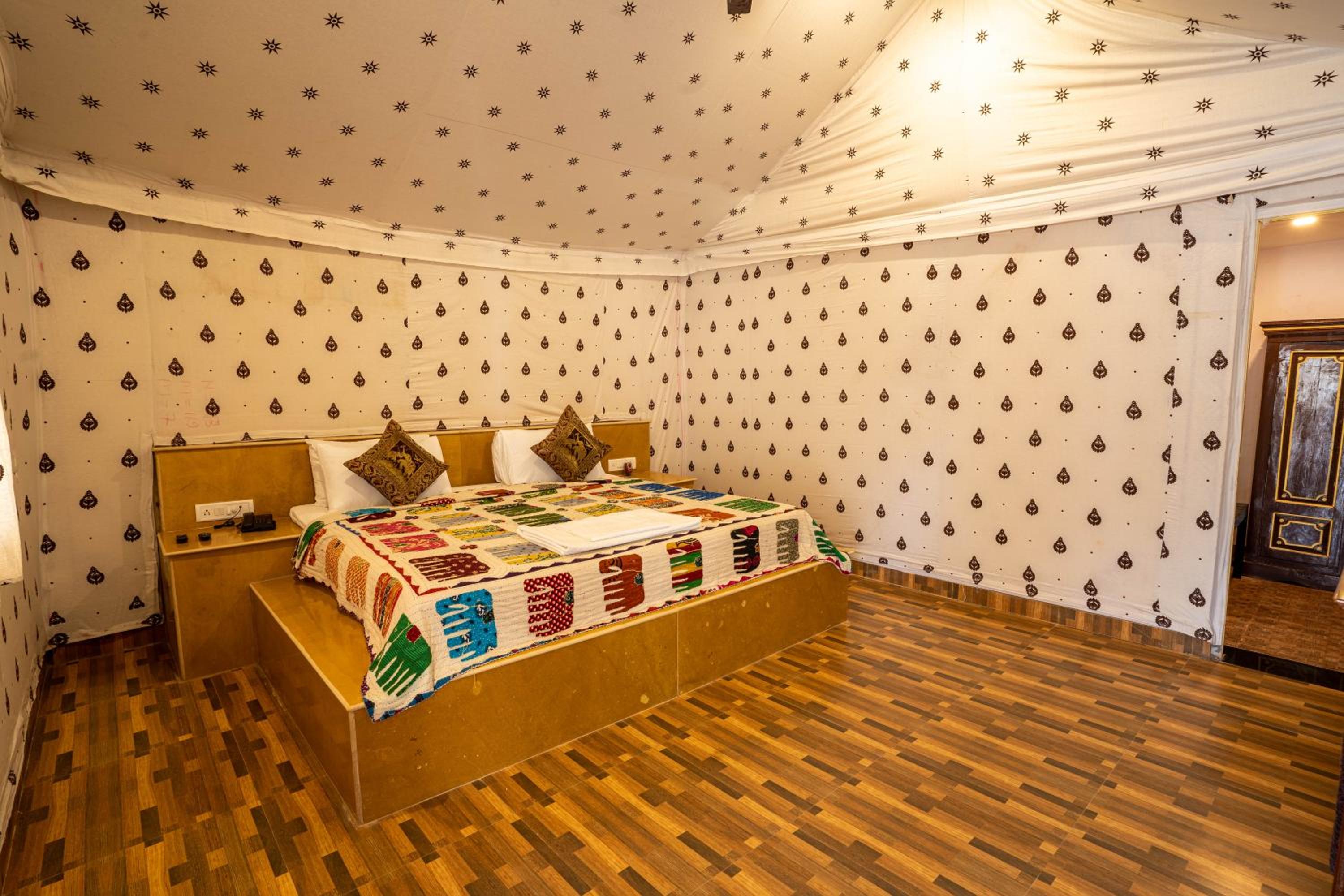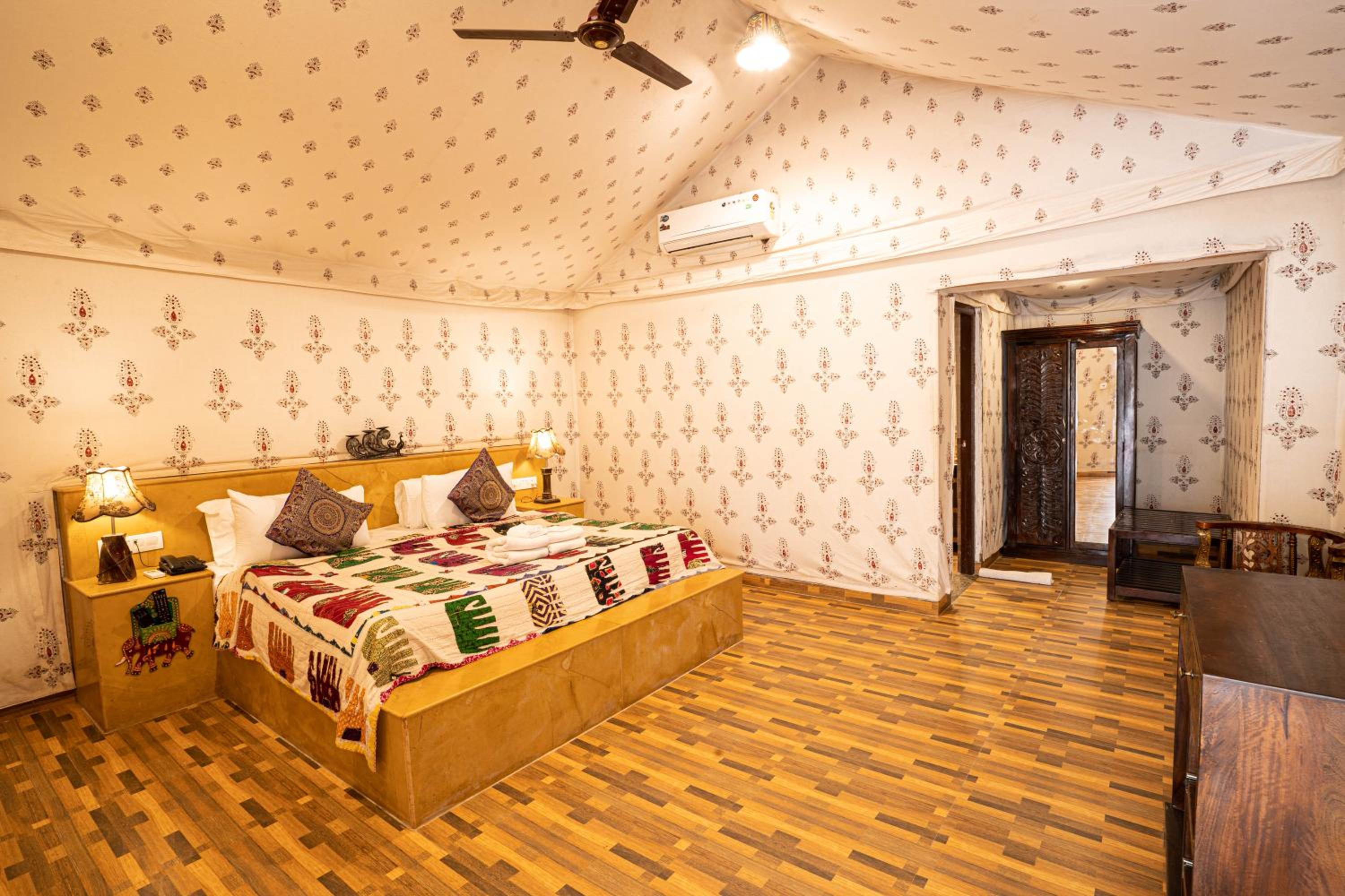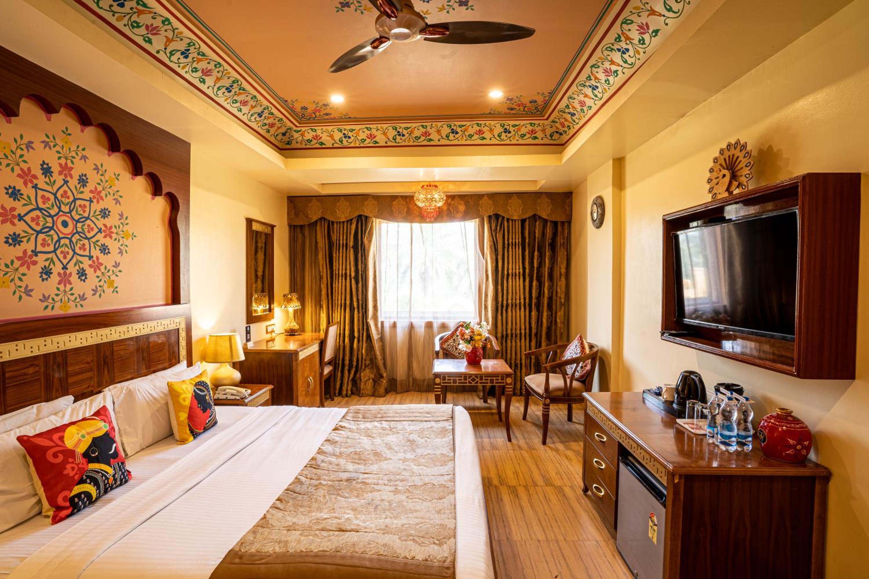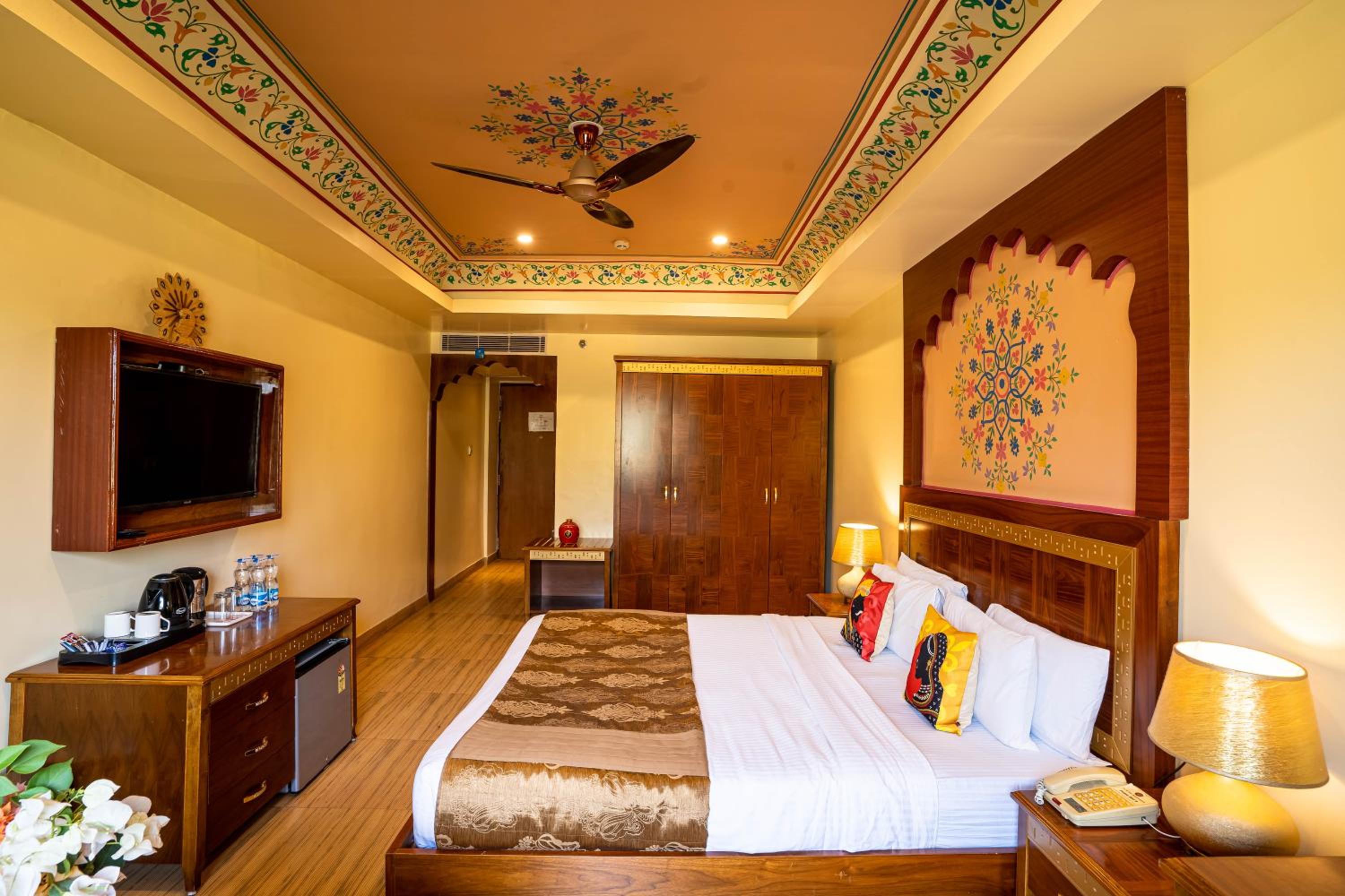 Experience the charm of spacious traditional rooms at Chokhi Dhani Palace Hotel, equipped with modern conveniences like free wired internet, cable TV, and 24-hour room service.