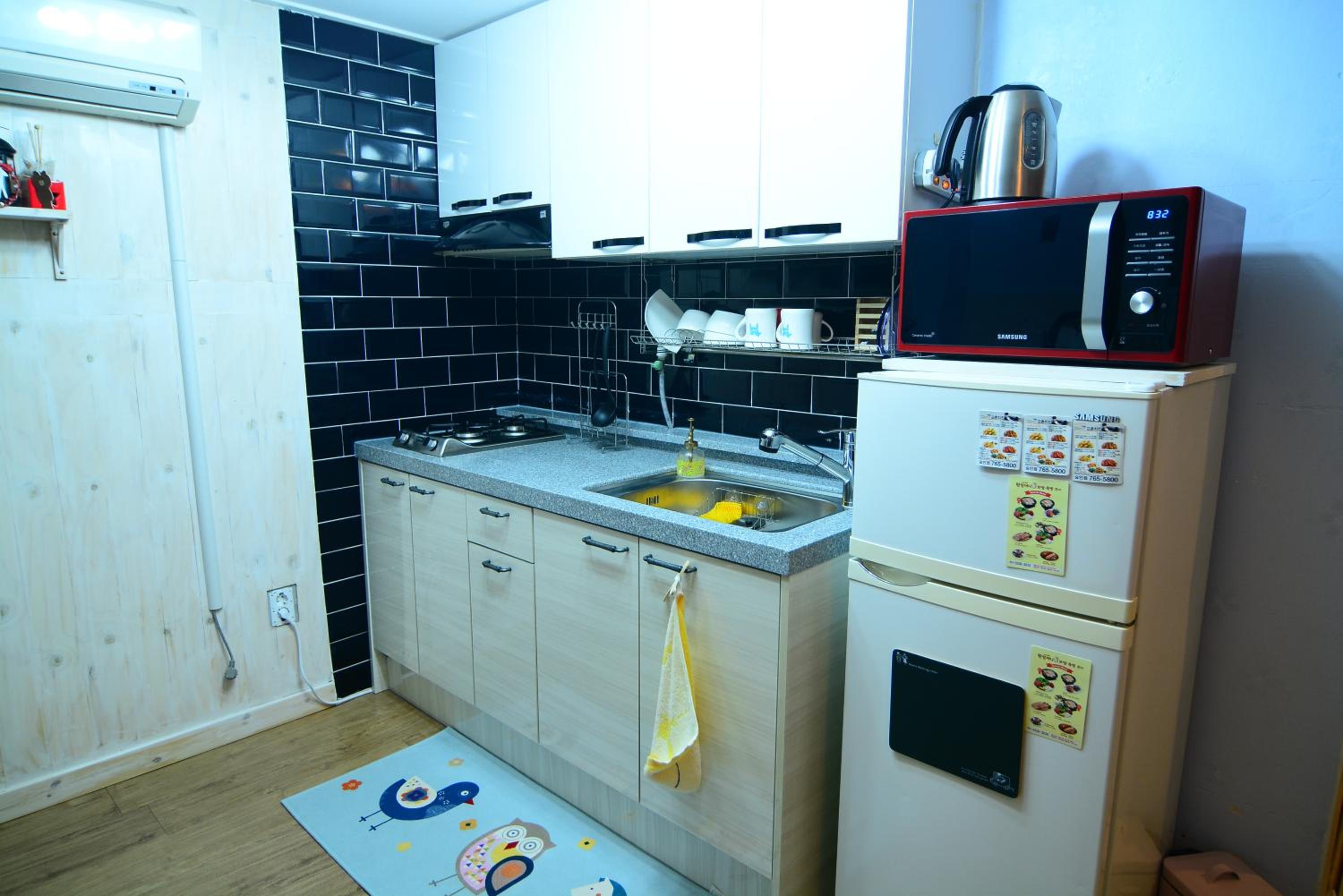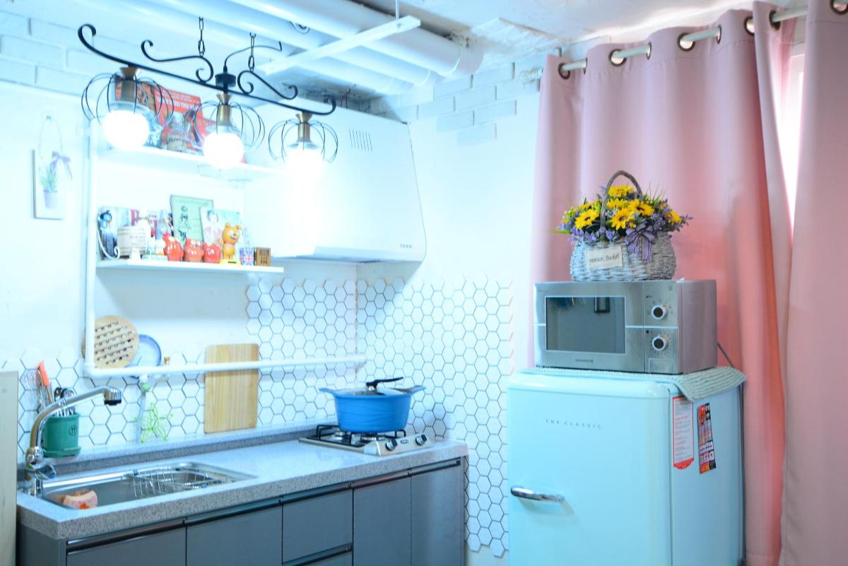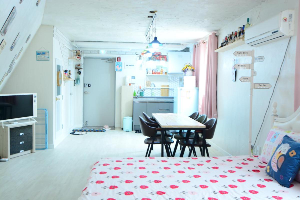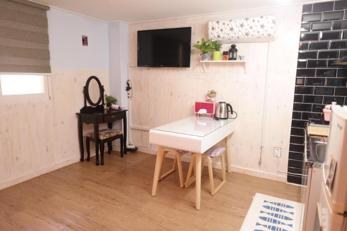 Very clean and fresh! This cute studio has everything you need (a/c, heating floors, stove, microwave, washing machine, etc). Large space enough for a couple. You can walk to the Super EMart in 2 mins, and there are plenty of cafes and restaurants around.